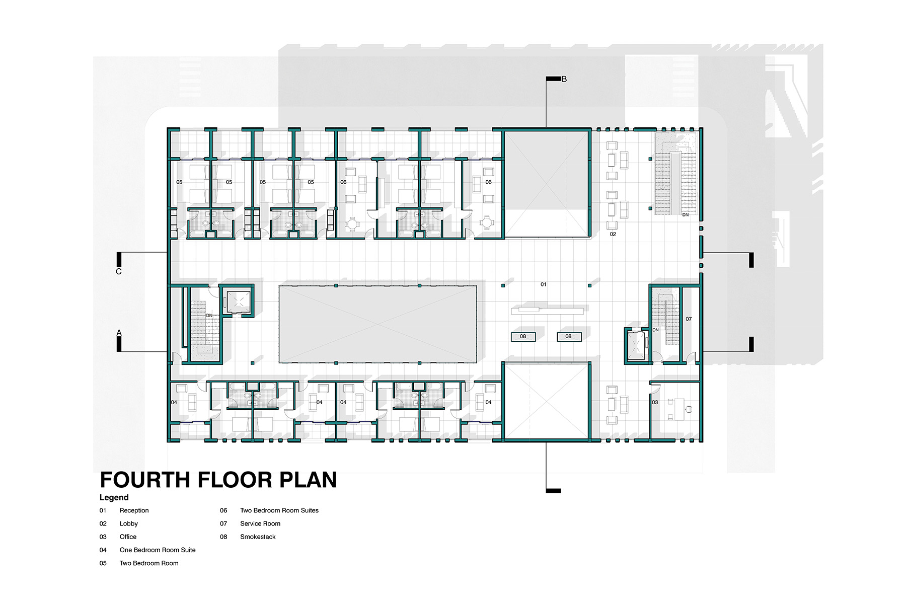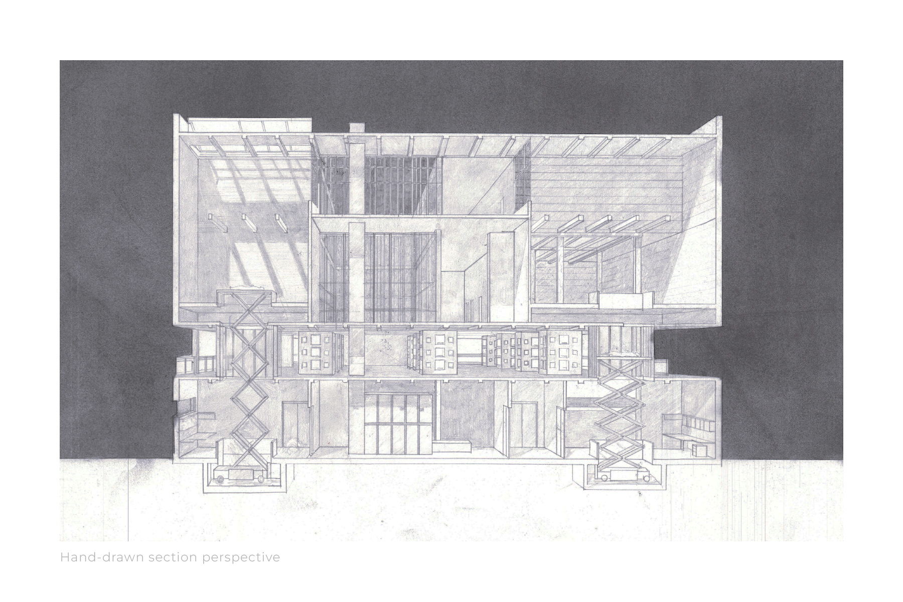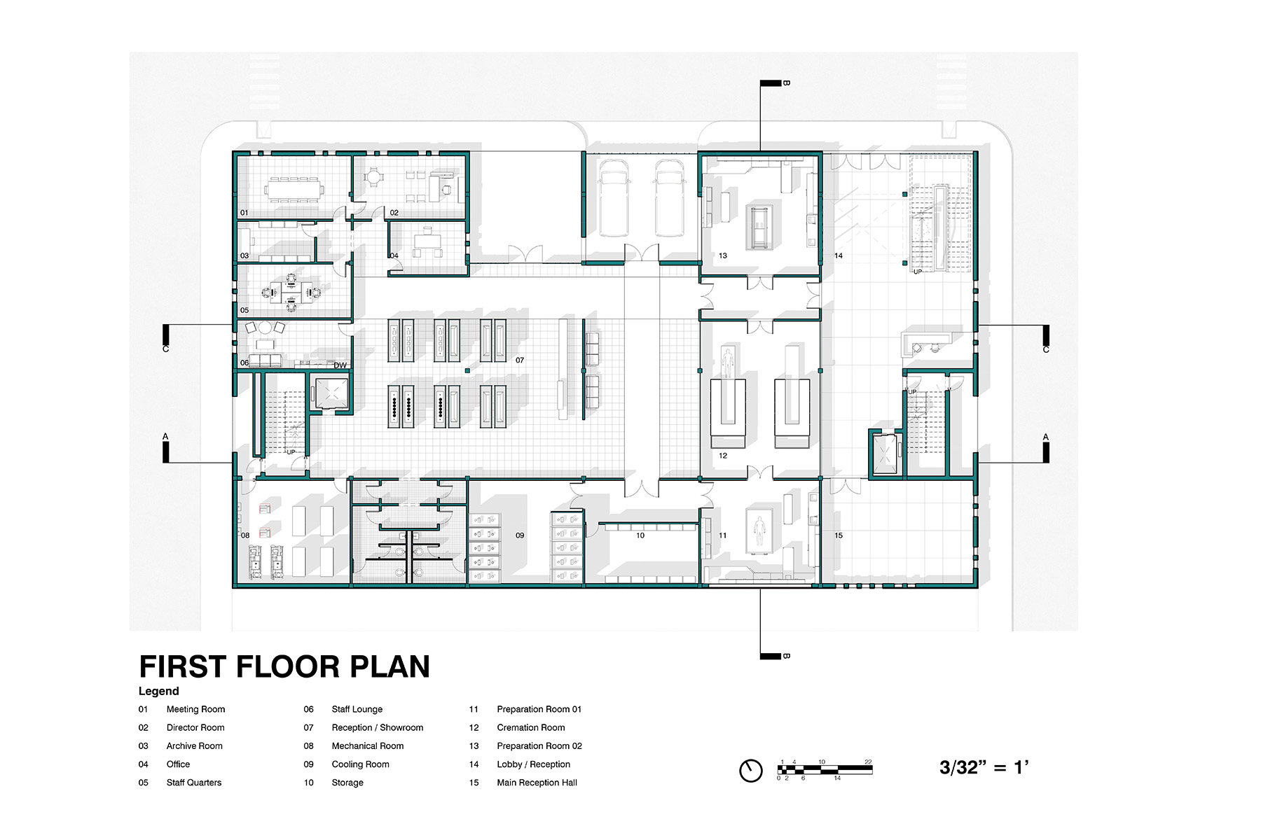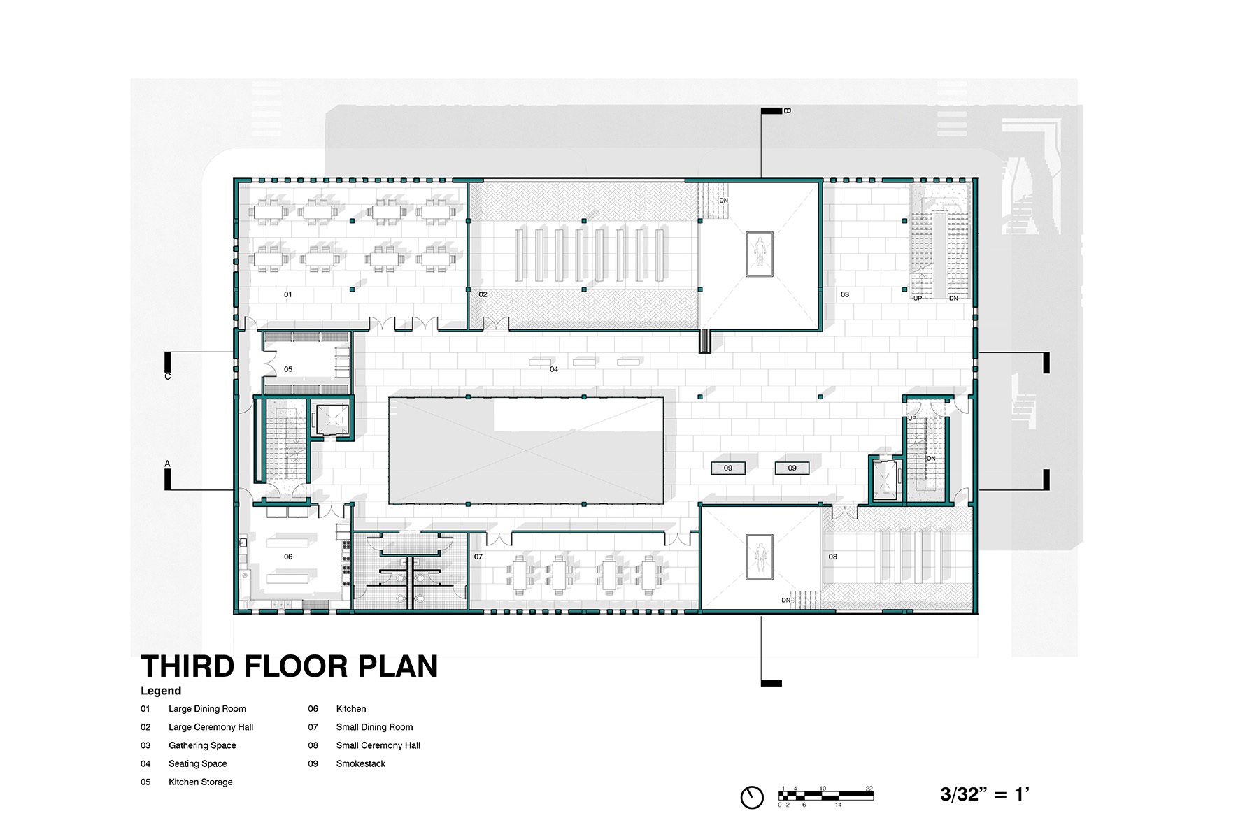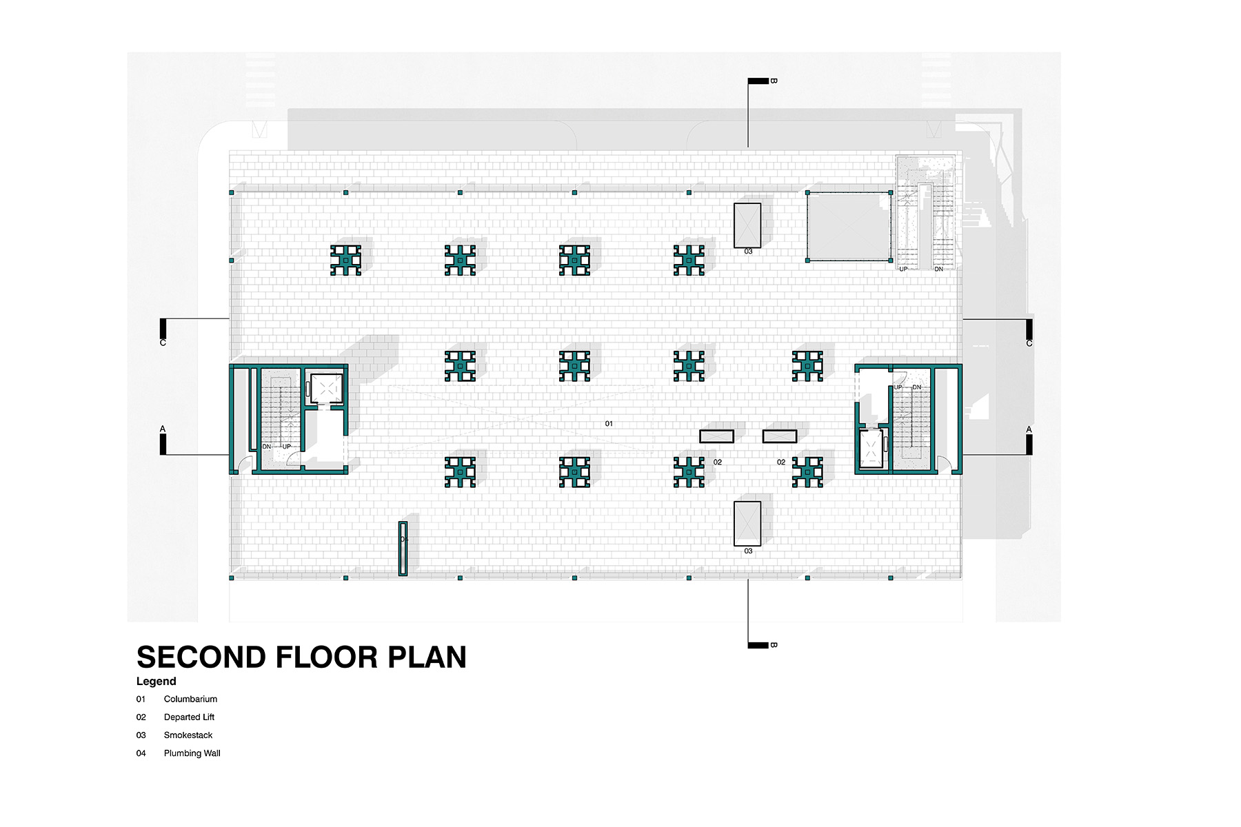 The urban crematorium includes spaces for administration, cremation, ceremonies, dining, accommodation, and a columbarium. The layout is organized by function, with the reception, cremation, and administrative areas on the first floor, the columbarium on the second floor, dining and ceremonial spaces on the third floor, and accommodation on the fourth floor. The concept centers on a gap between the ceremonial and cremation areas, joined by a bridge that creates a unique passage for the final farewell. This gap also houses the columbarium, symbolizing the connection between life and death. The design acknowledges our complex feelings about death—both distant and unavoidable—while creating a respectful place for final goodbyes.
