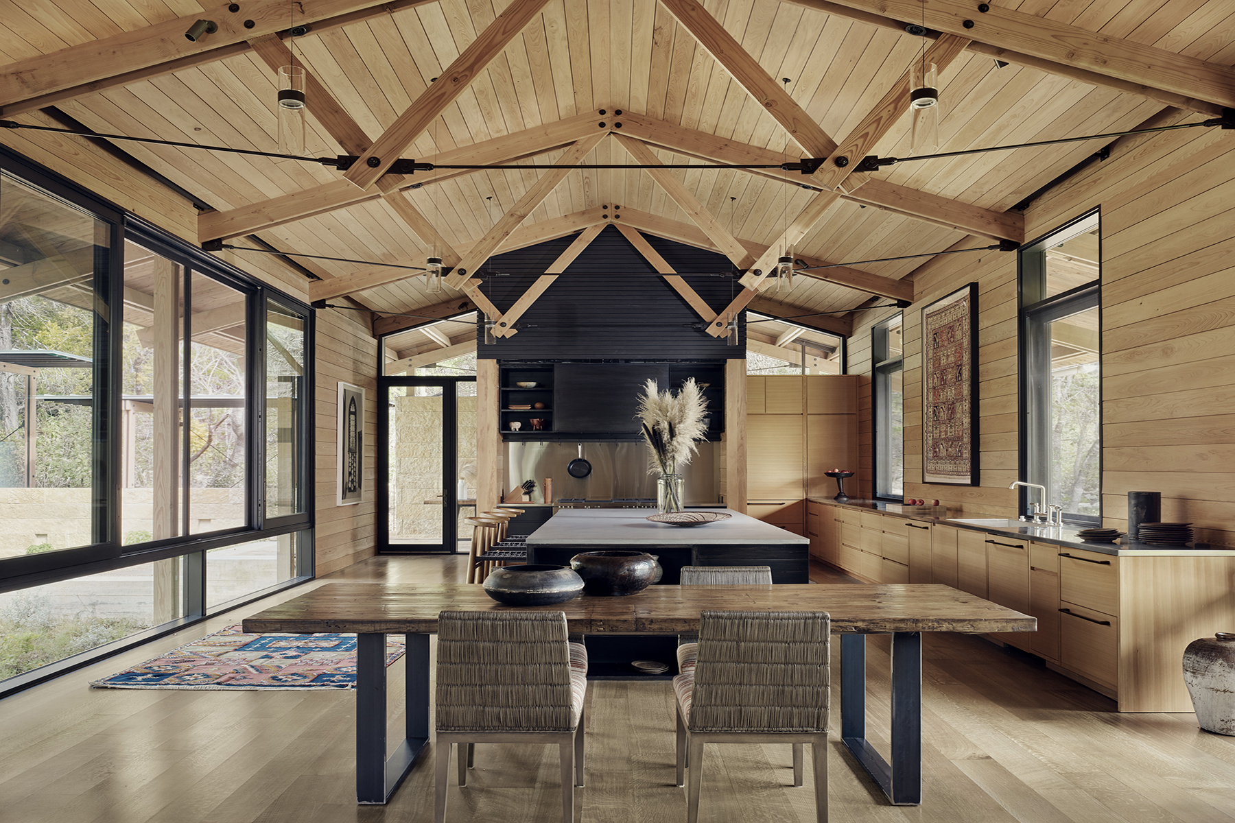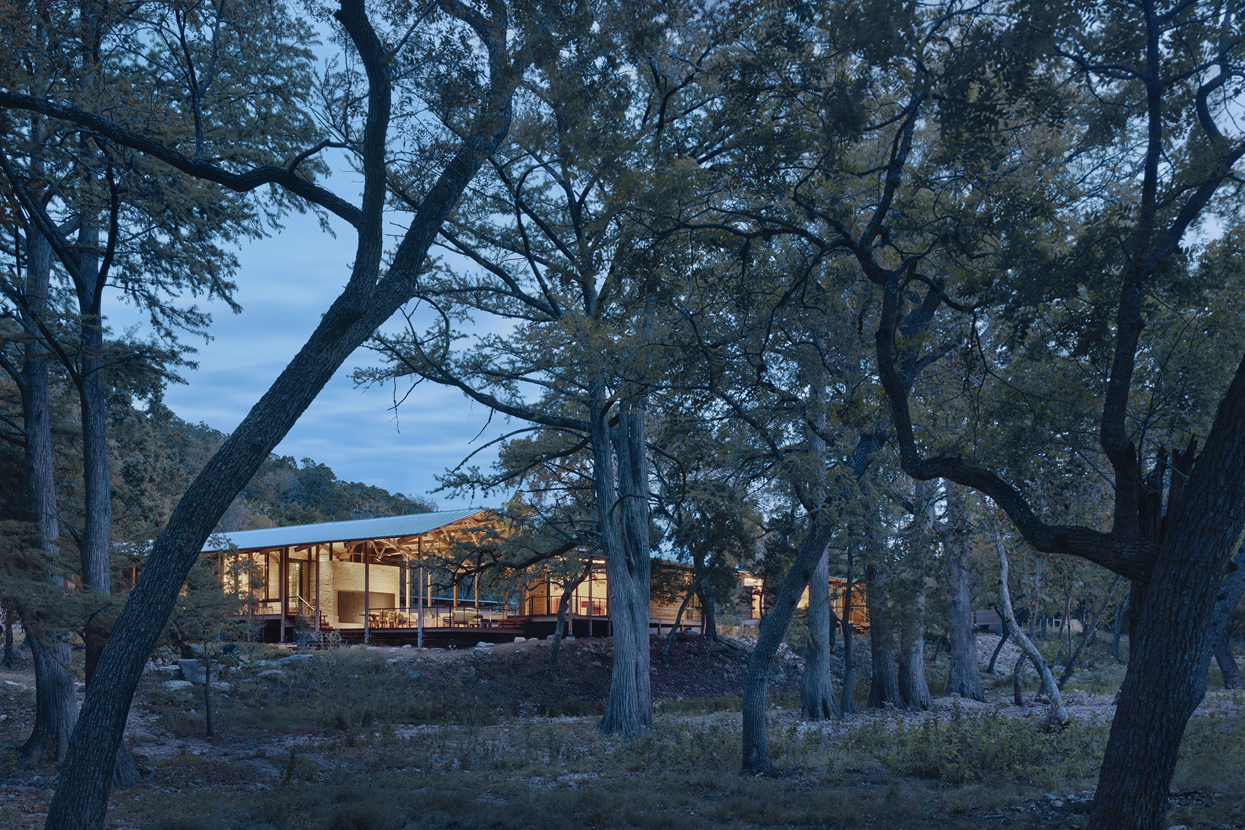 1. Tucked between the tall Cypress trees along the creek and the rocky hillside, the house maintains the experience of discovering a hidden clearing. Photo by Casey Dunn.