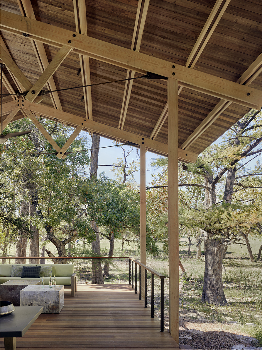 The same Cypress wood siding is used on the interiors and exteriors and will naturally weather outside. Local Lueders limestone and board-formed concrete anchor the main fireplace and the buildings partially buried in the hillside. The material palette is intentionally limited to wood, stone and concrete with metal connectors as needed. The wood frame structure remains exposed and is only infilled with wood sided walls and glass for shelter. The conditioned square footage was kept tight and is just a little over half the amount of the outdoor space.
