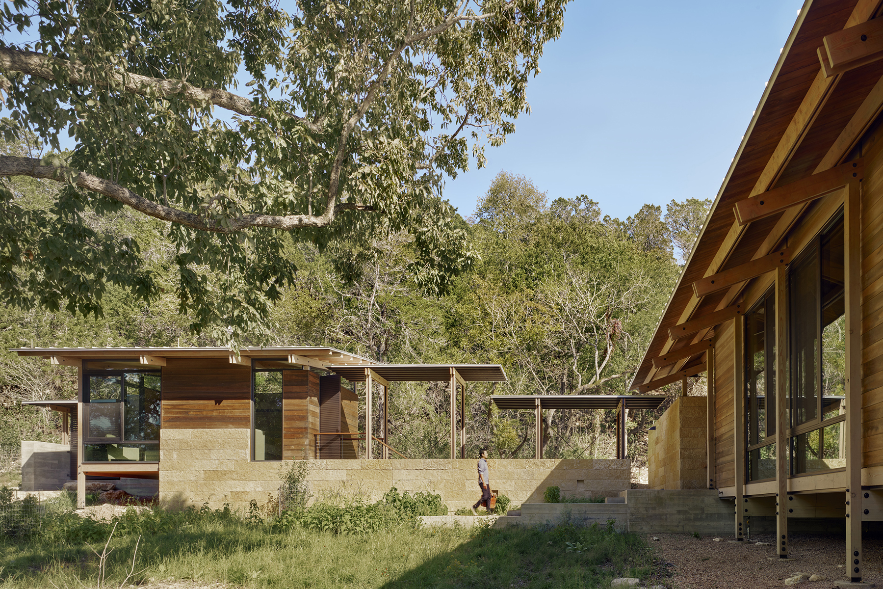 Nestled within a large creek bend, a secluded, pastoral landscape provides a perfect site for a private family retreat. Tucked between the tall Cypress trees along the creek and the rocky hillside, the house structures are pushed to the edges and spaced apart, maintaining the experience of discovering a hidden clearing. Similar to a camp experience, one travels outdoors to get from each bedroom structure to the shared living spaces. With a 12.8 kw solar array on the carport roof and two Tesla batteries, the house can sustain itself through power outages and offset its energy use.