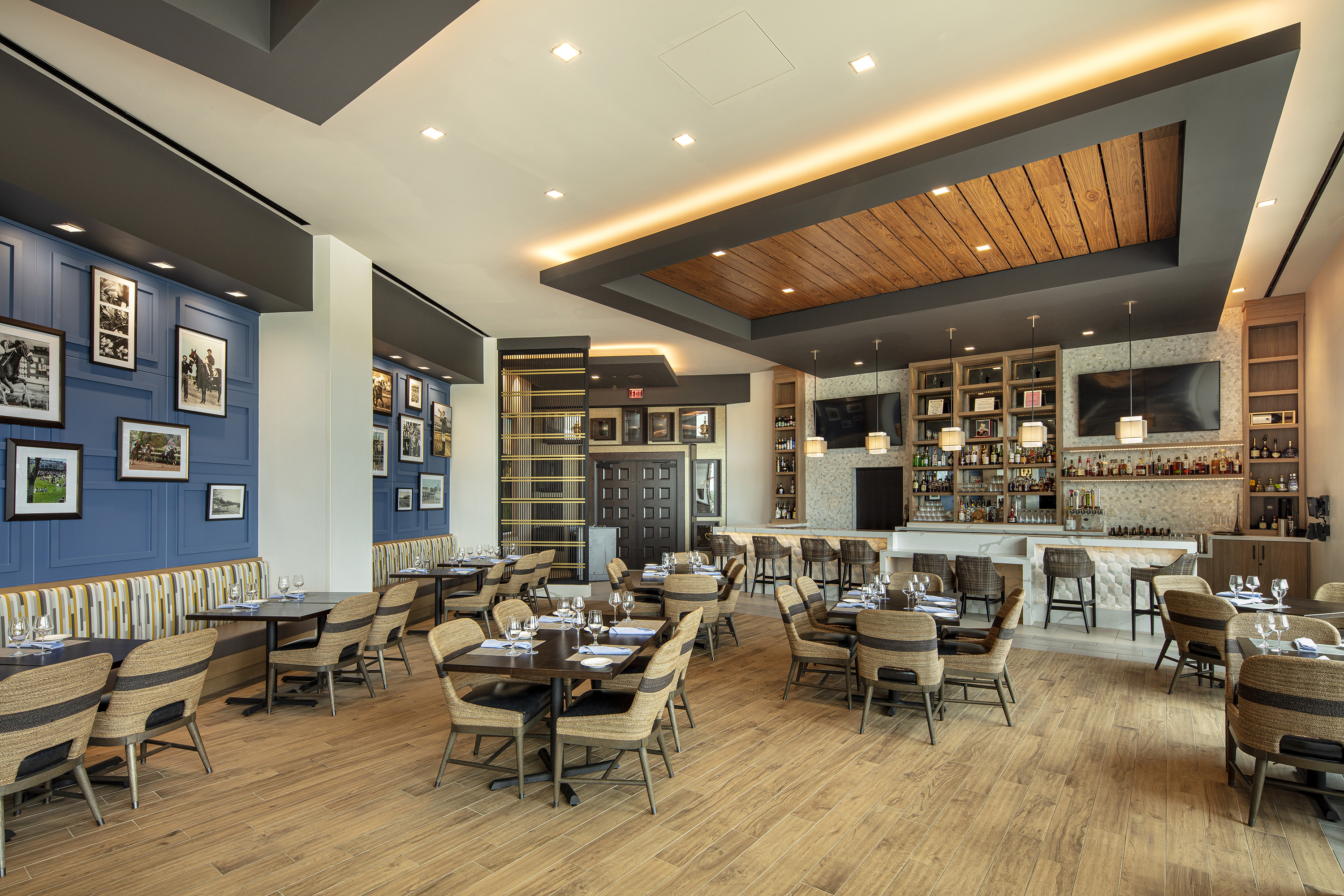 7. Inside The Bugler restaurant, visual depth is created by layering the ceiling plane with recessed wood plank inlays framed by black molding. Photo by Dero Sanford.