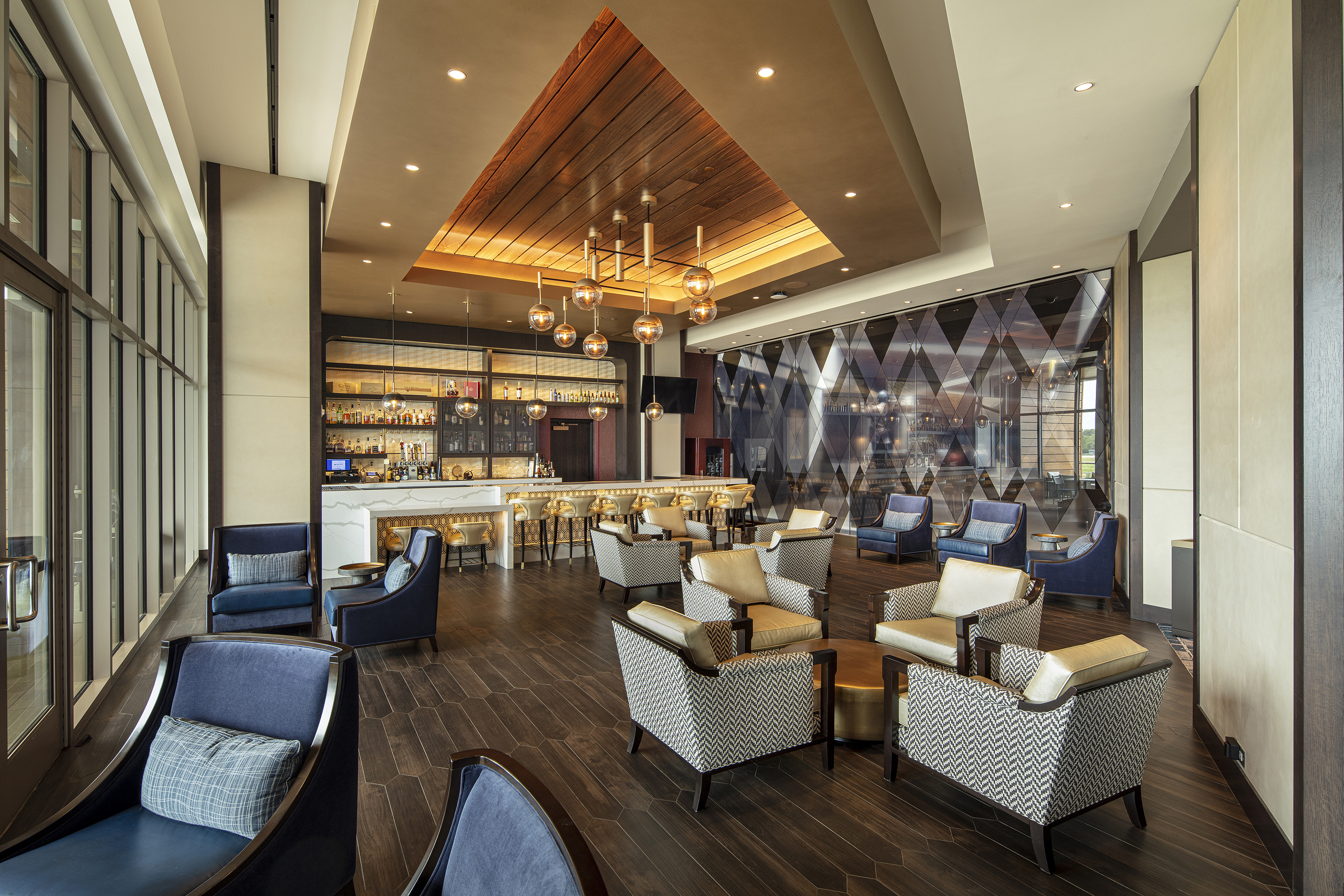 The end of the concourse is marked with a bronzed track bugler statue, which greets patrons at The Bugler restaurant. Inside, visual depth is created by layering the ceiling plane with recessed wood plank inlays framed by black molding. A continuation of neutrals and blue tones, natural seagrass textured furnishings, black and gold metallic screening and a gallery wall of framed historic Hot Springs and Oaklawn imagery create a relaxed, polished backdrop for incredible views of the racetrack through a full glass curtainwall.