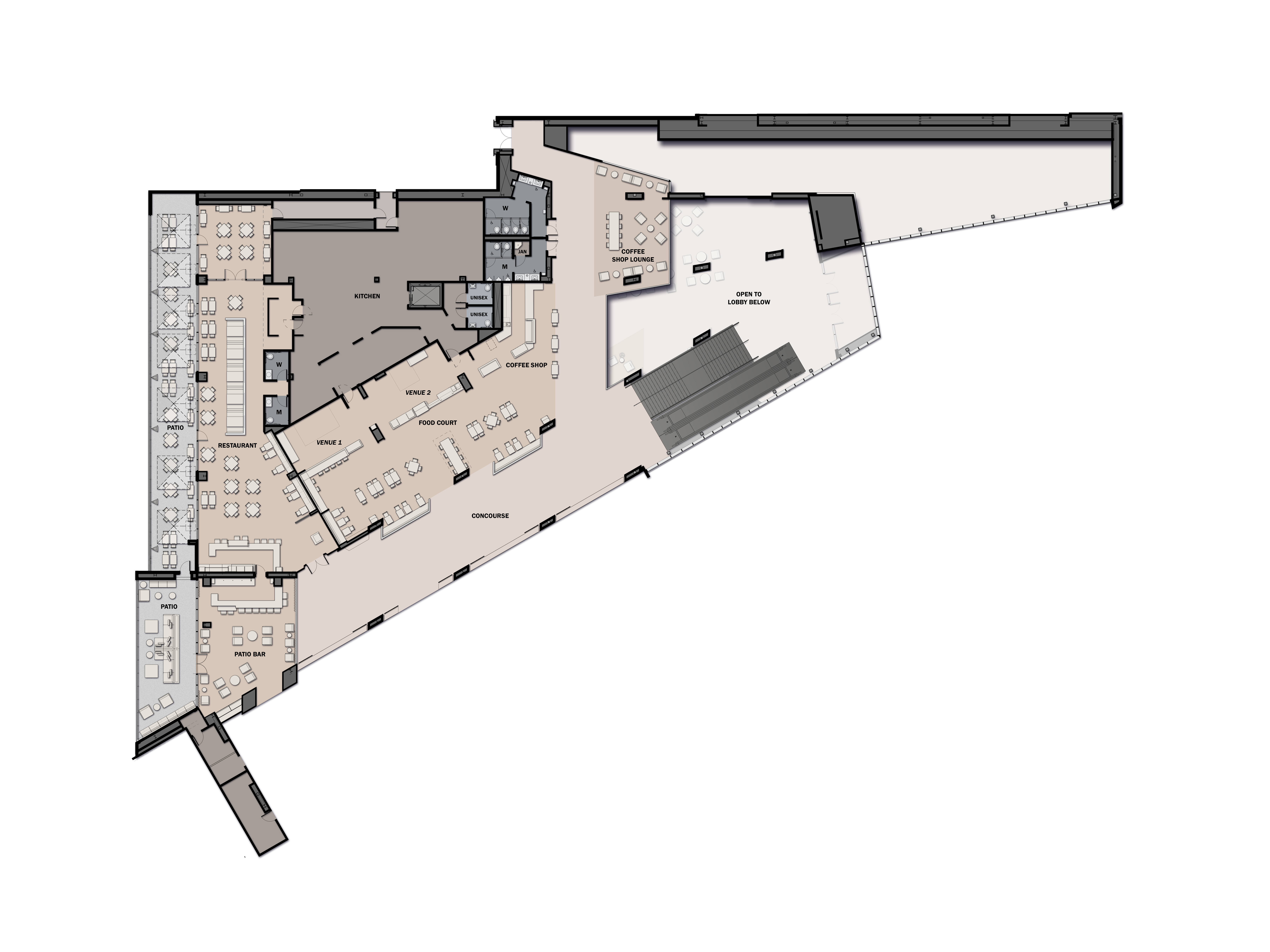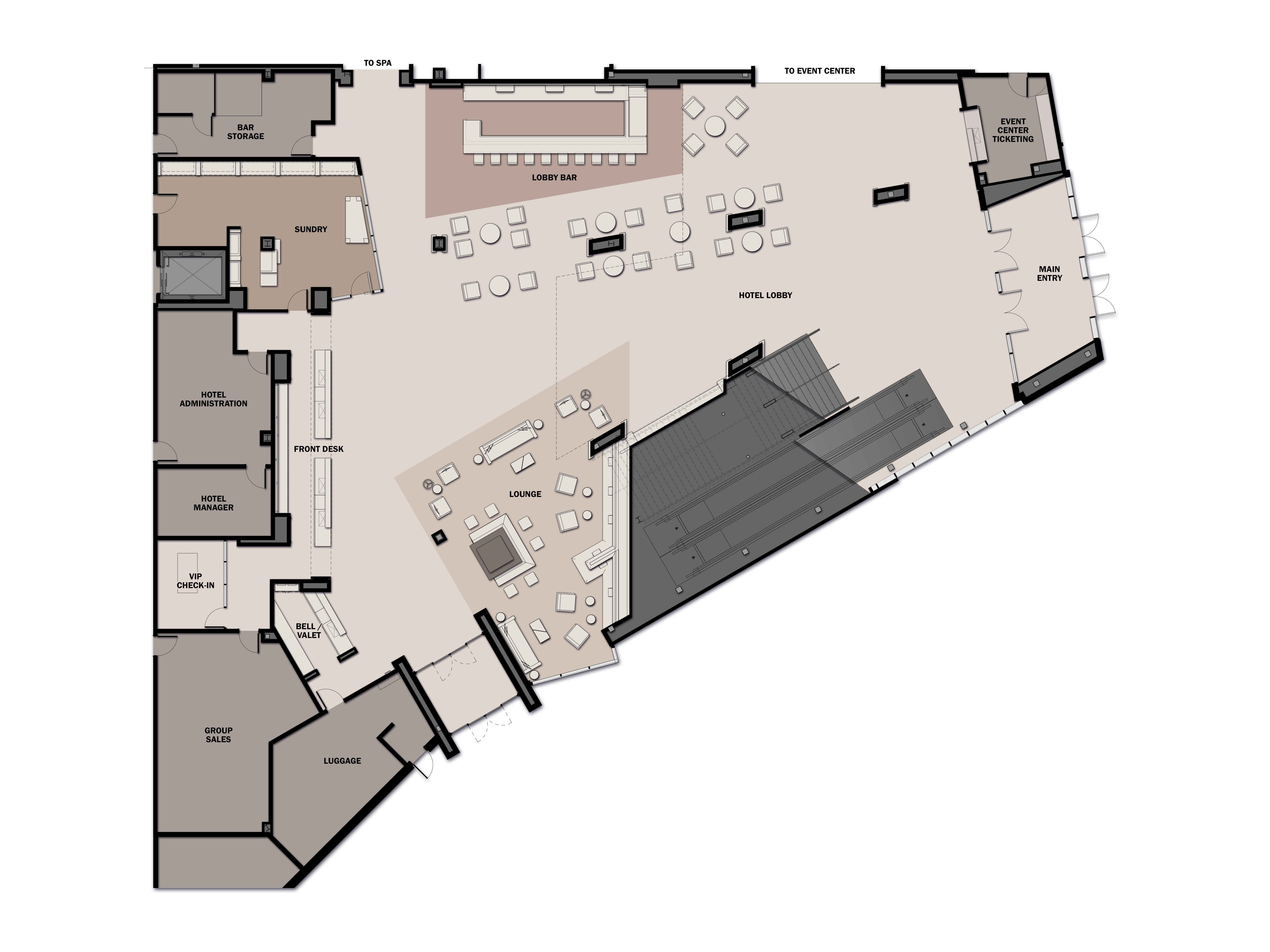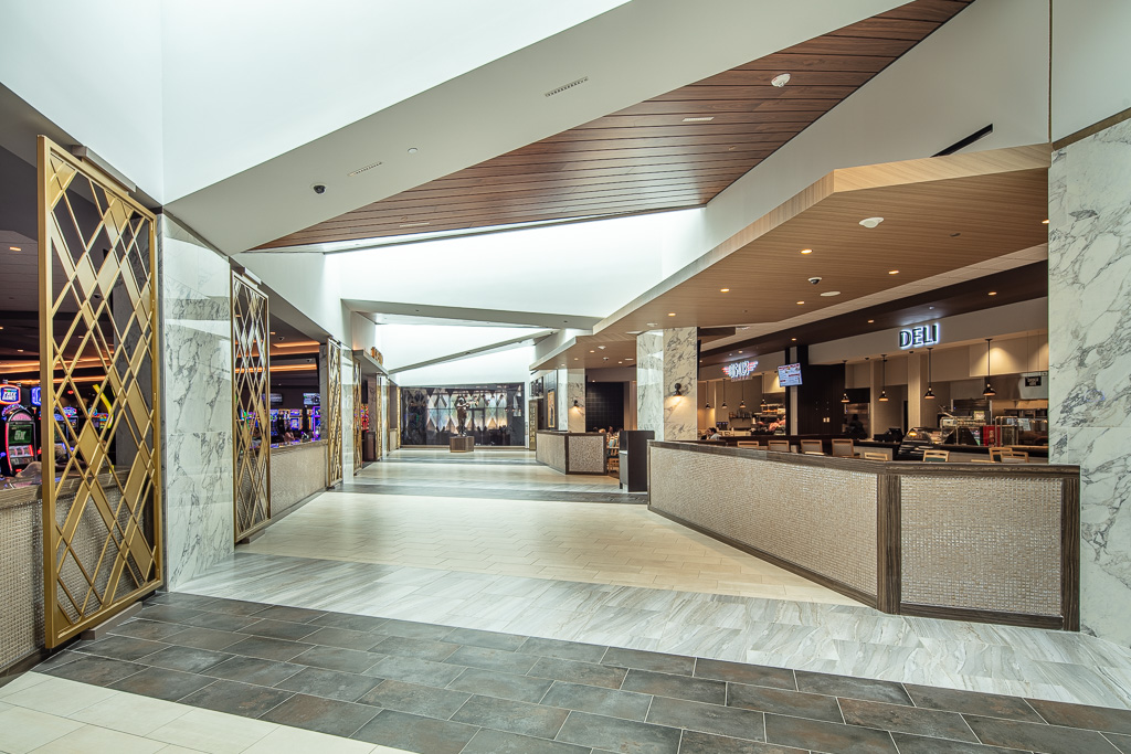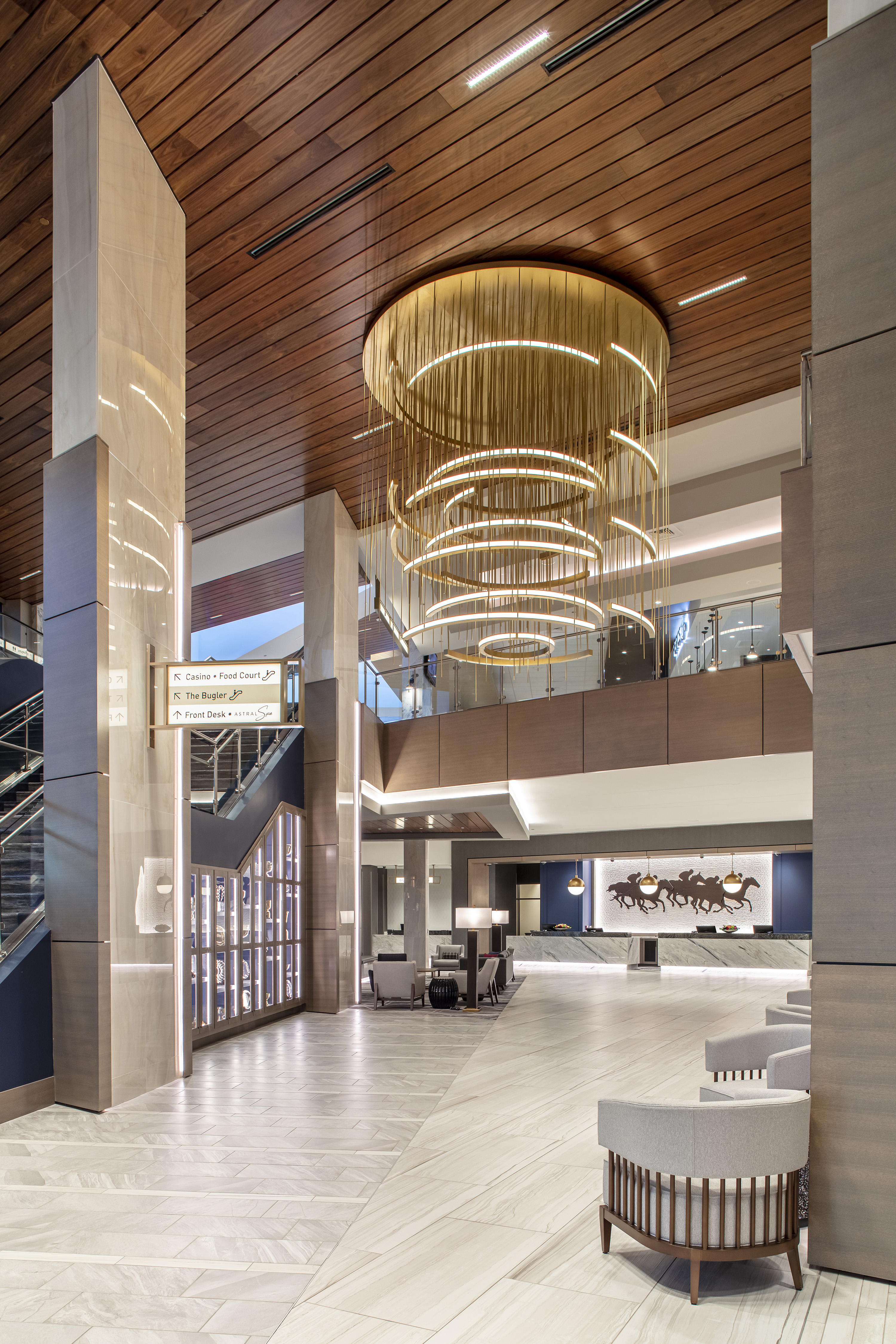 Ascending to the second level main concourse, guests enter the four volumes of the property: the casino, food and beverage venues, the event center and hotel. The distinctive slanted, angular skylight and ceiling pattern conveys a continuous movement of light and shadow through the concourse, recalling the motion of galloping horses.