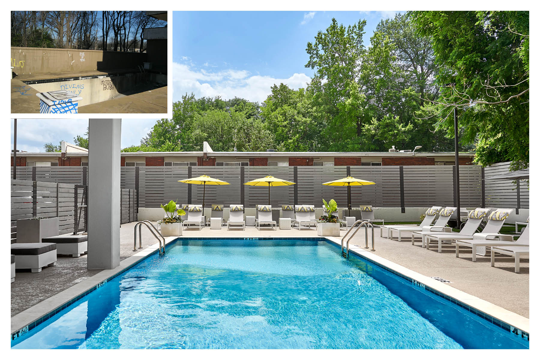 An existing two-level below grade basement parking structure has a footprint that extends over the entire site area, limiting site and grading design options. Garage car and pedestrian access was improved to provide for new pedestrian access from the public street to the building entry. The garage structure was stabilized, and new elevators and stair circulation provide direct secure access from the garage floors into each floor of the tower. Also sitting over the basement garage, the existing hotel pool, with its classic mid-century vibe was restored at the ground- floor plaza.