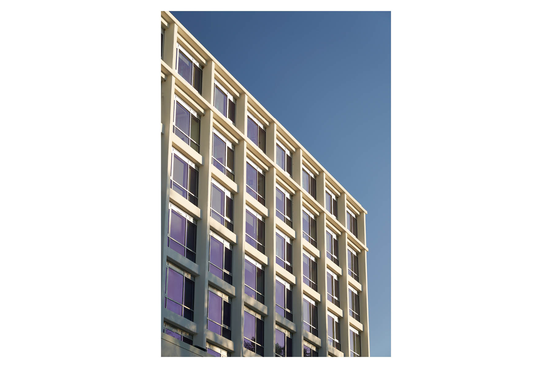 Throughout the interior and exterior of the existing building, the elegant concrete structure is allowed to speak with clarity. A new simplified color palette grounds the structure and allows its subtle detailing to take center stage as sunlight creates a dynamic play of light and shadow throughout the day.