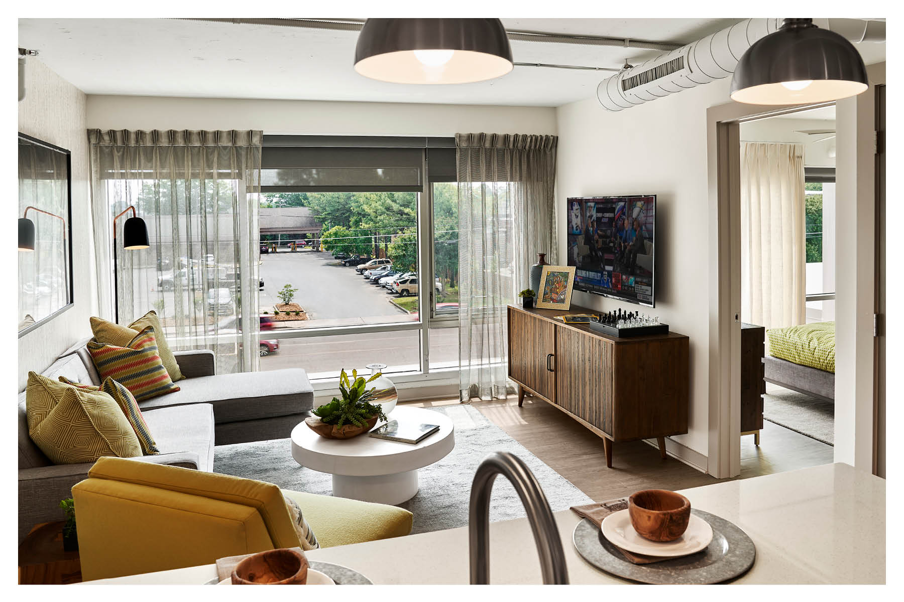 To meet the challenge of the existing building’s low floor to floor heights, the concrete structure was left open, exposed MEP systems were used to maintain vertical ceiling height, and new floor to ceiling windows were utilized to offset the low clearance and create a sense of expansive views from the residences.