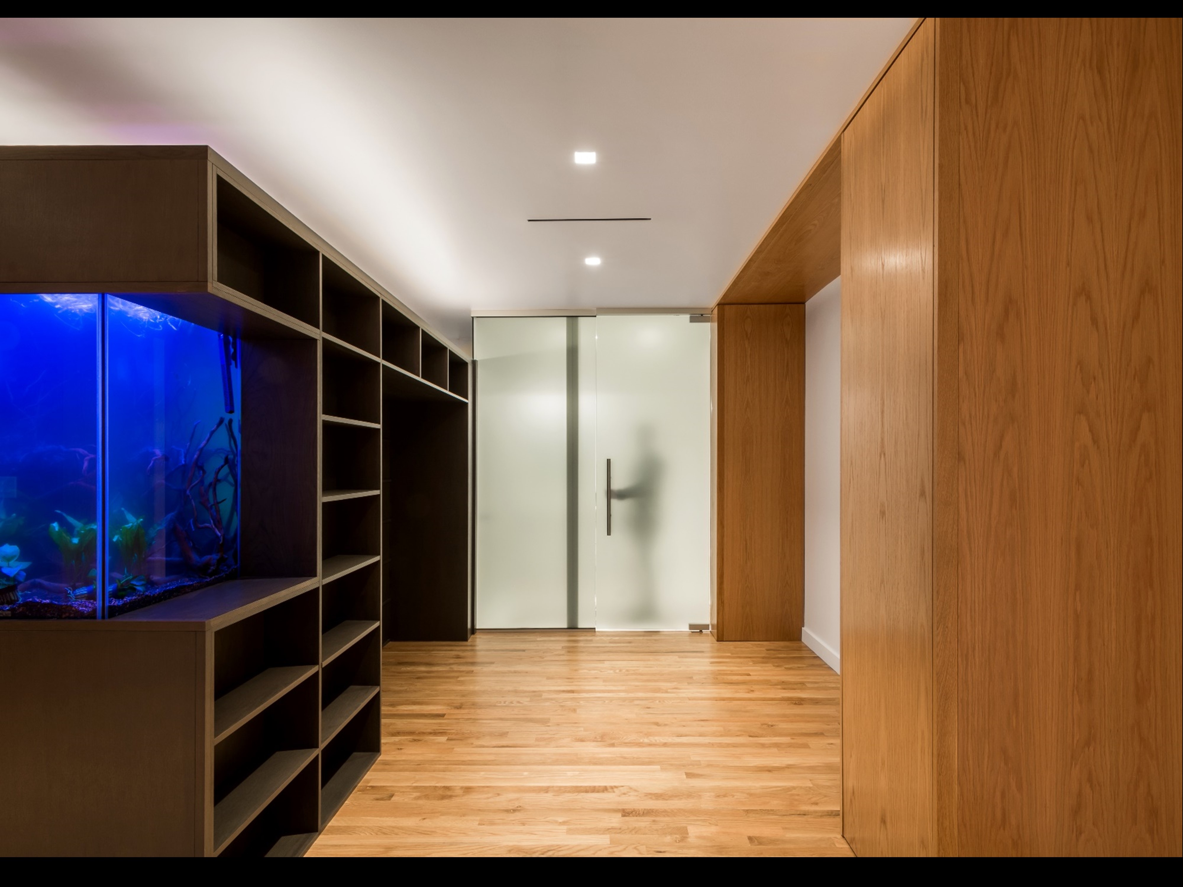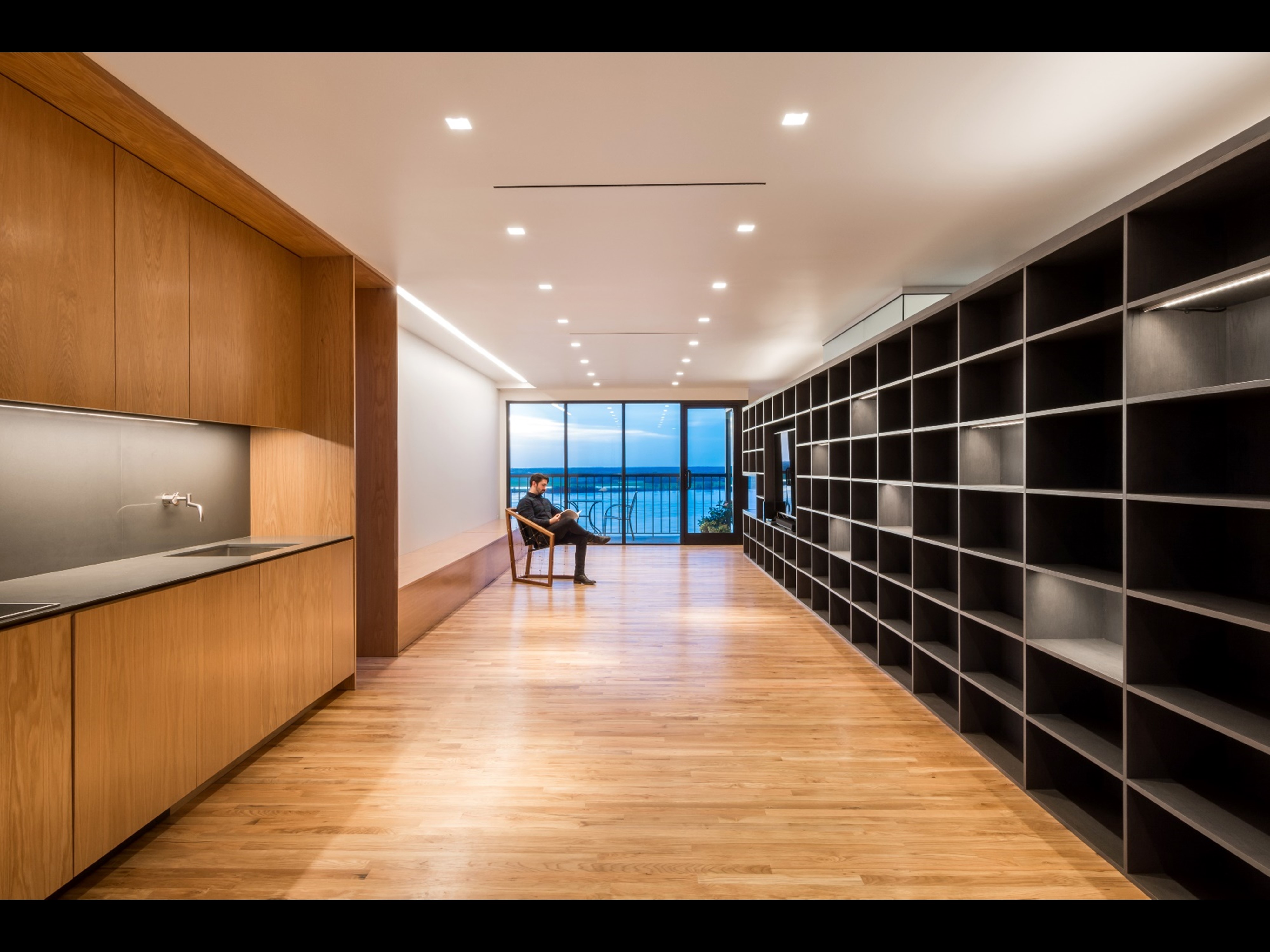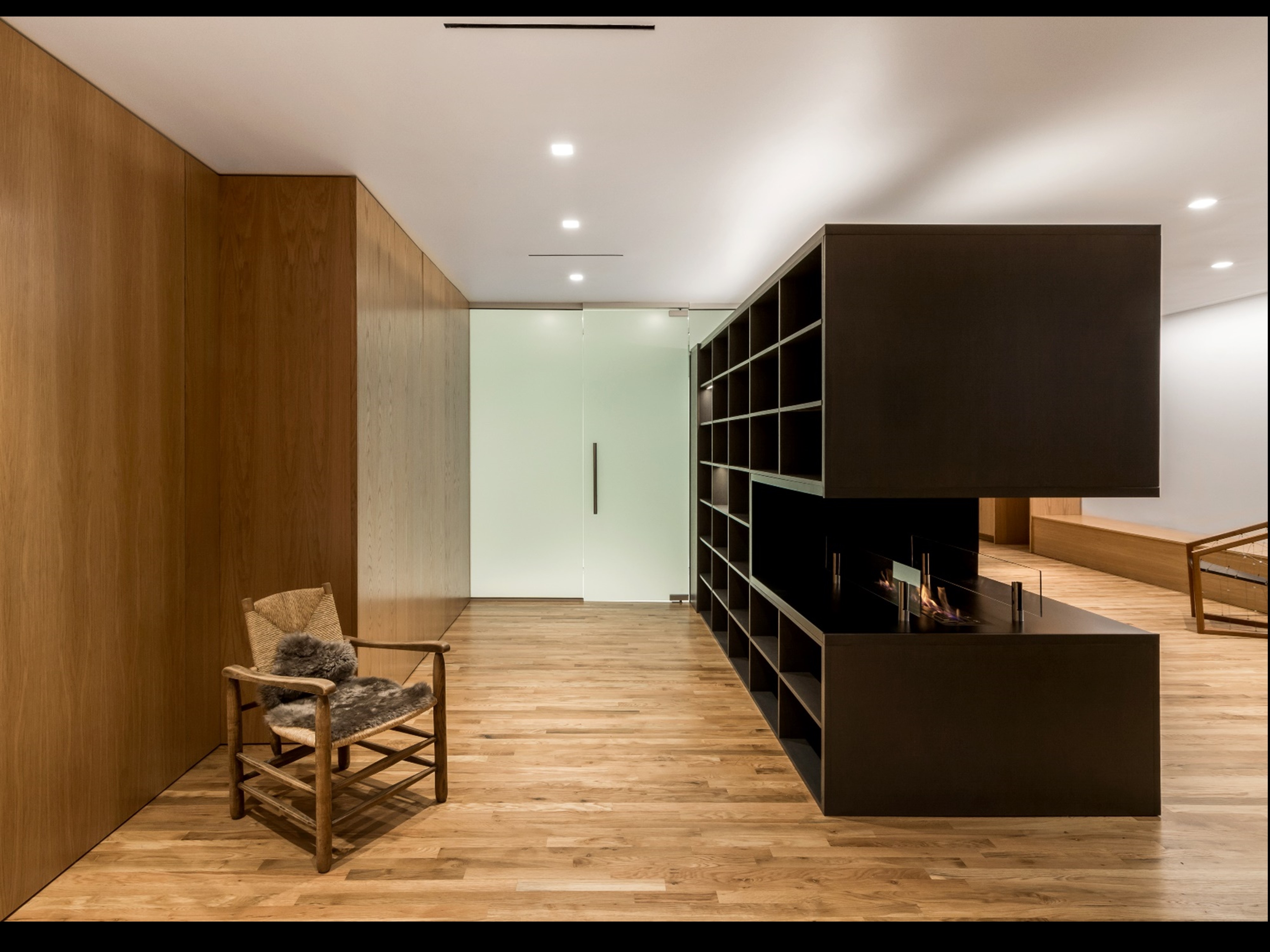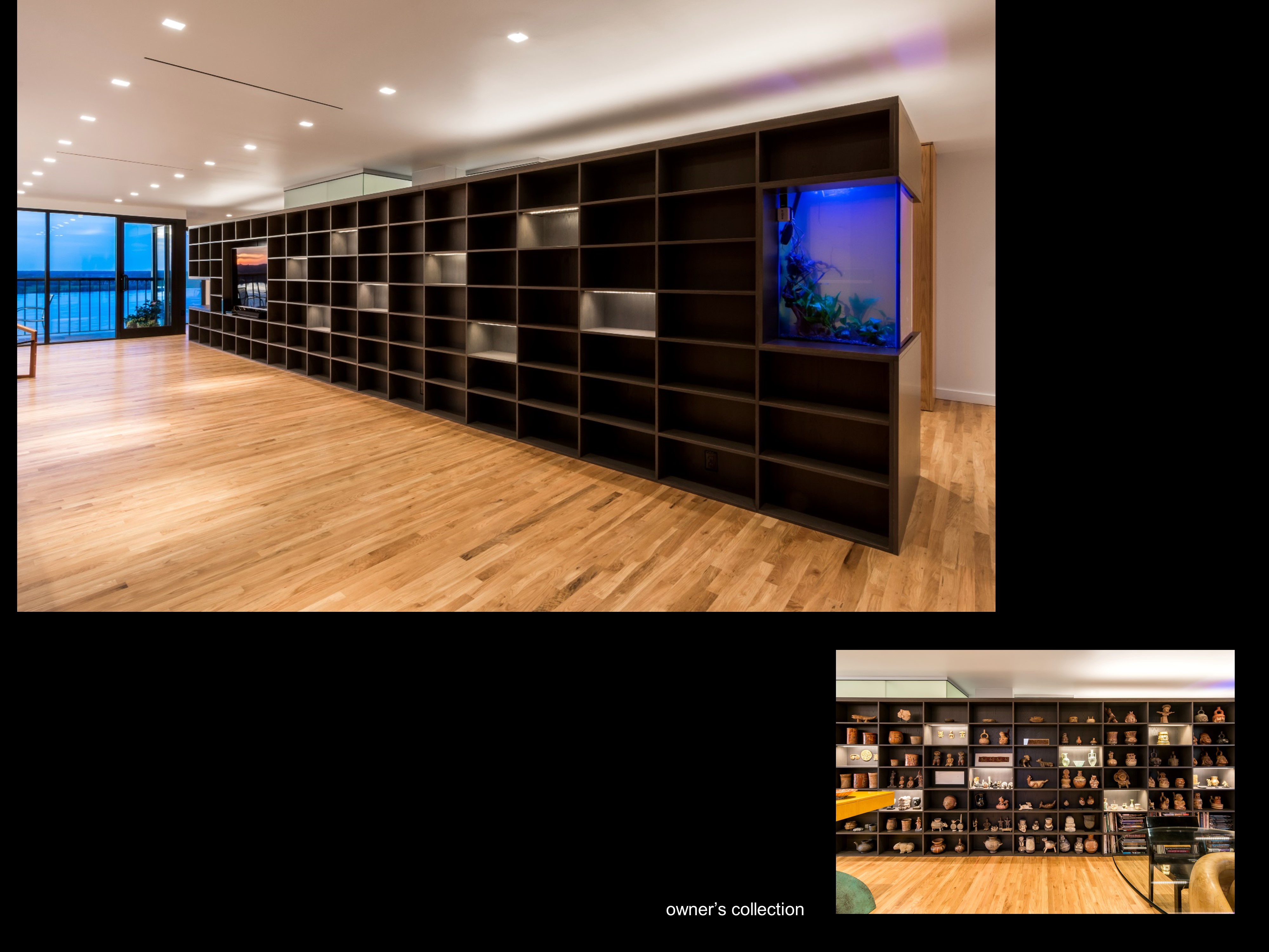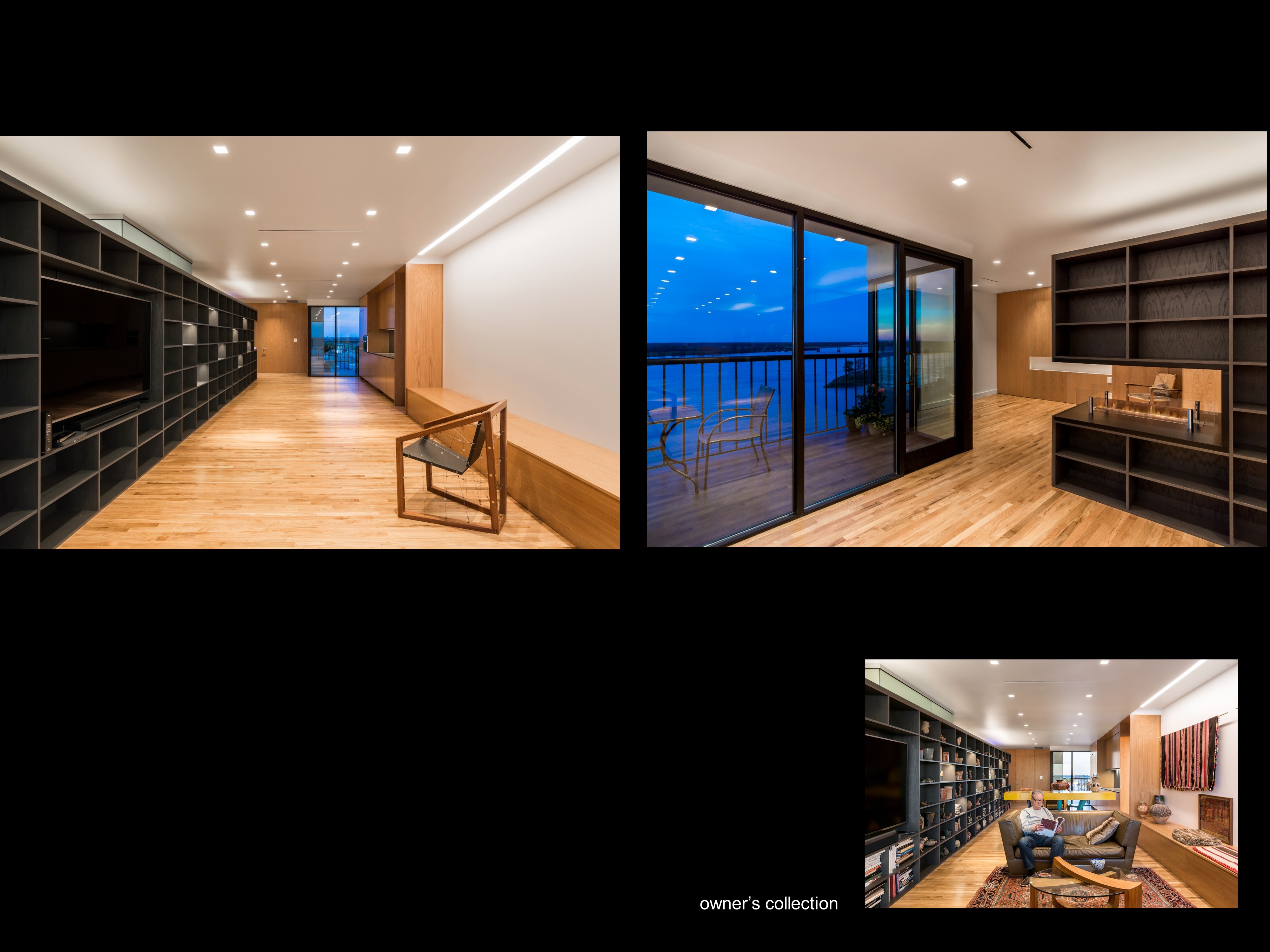 Three elements organize the 1,500 SF dwelling. The primary element is a charcoal stained oak veneer monolith of shelving, used to divide the space about the long axis, while also displaying the smaller artifacts within the art collection. This monolith is capped on one end by a fireplace and the other a fish tank. A cradle of lighter, contrasting oak veneer holds the space, wrapping up three of the four perimeter walls. This wooden cradle translates into an art viewing bench, the kitchen millwork, storage spaces for the office and bedroom, and built-in furniture. The restrooms are contained within a glass box, minimally impacting the directionality of the gallery/dwelling.