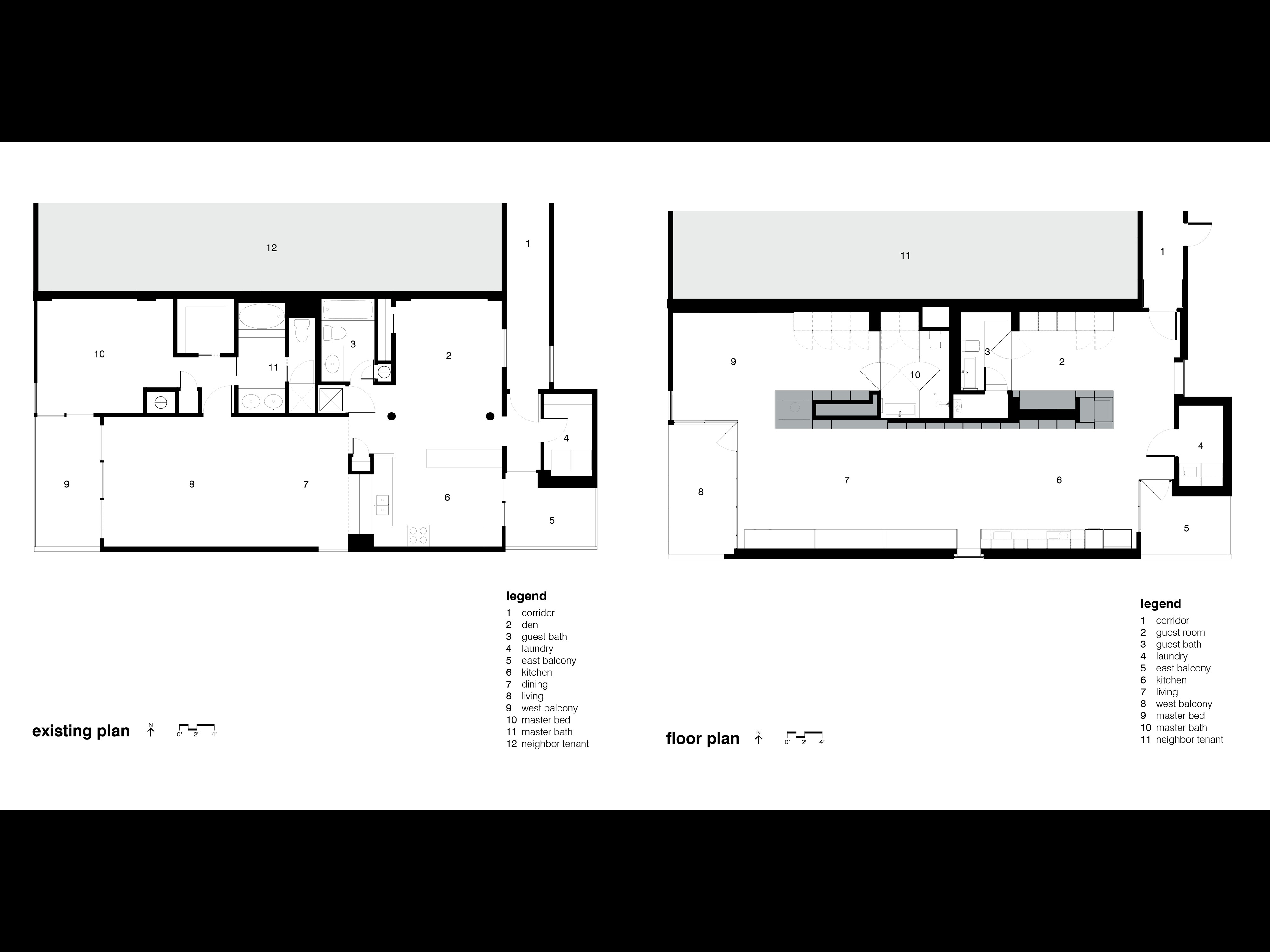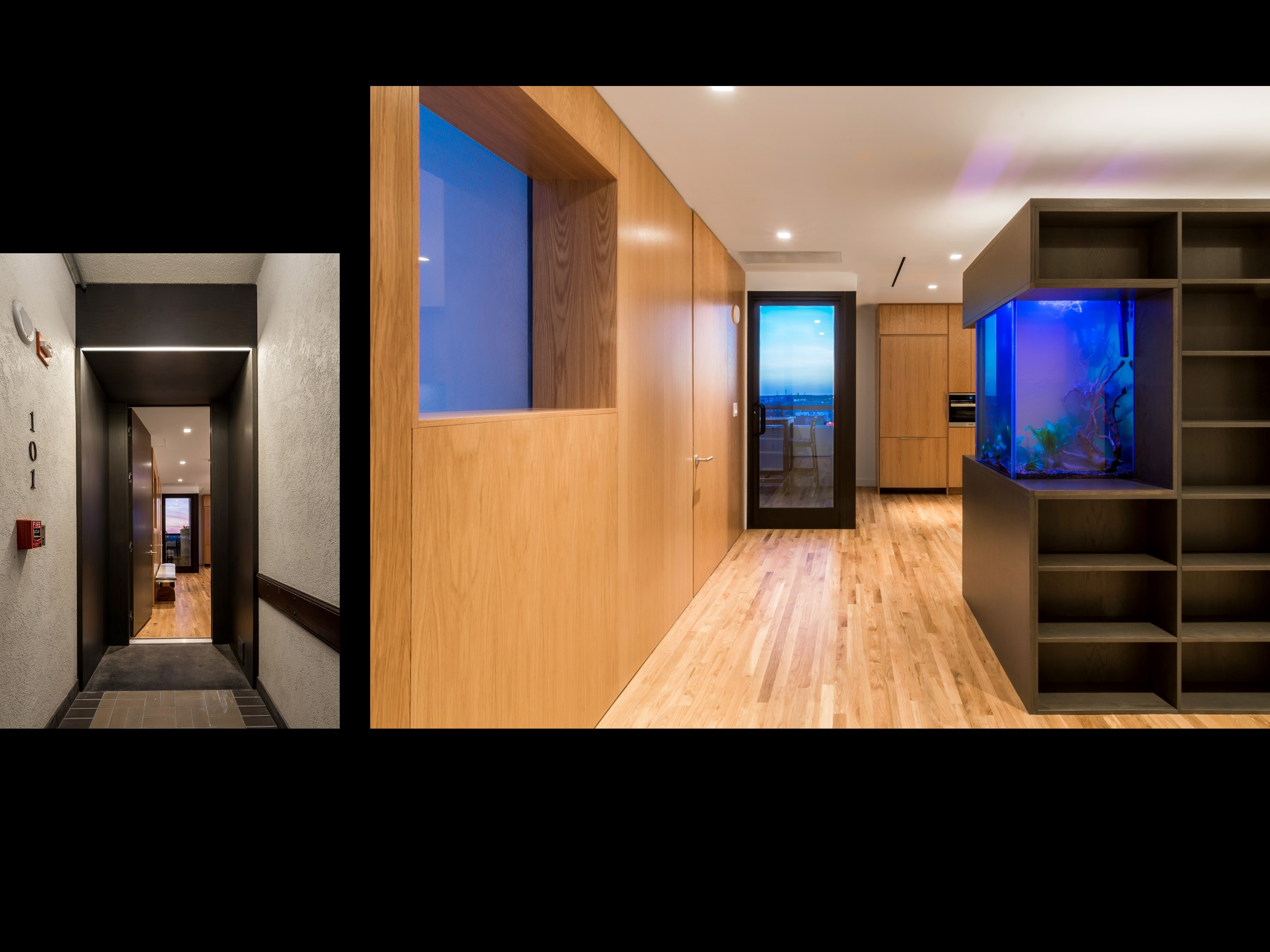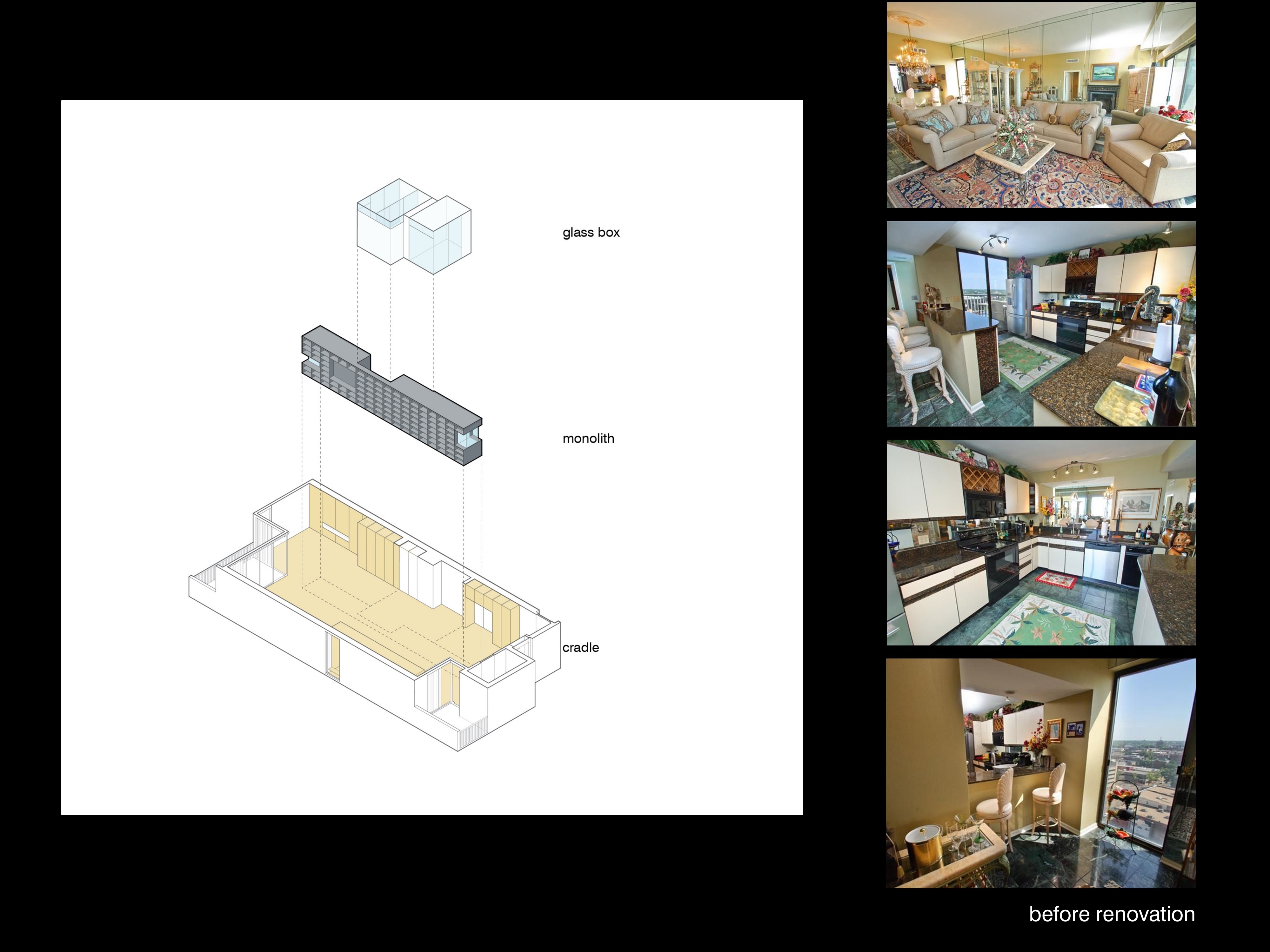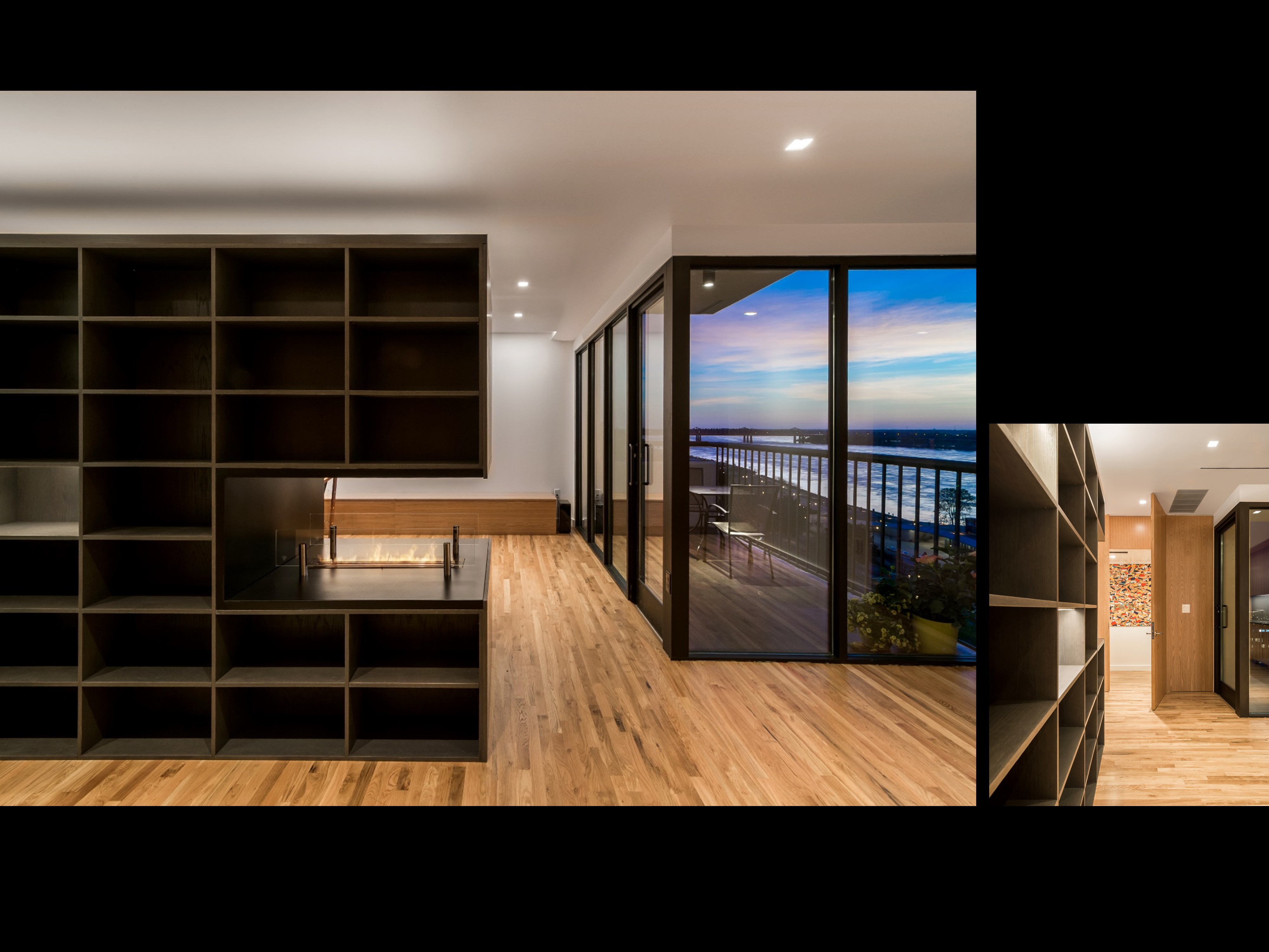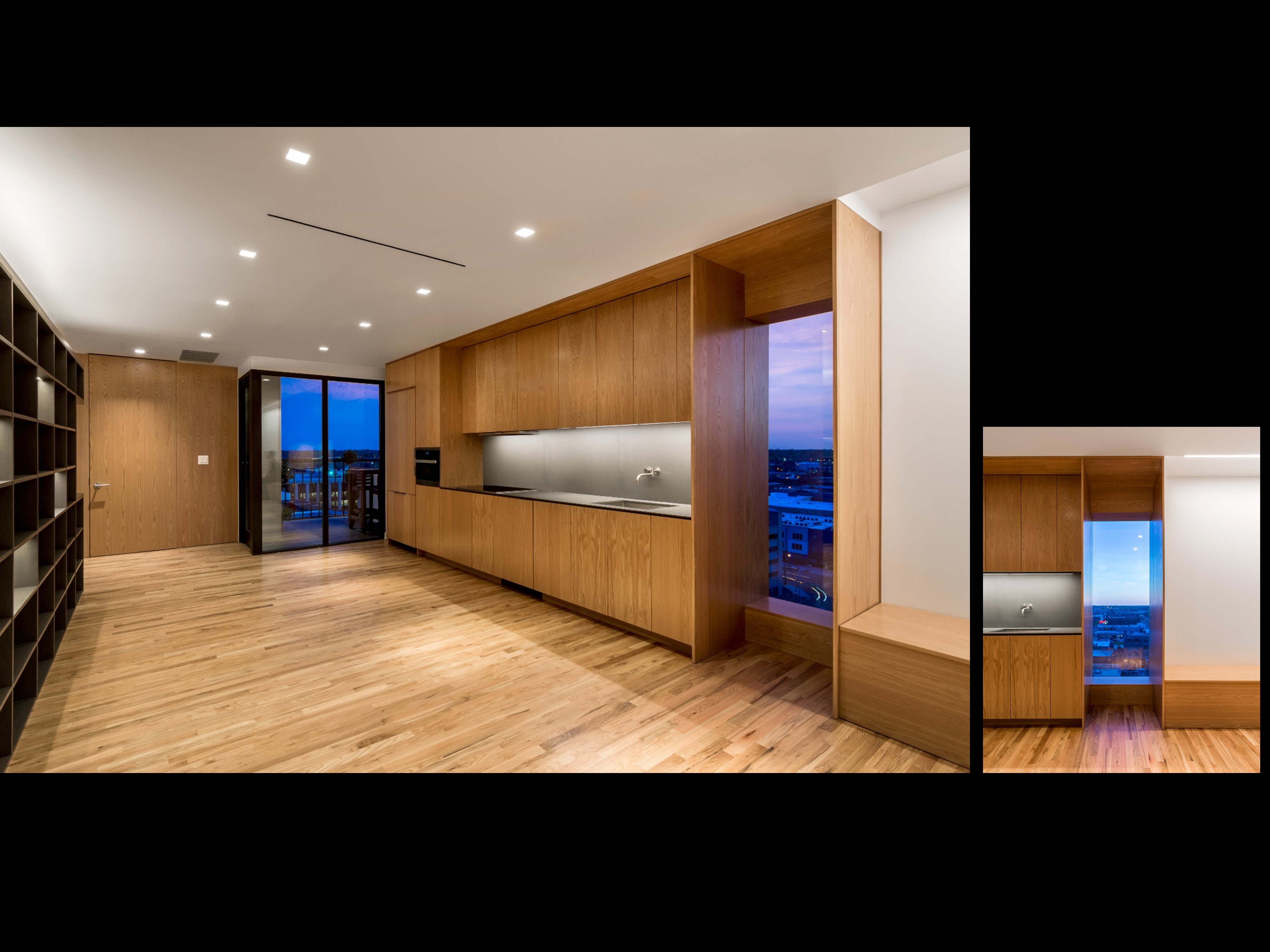 Three elements organize the 1,500 SF dwelling. The primary element is a charcoal stained oak veneer monolith of shelving, used to divide the space about the long axis, while also displaying the smaller artifacts within the art collection. This monolith is capped on one end by a fireplace and the other a fish tank. A cradle of lighter, contrasting oak veneer holds the space, wrapping up three of the four perimeter walls. This wooden cradle translates into an art viewing bench, the kitchen millwork, storage spaces for the office and bedroom, and built-in furniture. The restrooms are contained within a glass box, minimally impacting the directionality of the gallery/dwelling.