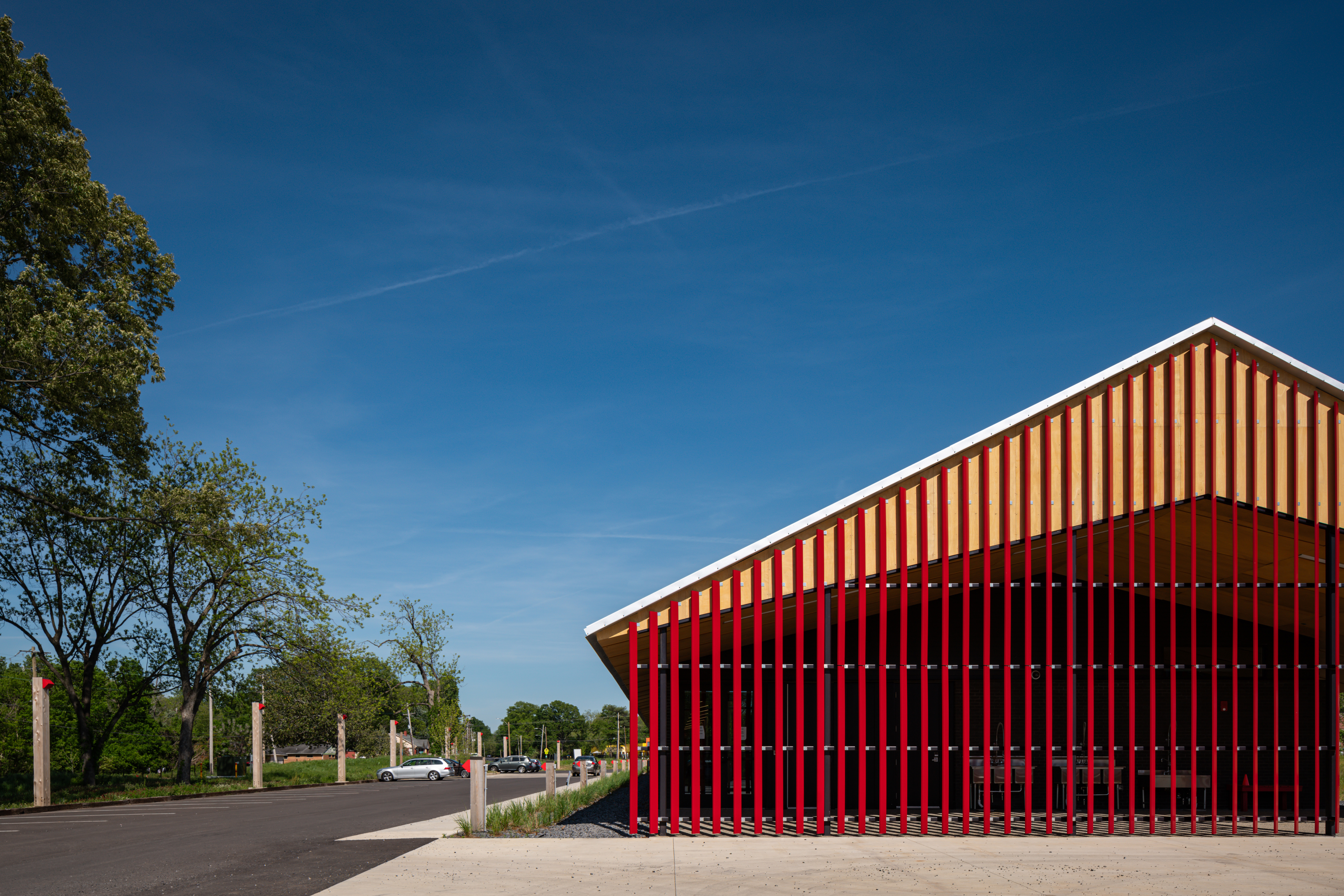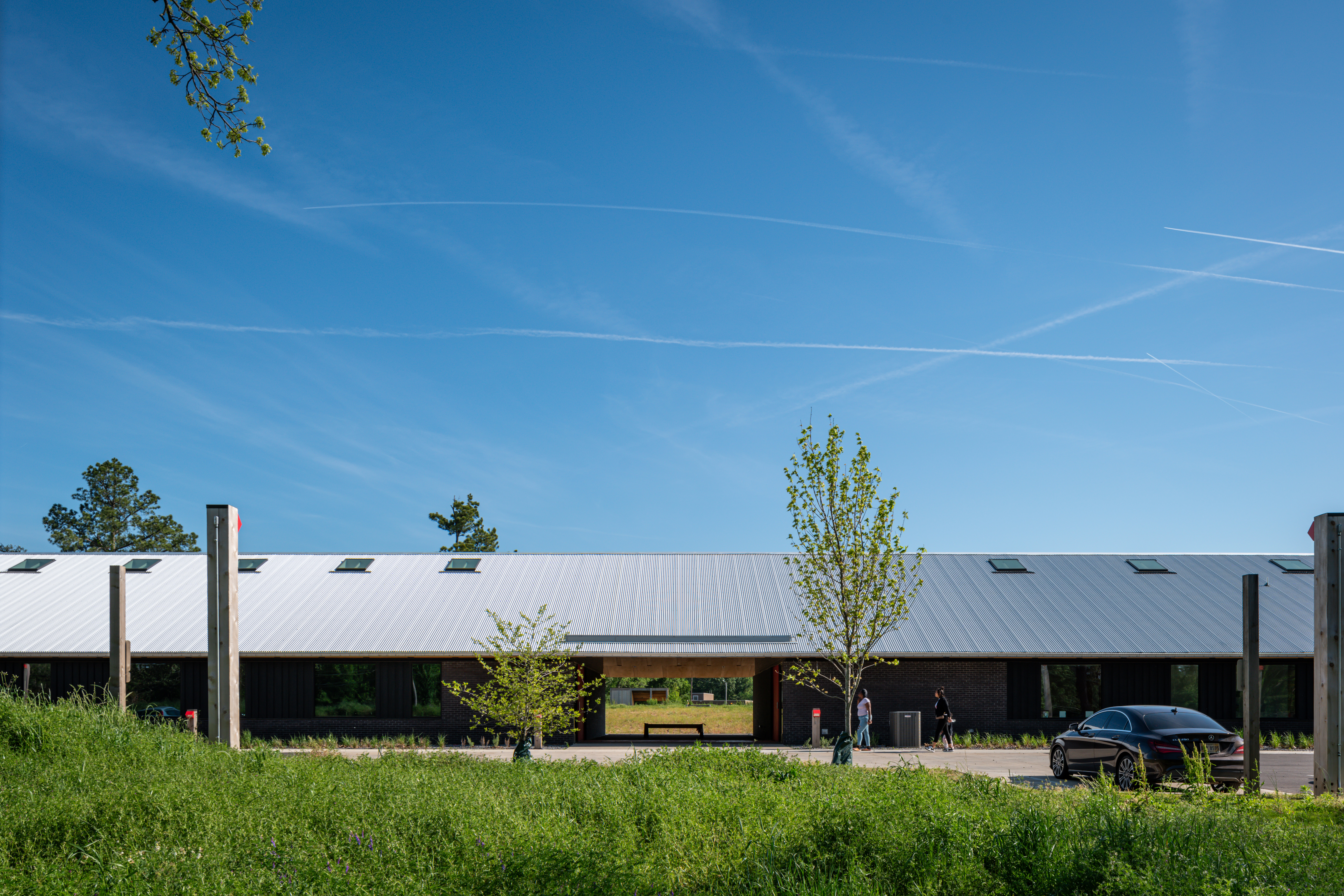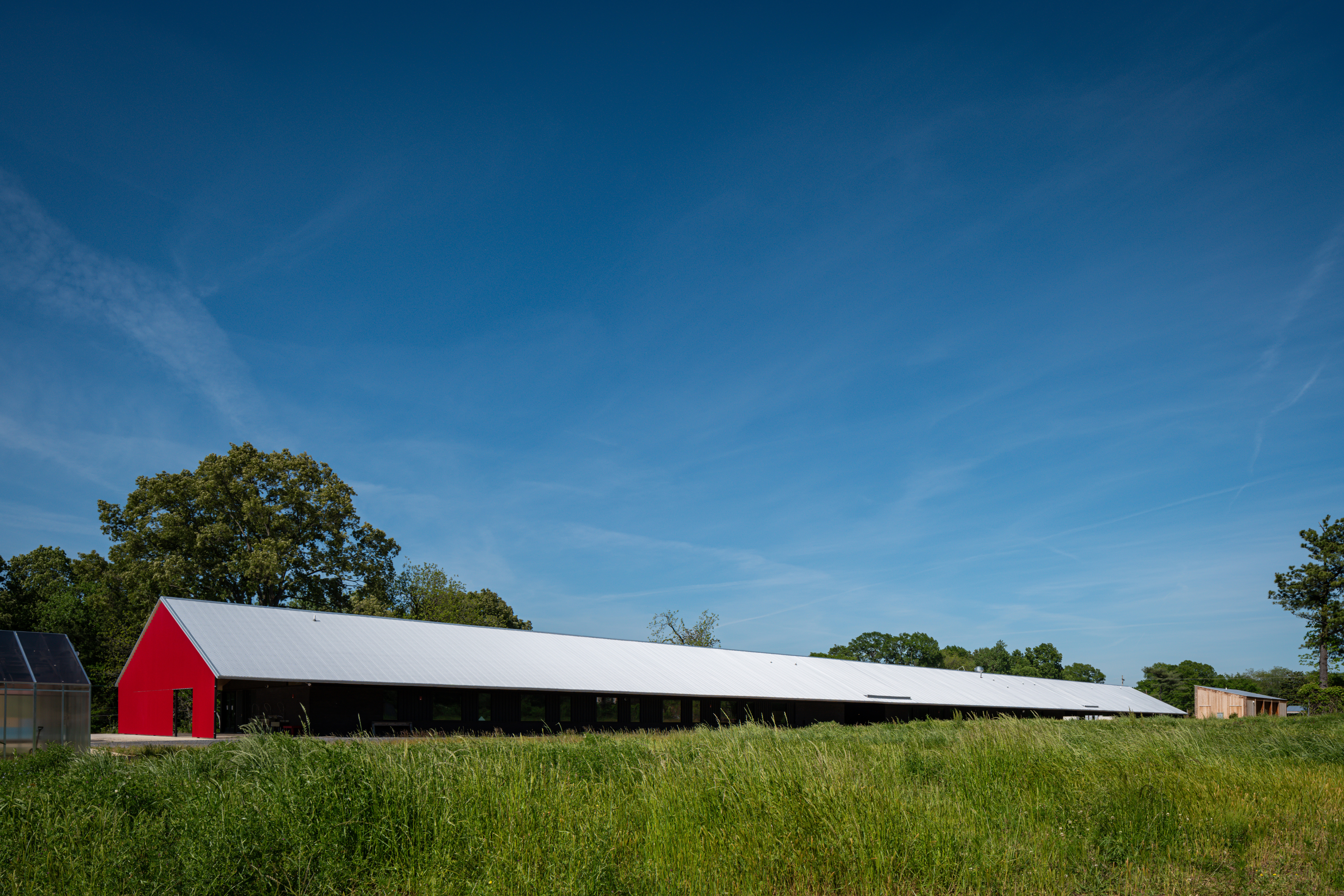 The client, a national non-profit organization dedicated to inspiring all girls to be strong, smart, and bold, continues to expand its presence in the city of Memphis, sought to expand their programming on the existing farm, which previously utilized two shipping containers for storage. The new program includes dedicated spaces for classrooms and training, a teaching kitchen and multi-purpose space, and an administrative building to support the consolidation of Memphis operations. The building supports the expanding programs of the client by housing them in separate buildings connected by one roof divided by dog trots. These shaded spaces provide refuge from the summer heat, create views through the building, and promote a sense of unity while allowing specific activities to flourish independently. The use of the client’s branding color, red, acts as a visual ribbon throughout the space, creating a sense of connection and continuity.