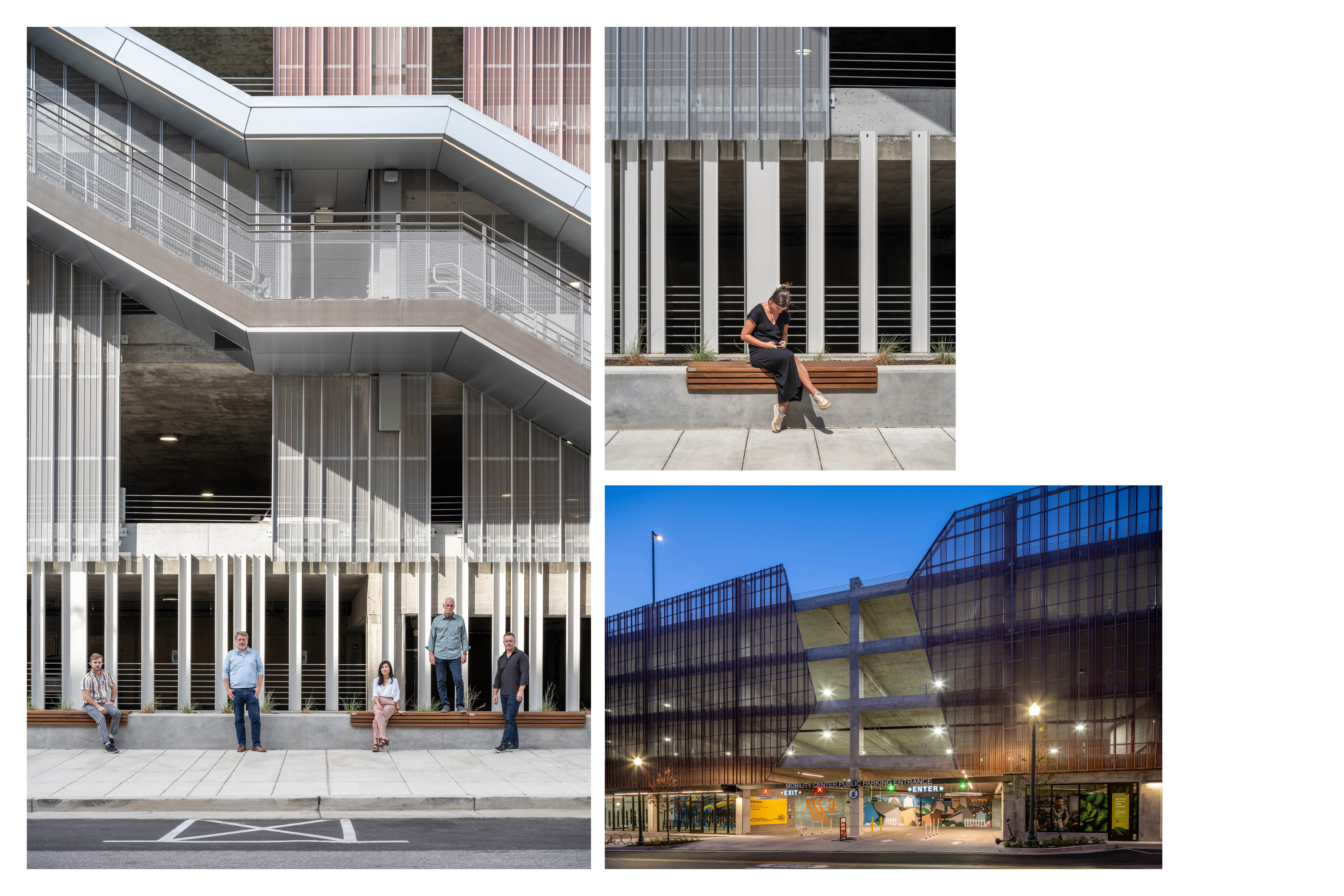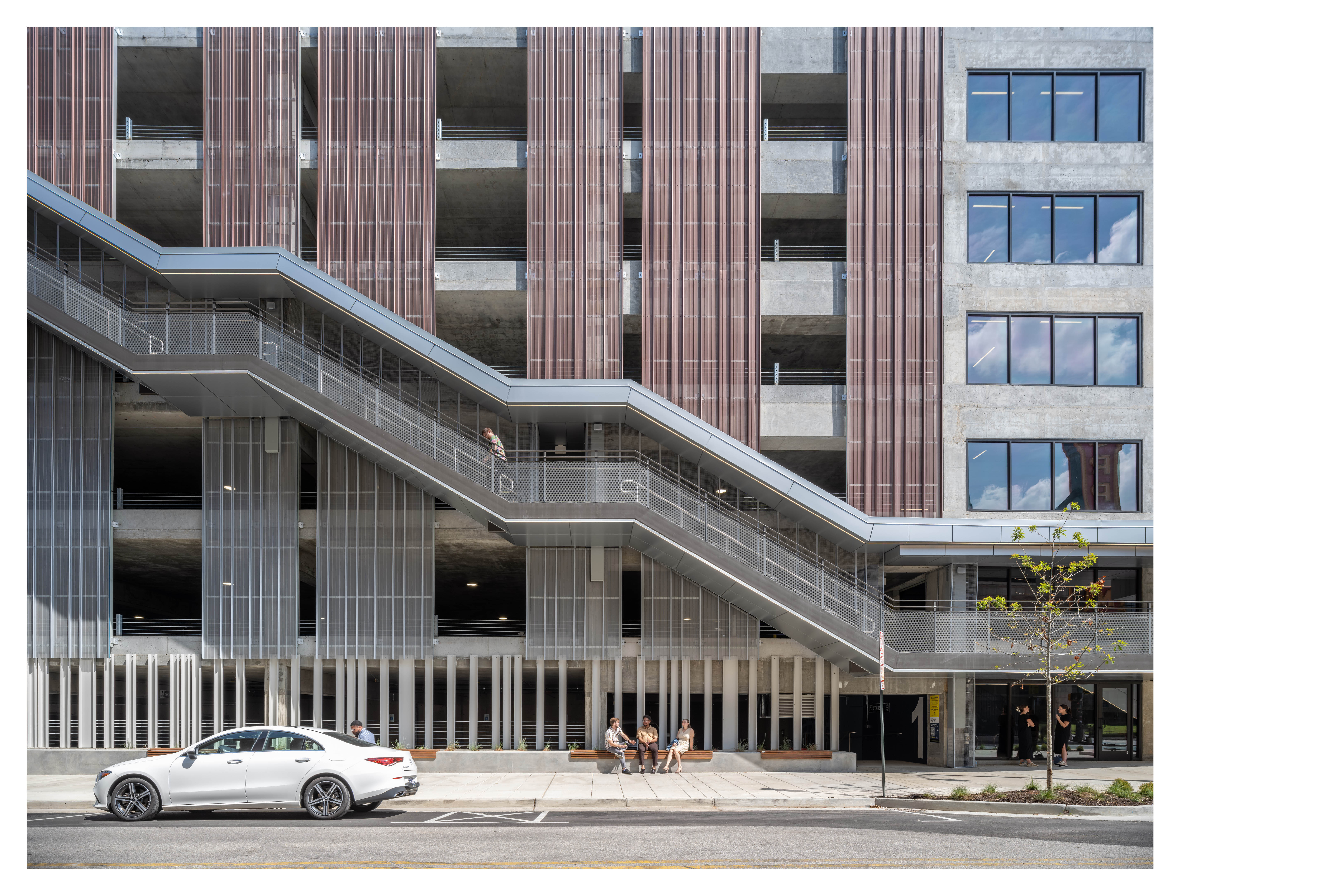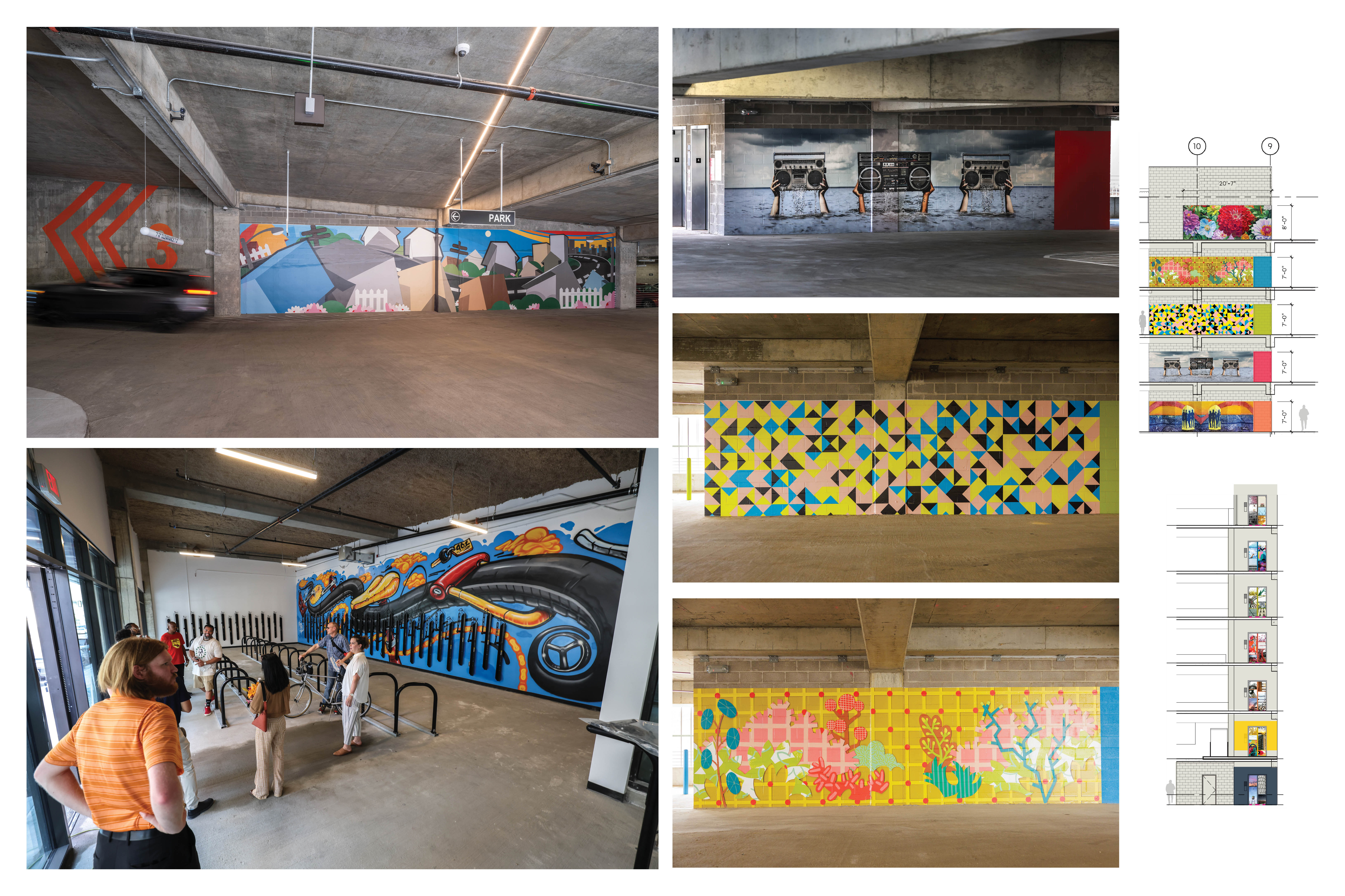 Further enhancing the pedestrian experience after parking at any level, murals by local artists provide artistic wayfinding at each elevator and stair core. Internal light fixtures were located to minimize overall light spill into the streets, and music is expected to play over the speakers.