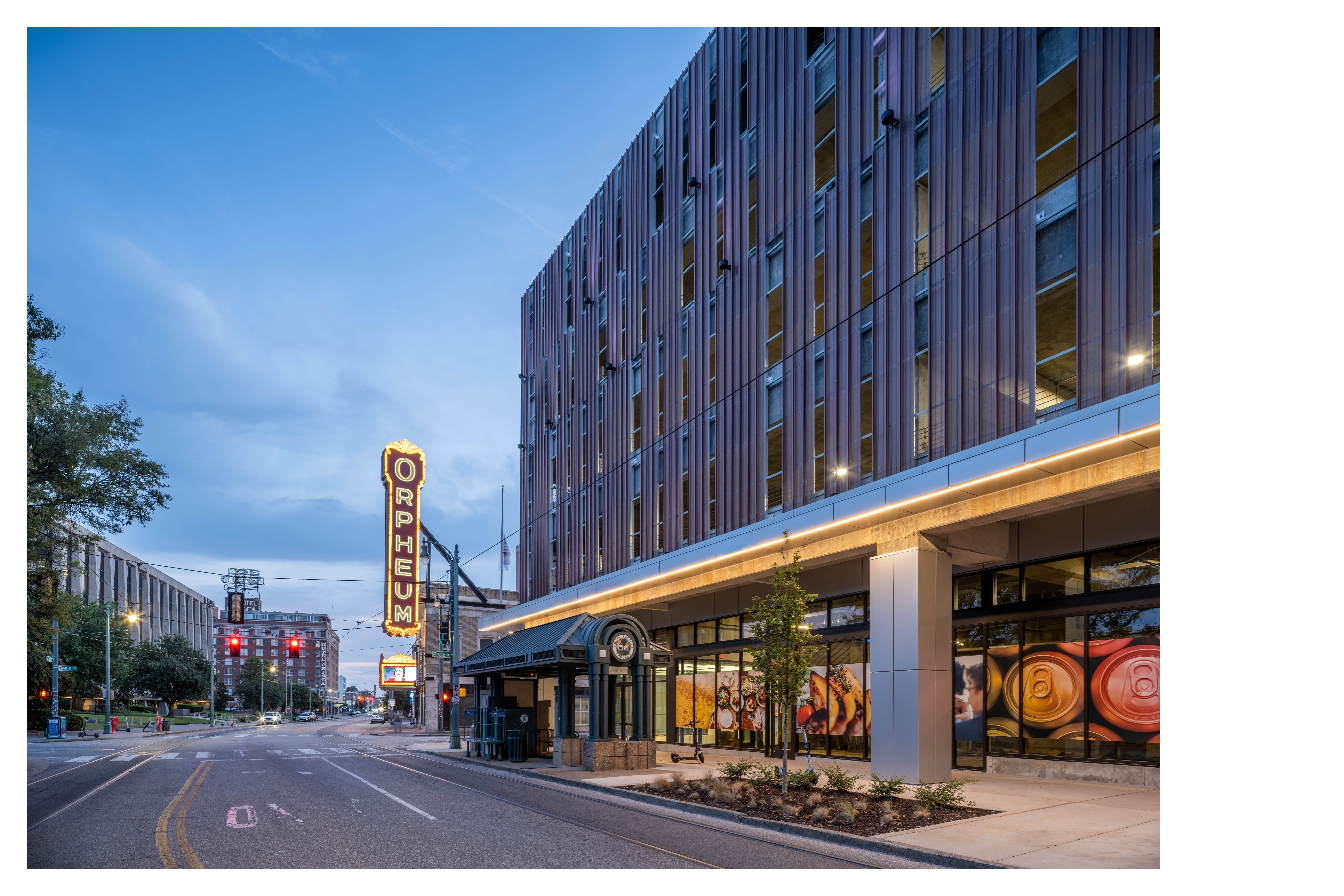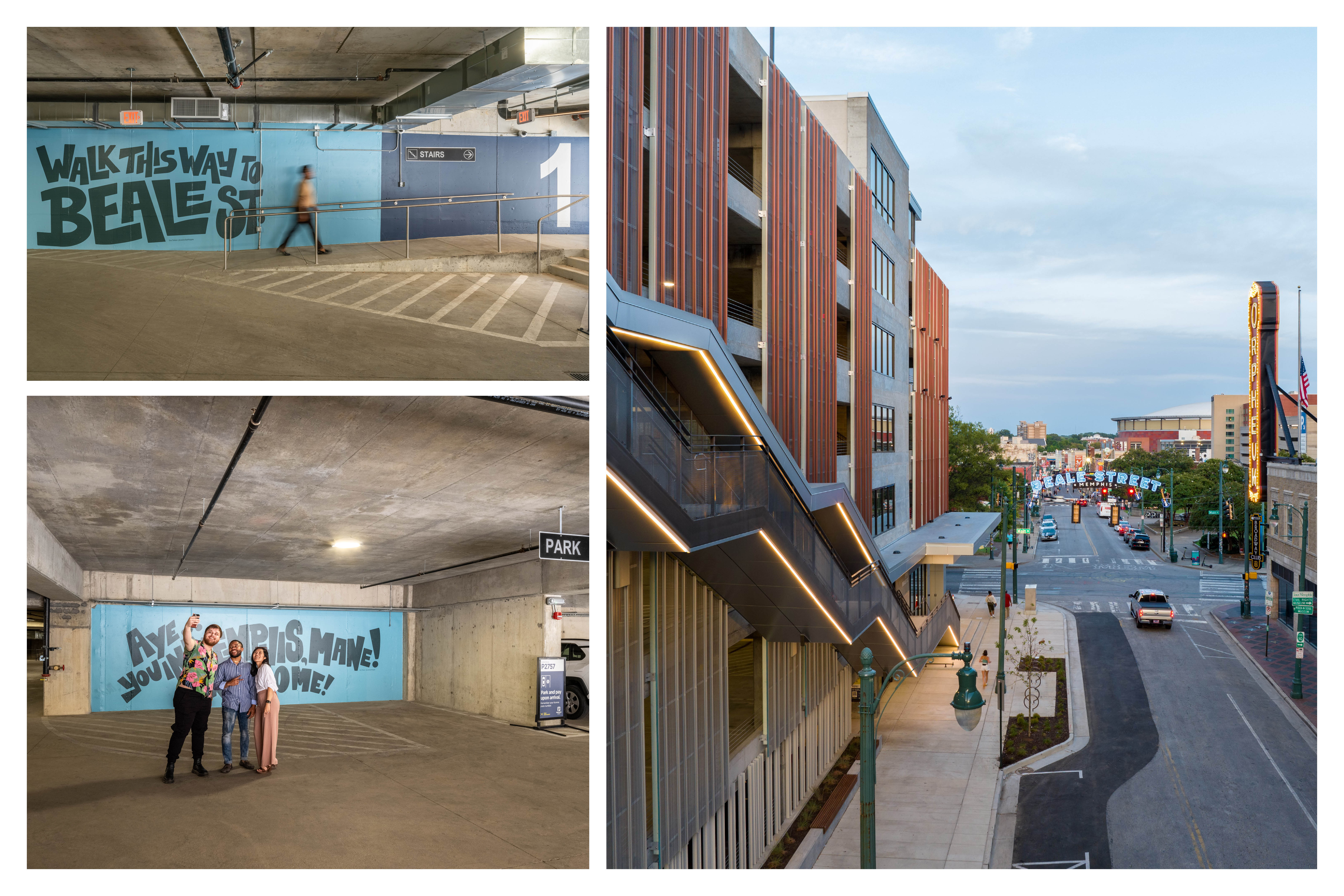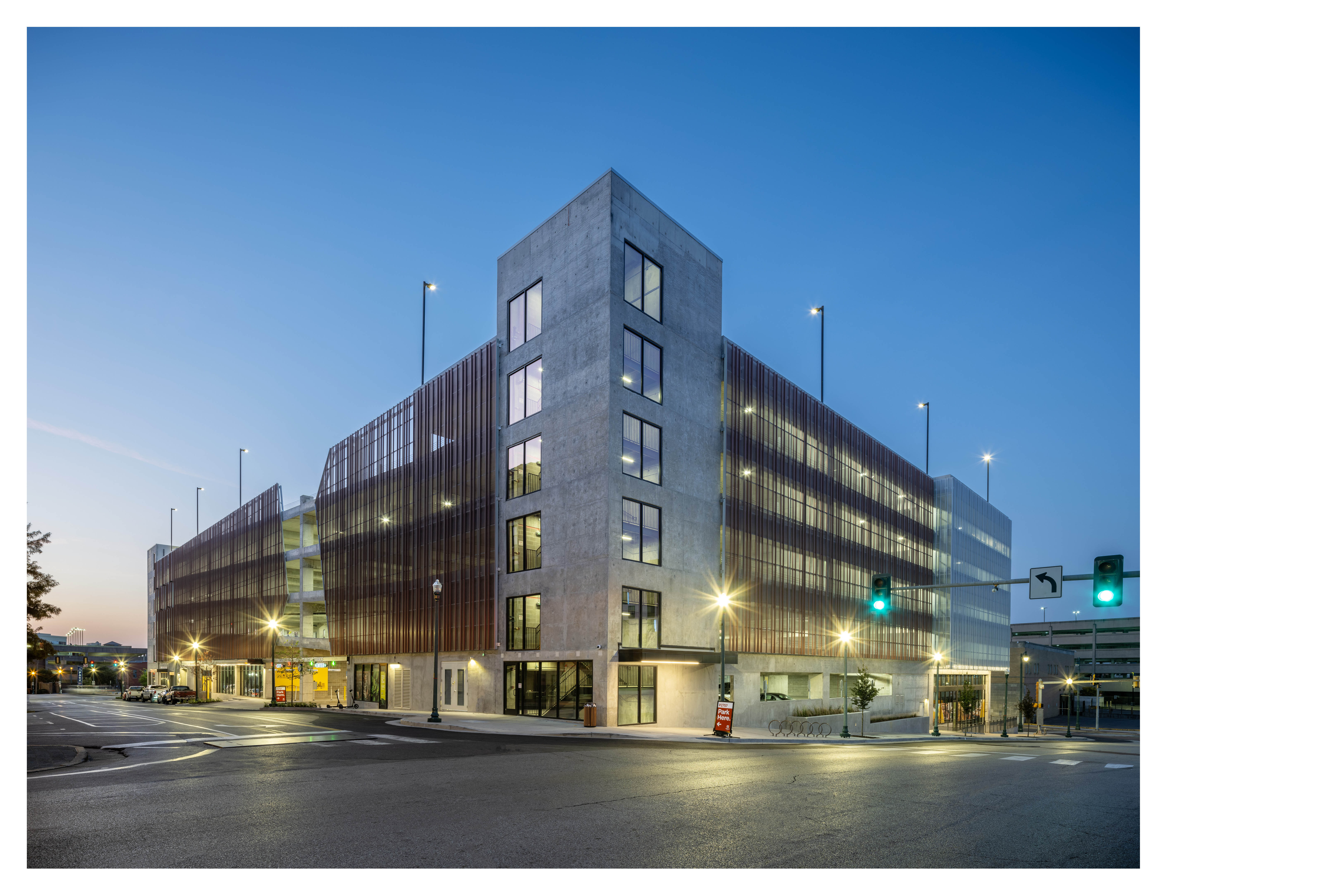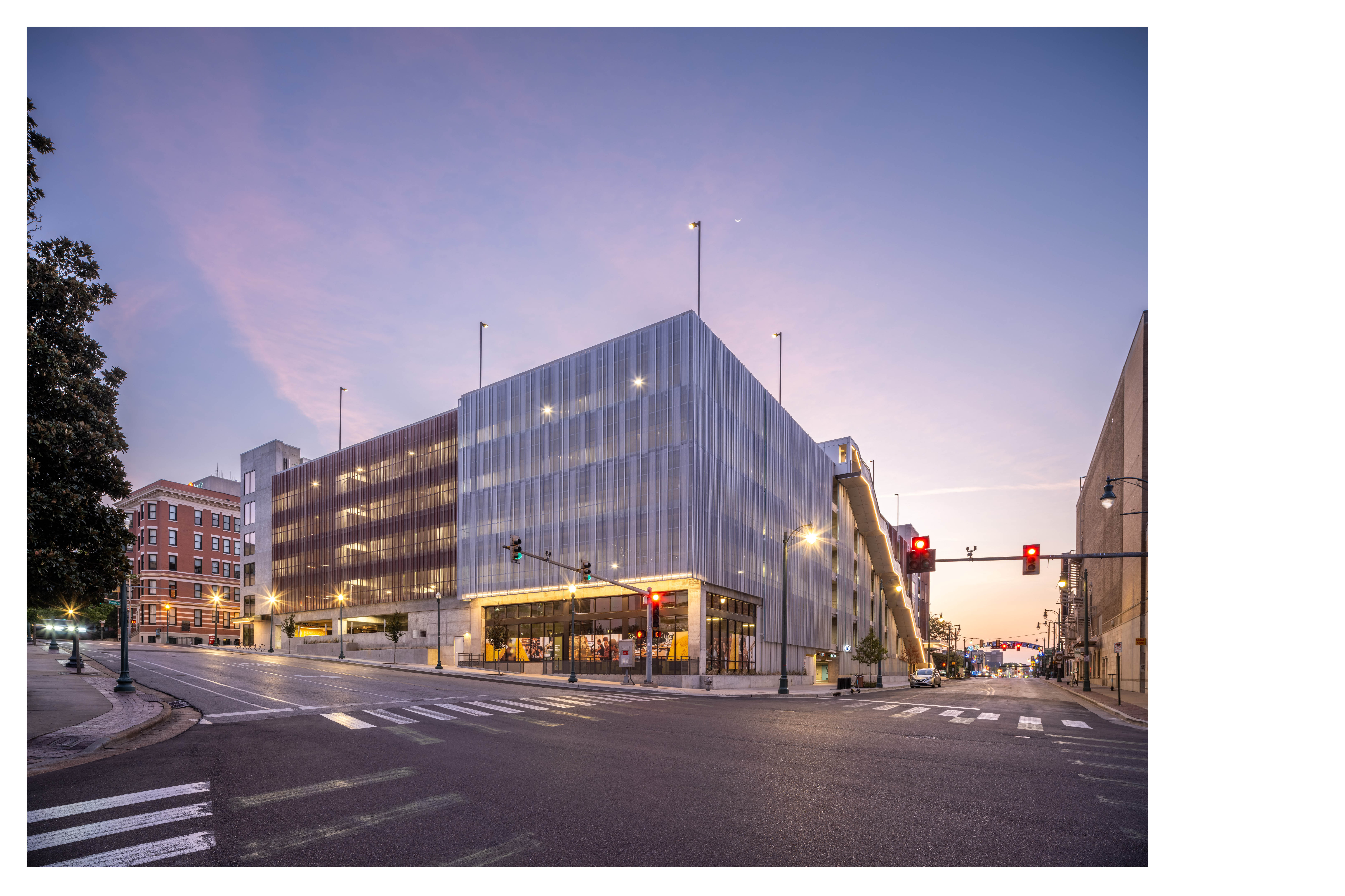 The prominent site provided opportunities to enhance the pedestrian connection extending from iconic Beale Street to the recently renovated park along the riverfront and from the South Main Arts District to the transformed Renasant Convention Center and Pinch District. With major street frontage on all four sides of the site, the façade design uses a cost-effective perforated metal panel system to break down the scale of the building with an articulated pattern responding to each façade’s different need for privacy. To create a more interesting pattern within budget, a limited palette of 2 colors, 2 perforation sizes, and 2 panel widths are placed to visually represent the rhythm of Memphis Blues music. At the main parking entry to the north, the panel system edge creates two arrow shapes exposing the concrete structure as an architectural wayfinding element for approaching drivers.