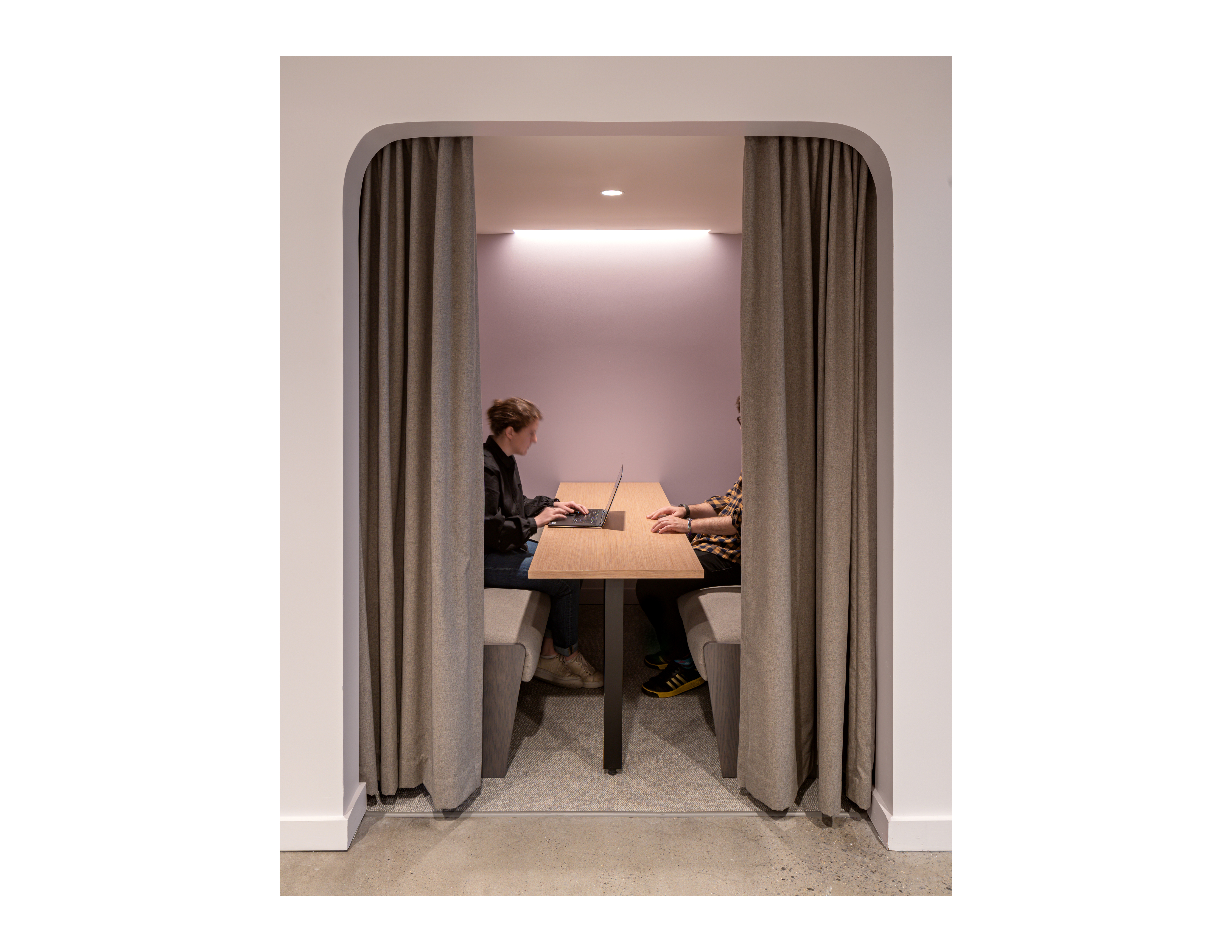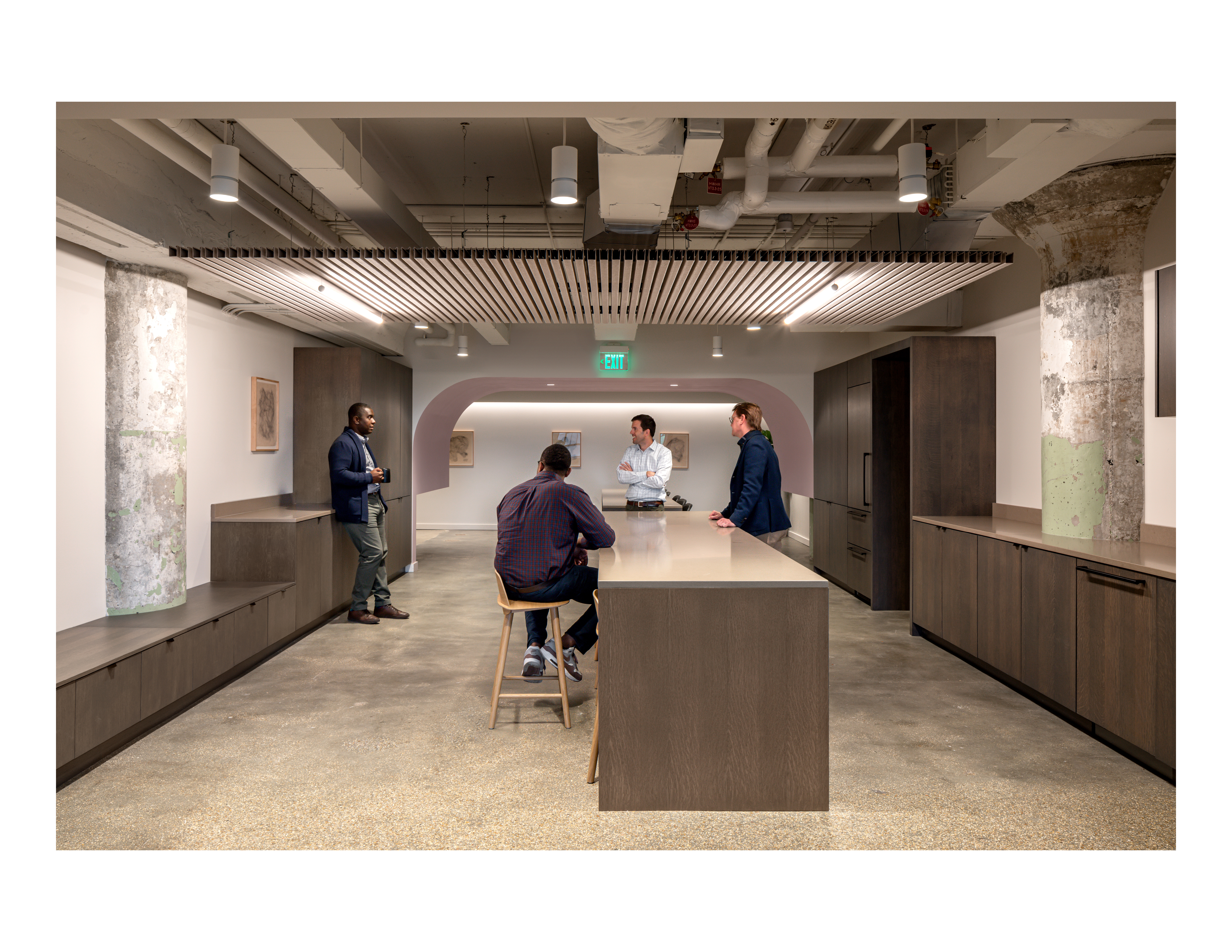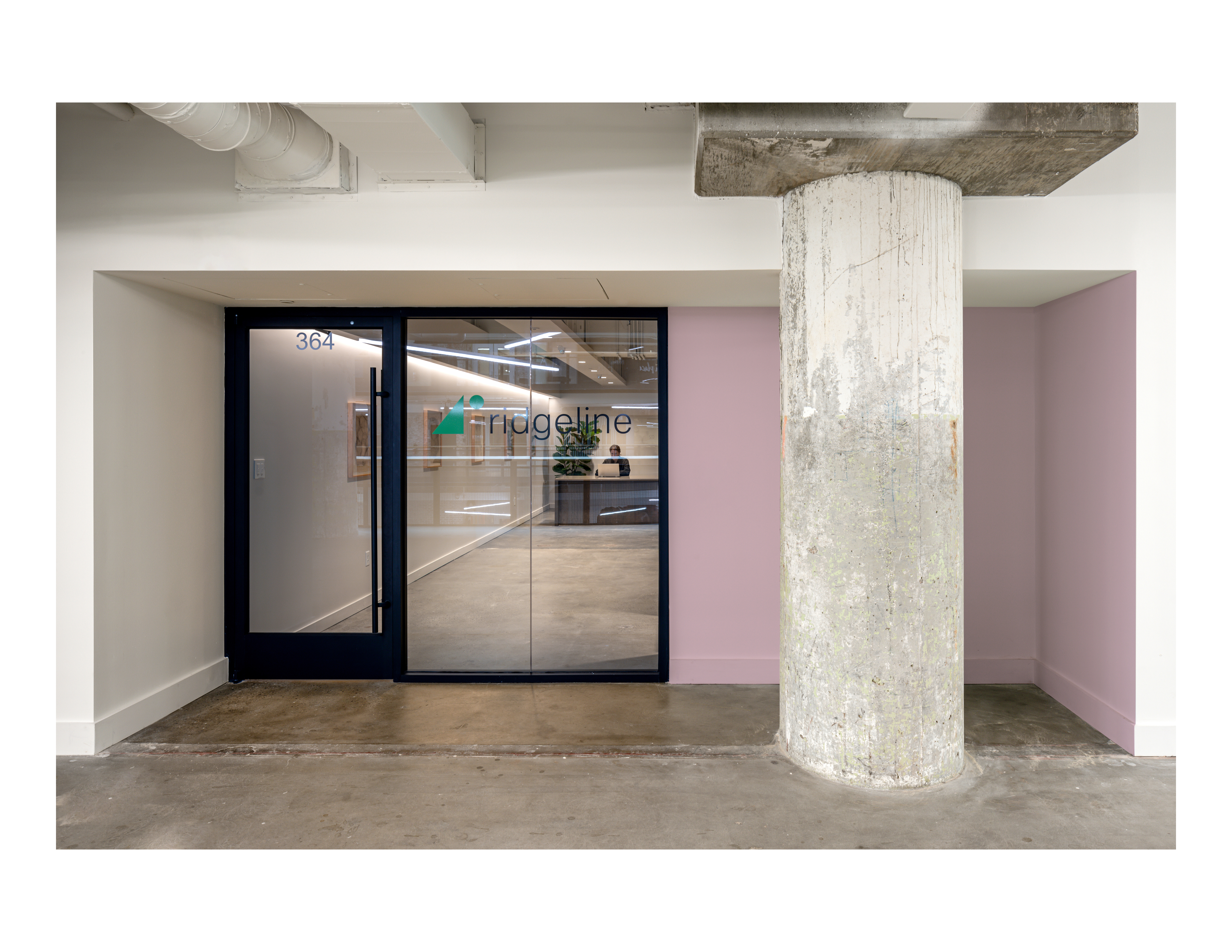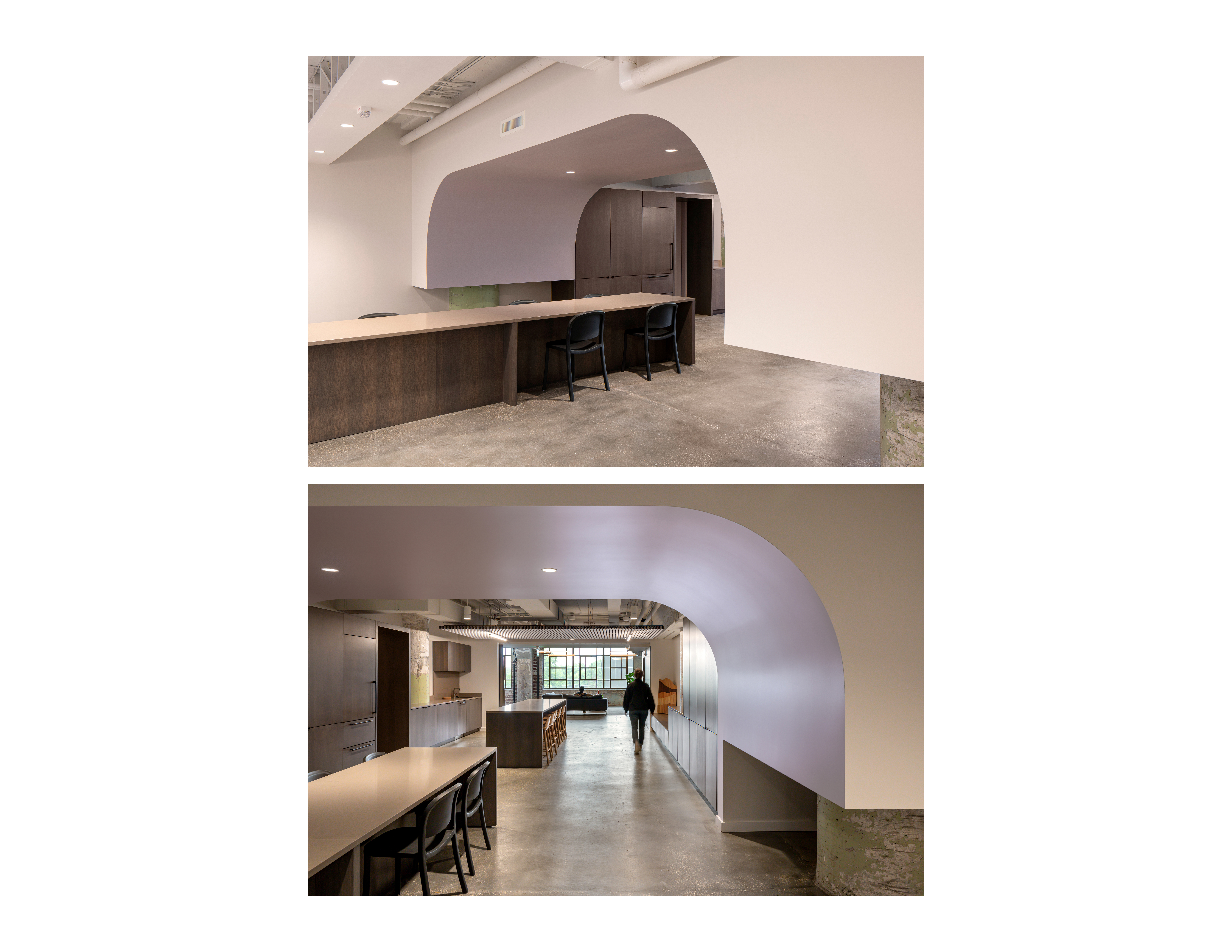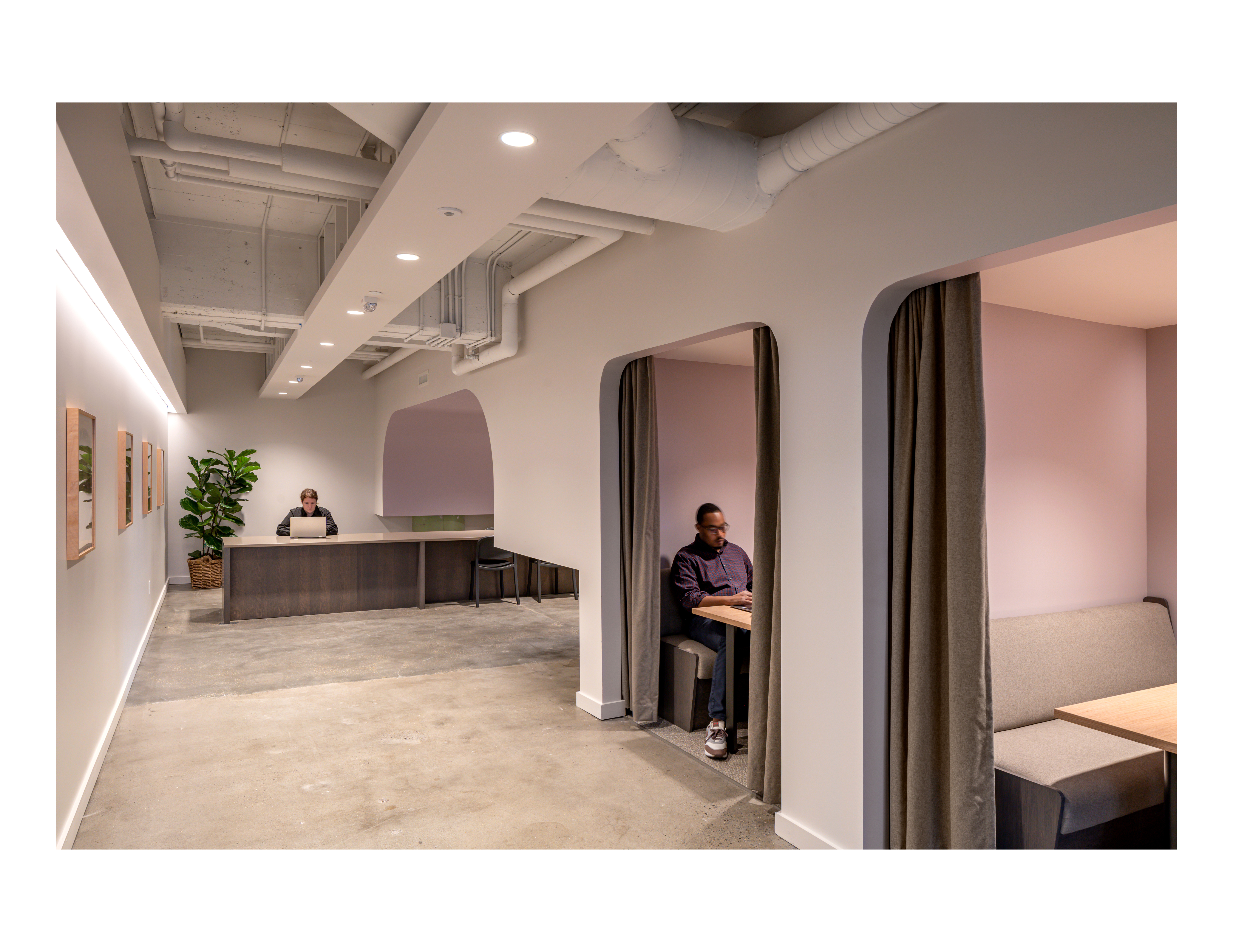 The program includes private and open workspaces, meeting and conference rooms, a break area, and event space. The break area in this space functions as part of the entry sequence and event space while also serving as a central point where people can connect. Because of the front-facing break area that would traditionally be placed in the back of office space, millwork was used to delineate the walkway and provide a bench, meeting space, built-in lockers, concealed appliances, and hidden doorway bookcase. Curtains soften the space while responding to acoustical and privacy needs. Warm colors, lilac accents and soft curves create an inviting space while balancing openness and privacy. Sweeping archways conceal air ducts and concrete beams while creating layered spaces and thresholds. Private offices for Ridgeline staff have a “front porch” that welcomes clients and guests.