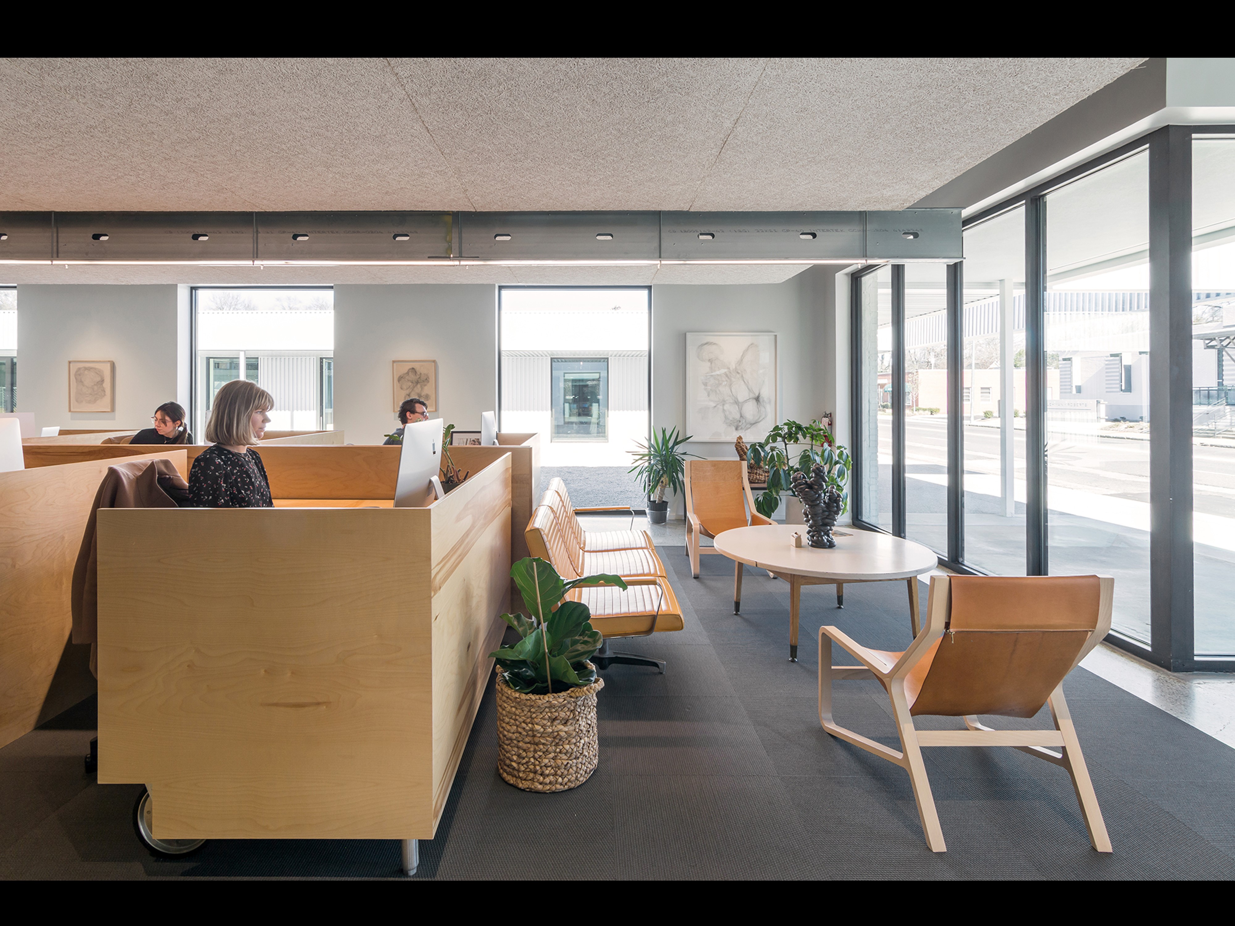 Workroom walls do not extend to the deck, allowing for light and airflow to pass over the space and provide a more open feel. The private offices, meeting areas, and conference room wrap around the workroom core. South of the workroom are the open office, break, and lounge areas. Exterior windows along the open offices were cut down to be full height, allowing for more northern light as well as views to the courtyard beyond. Storefront windows were added to create a stronger connection with the community.