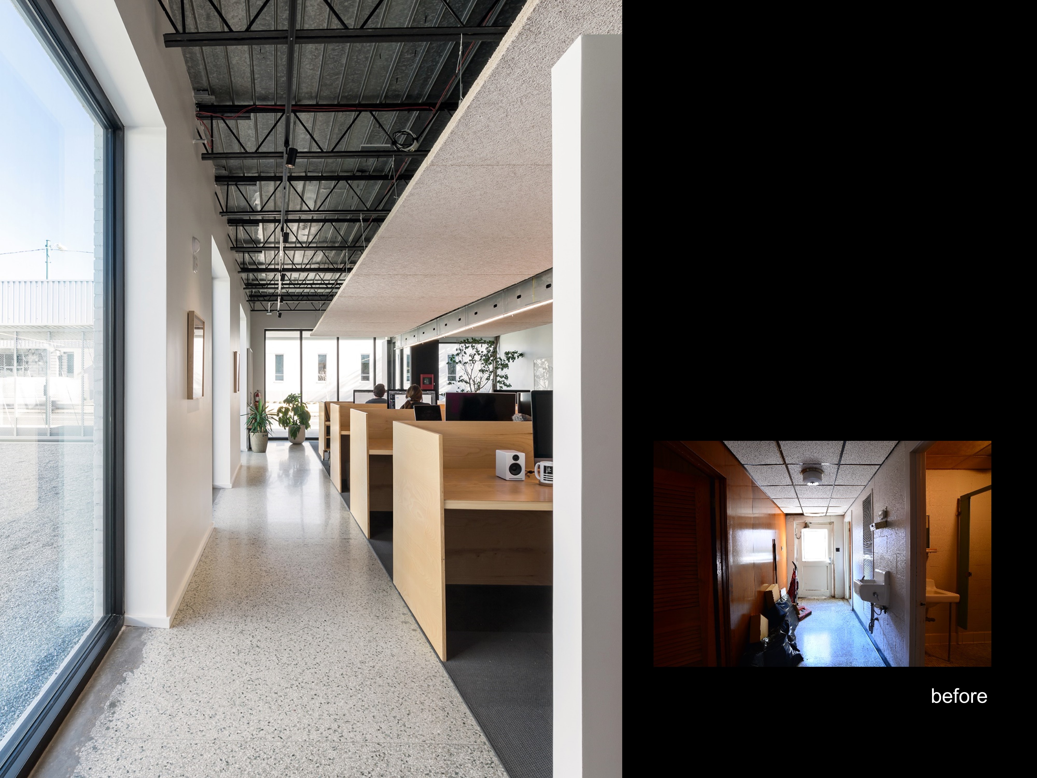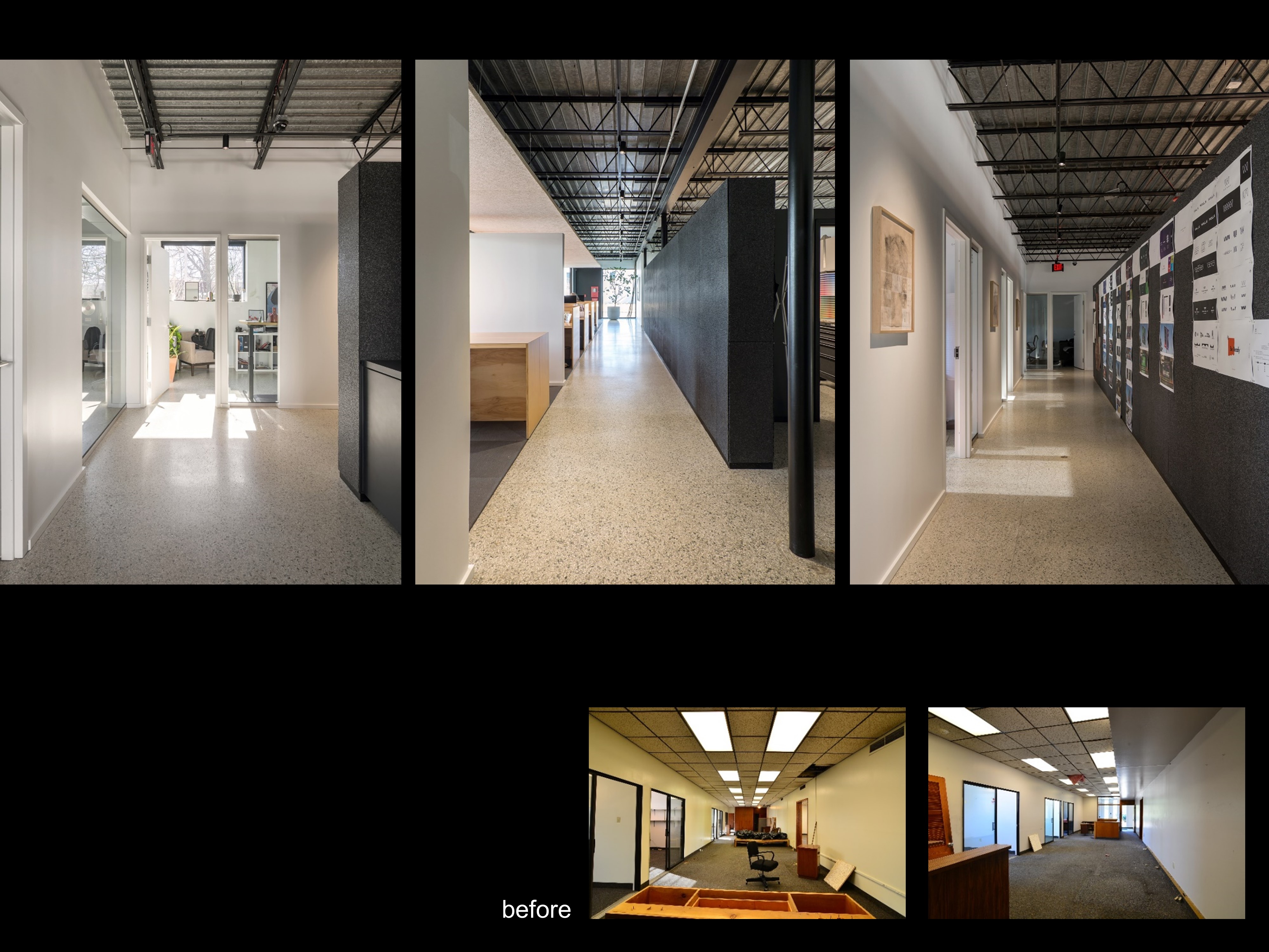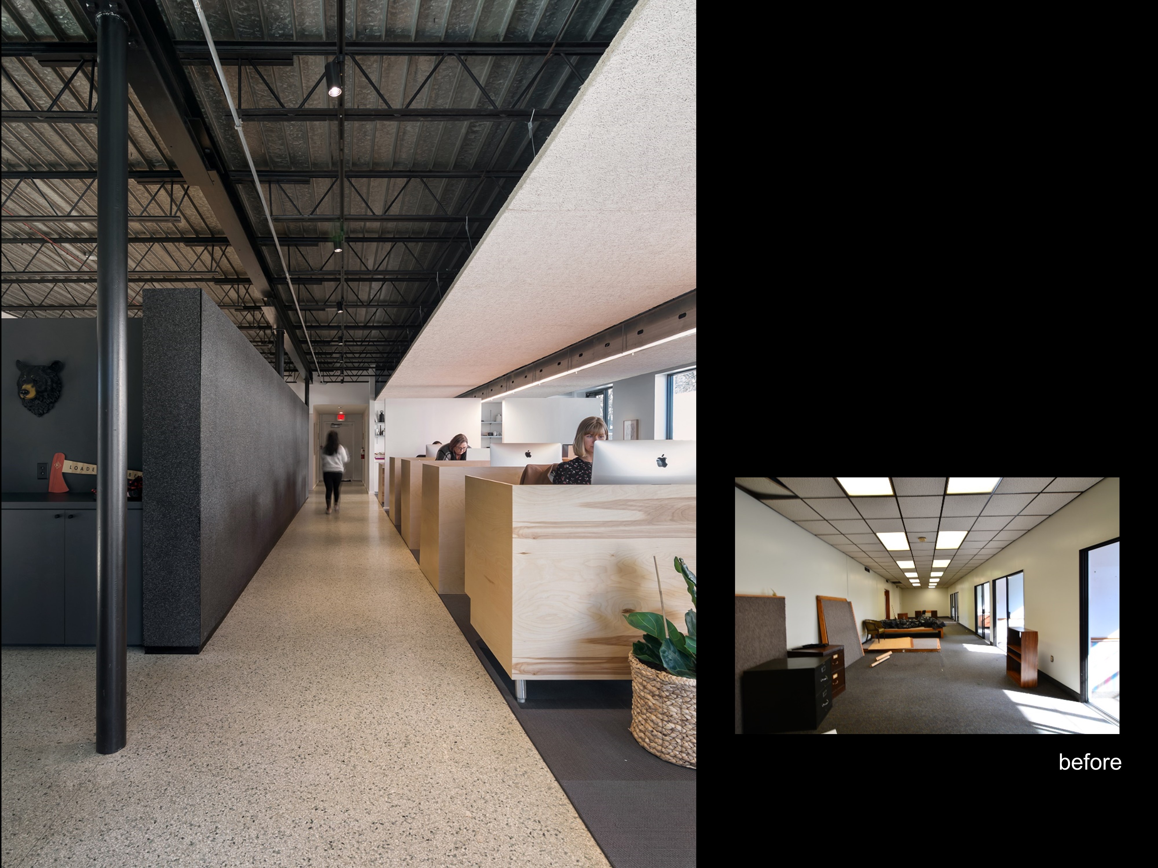 The space was designed within a reclaimed aging commercial corridor building utilizing traditional building materials in creative ways to achieve a clean, efficient, and refined space with a layout that fosters community within a growing office.