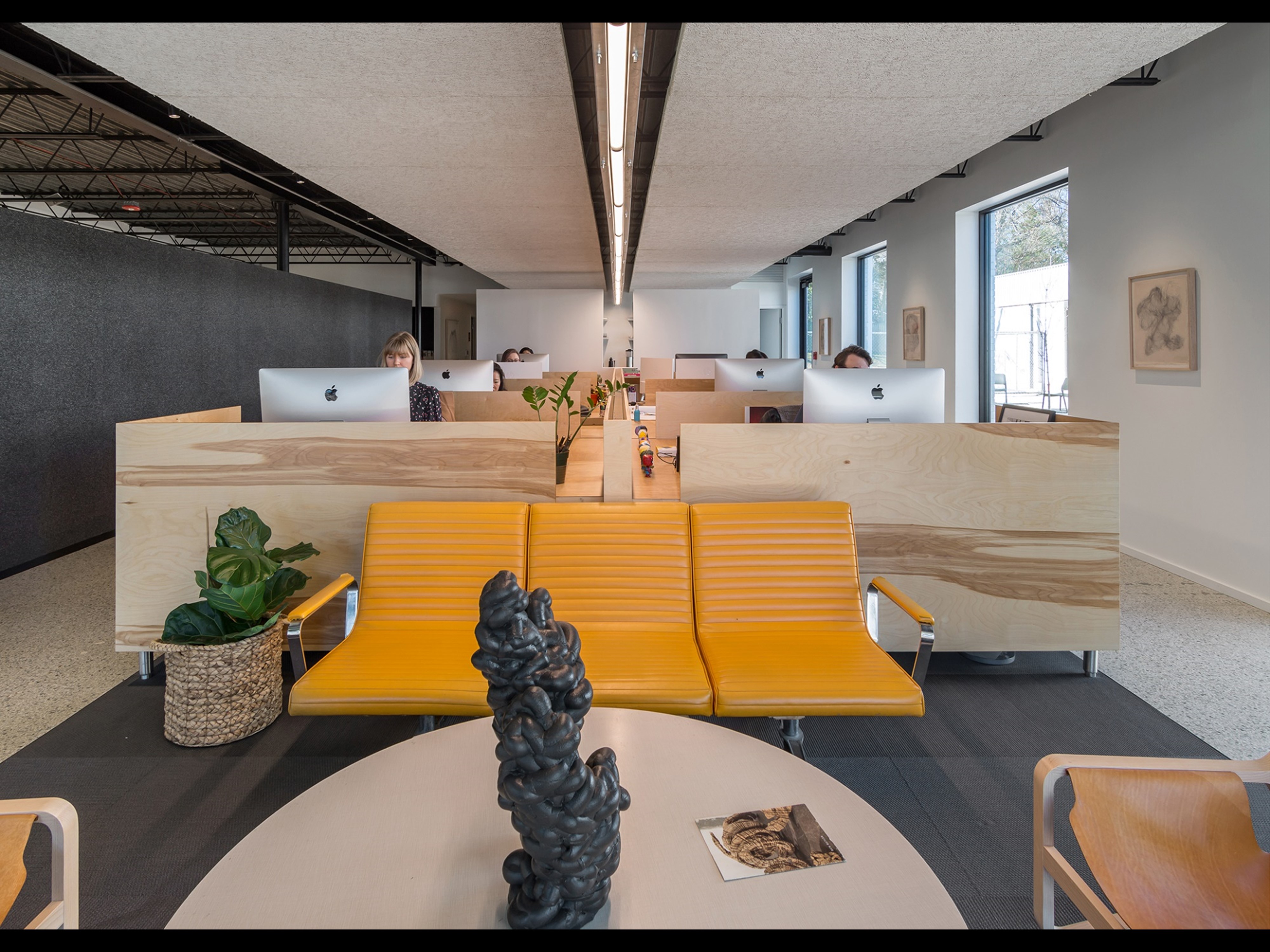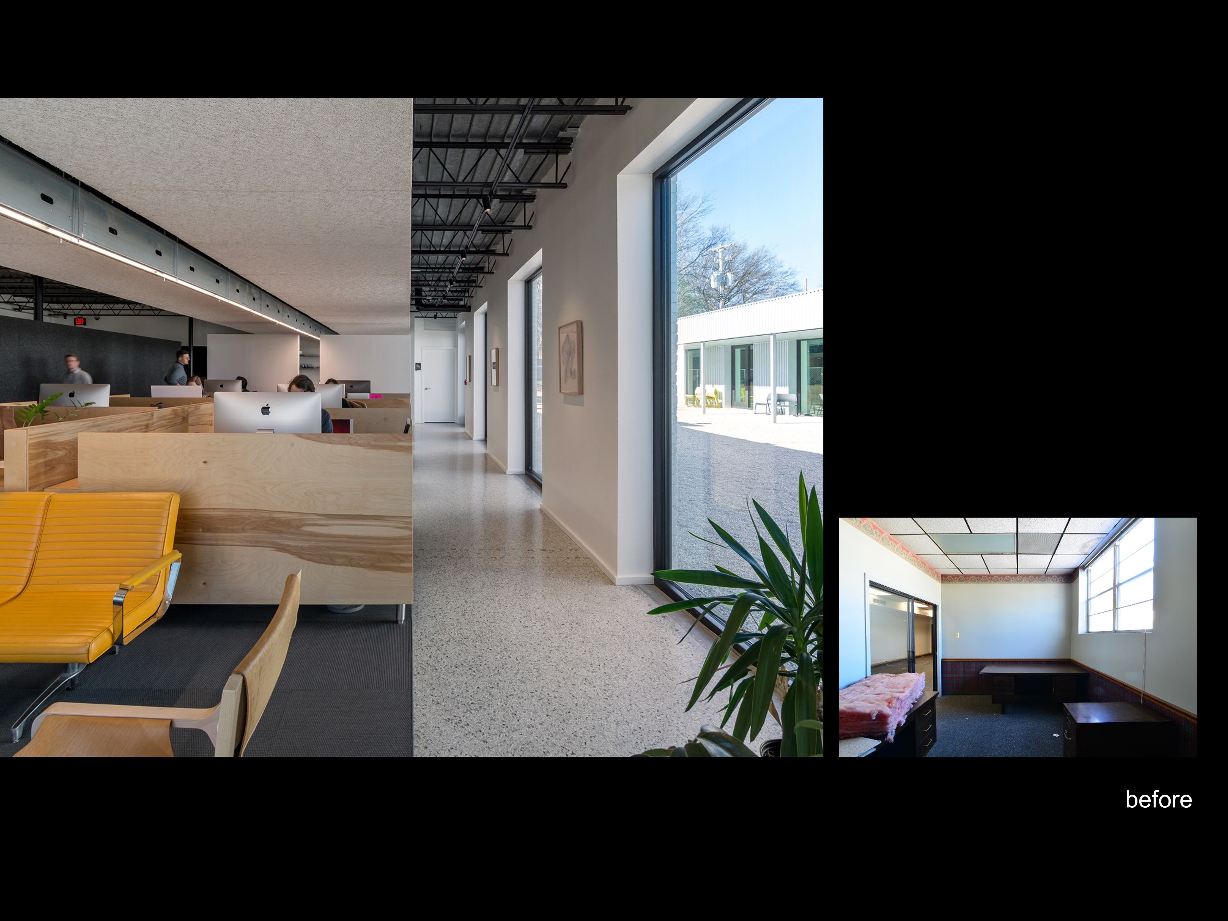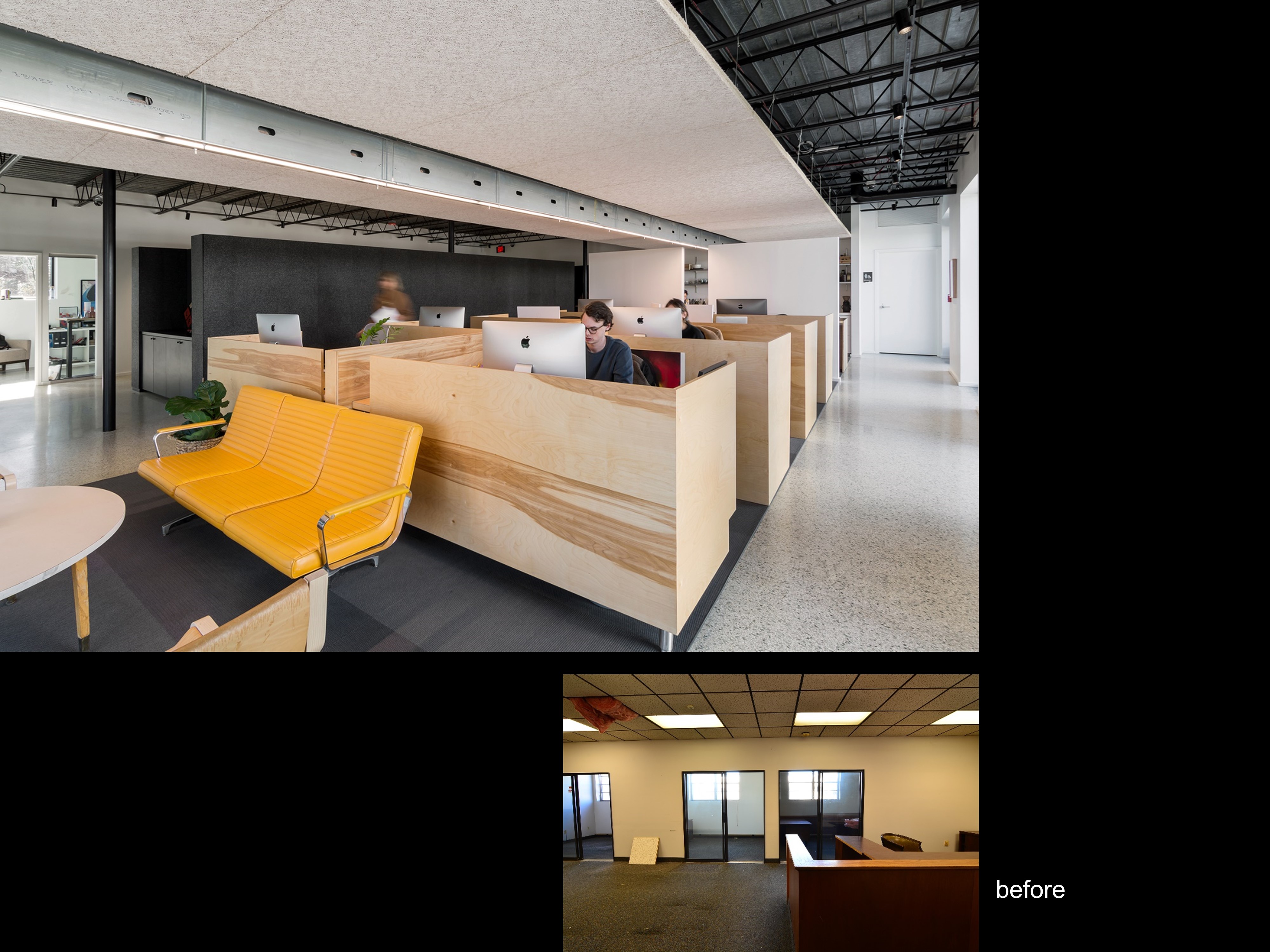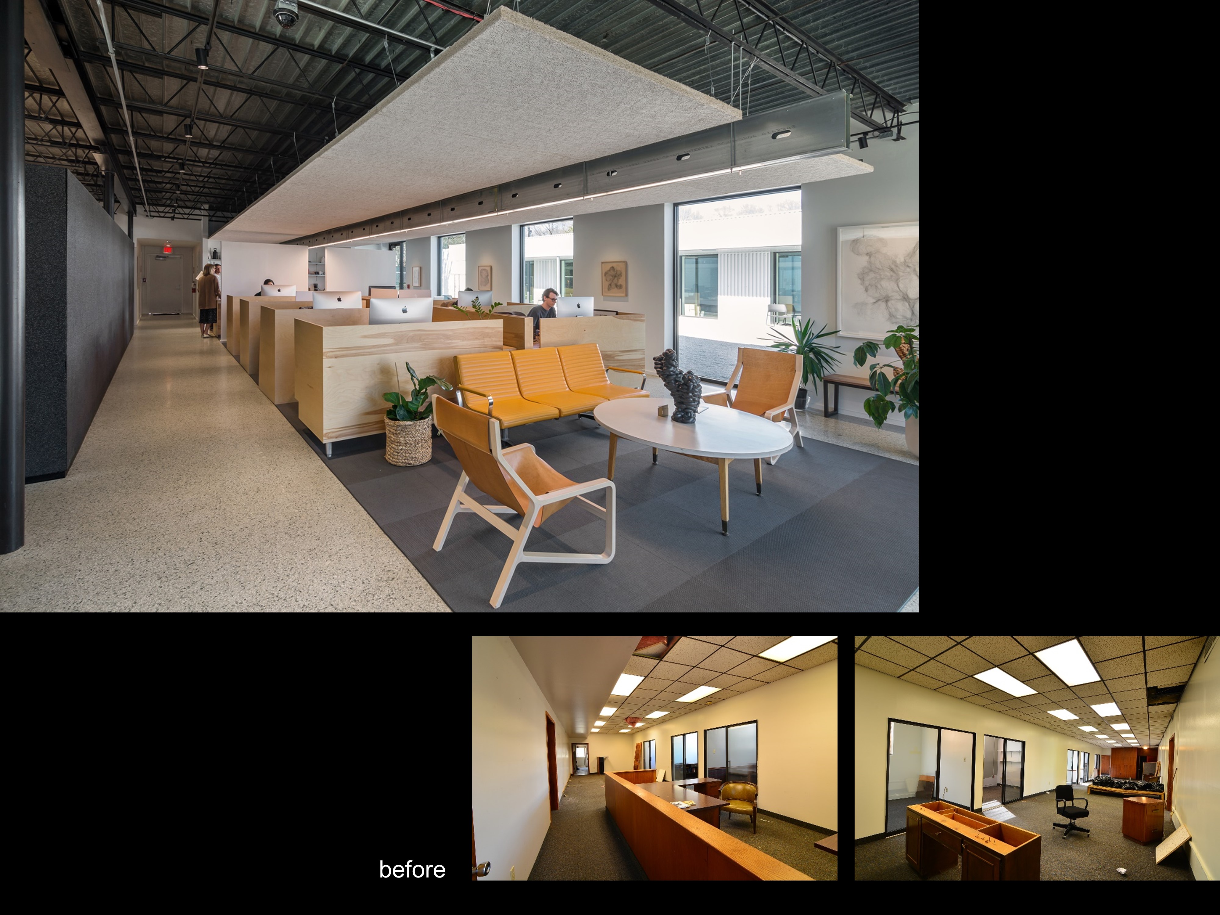 The space was designed within a reclaimed aging commercial corridor building utilizing traditional building materials in creative ways to achieve a clean, efficient, and refined space with a layout that fosters community within a growing office.