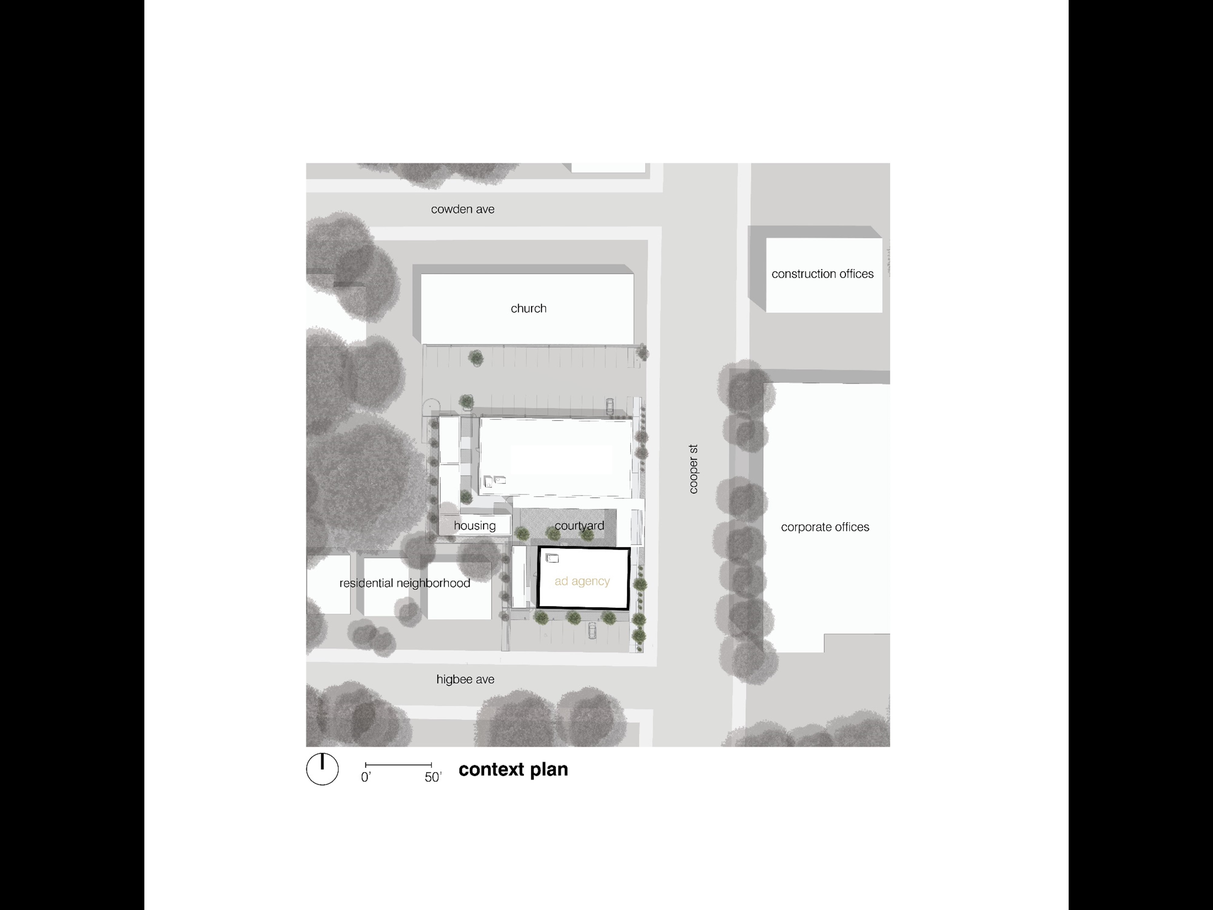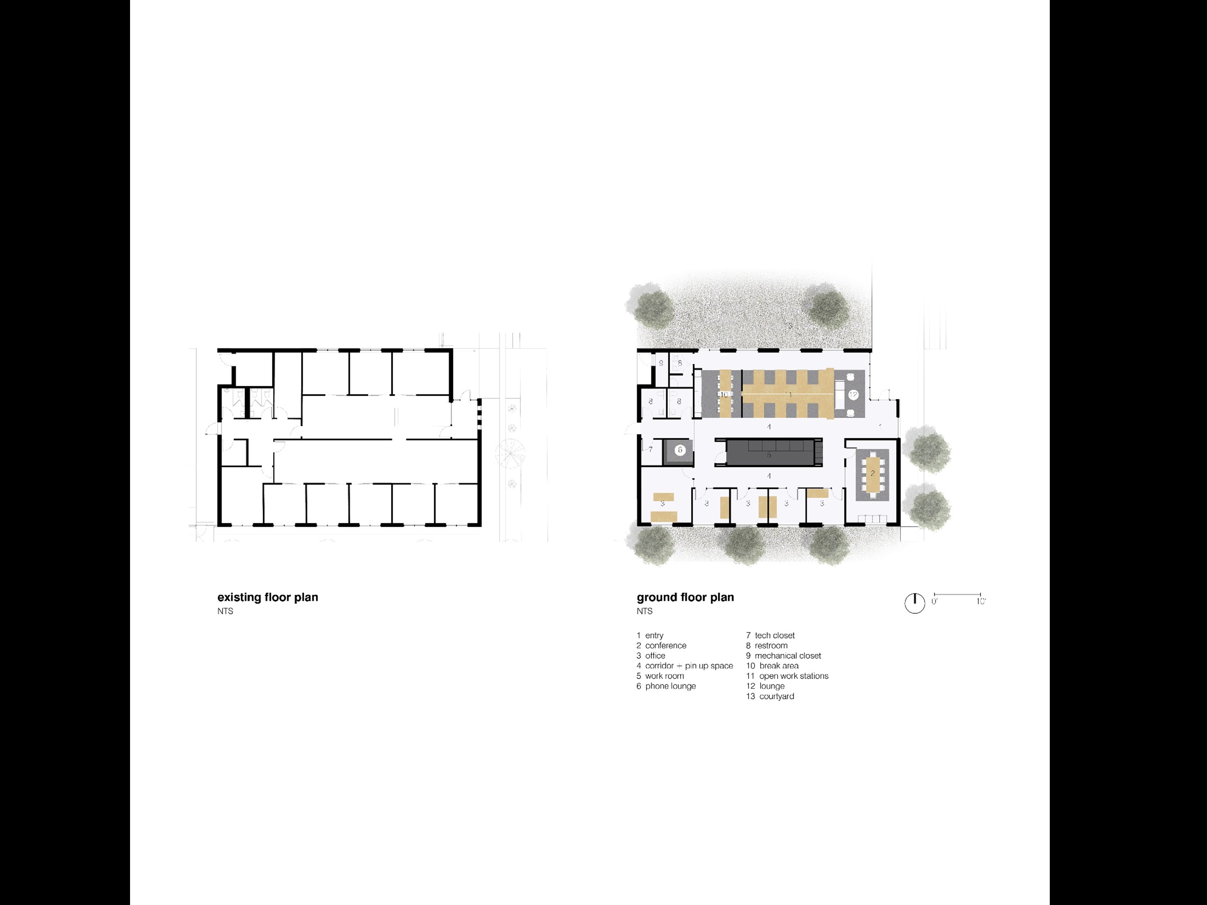 The program consists of a center spine workroom with layout space, printing, and a pin-up area. The exterior perimeter walls of the workroom, which double as circulation and gallery space, are wrapped in a trackable acoustic material.