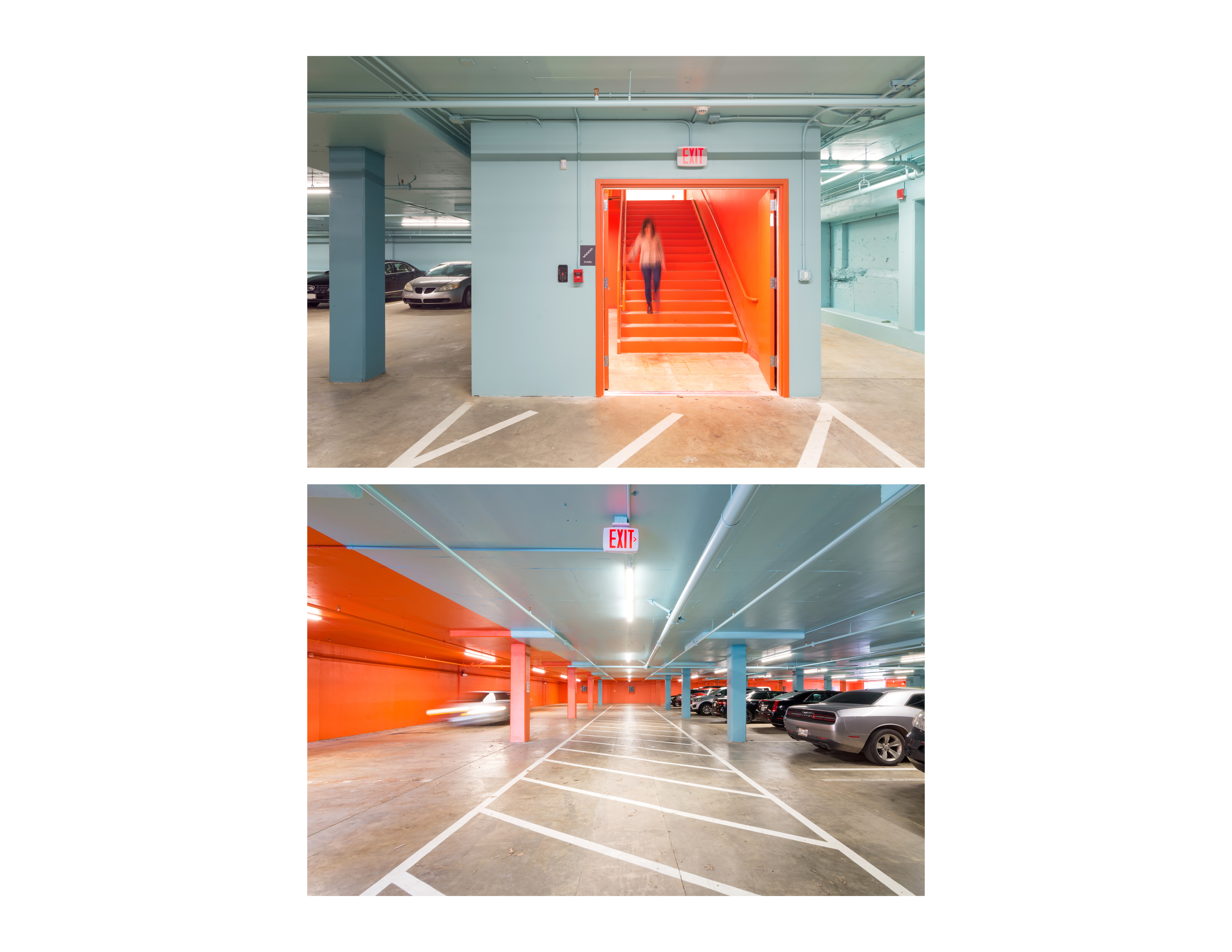 Most spaces such as classrooms, offices, and the gymnasium were brightened up with either crisp whites or natural wood tones, but pops of modern colors were used sparingly in key areas to make the most impact. These colors help with subtle wayfinding by coding similar areas, such as administrative areas in golden yellow or restrooms in turquoise. One of the clearest examples of the use of color for wayfinding is in the lower-level parking area. The monumental staircase is painted entirely bright orange. It leads users down to the parking level, where they are met with an explosion of complementary colors, clearly delineating pedestrian zones and drive aisles to ensure the safety and organization of the parking and drop off area.