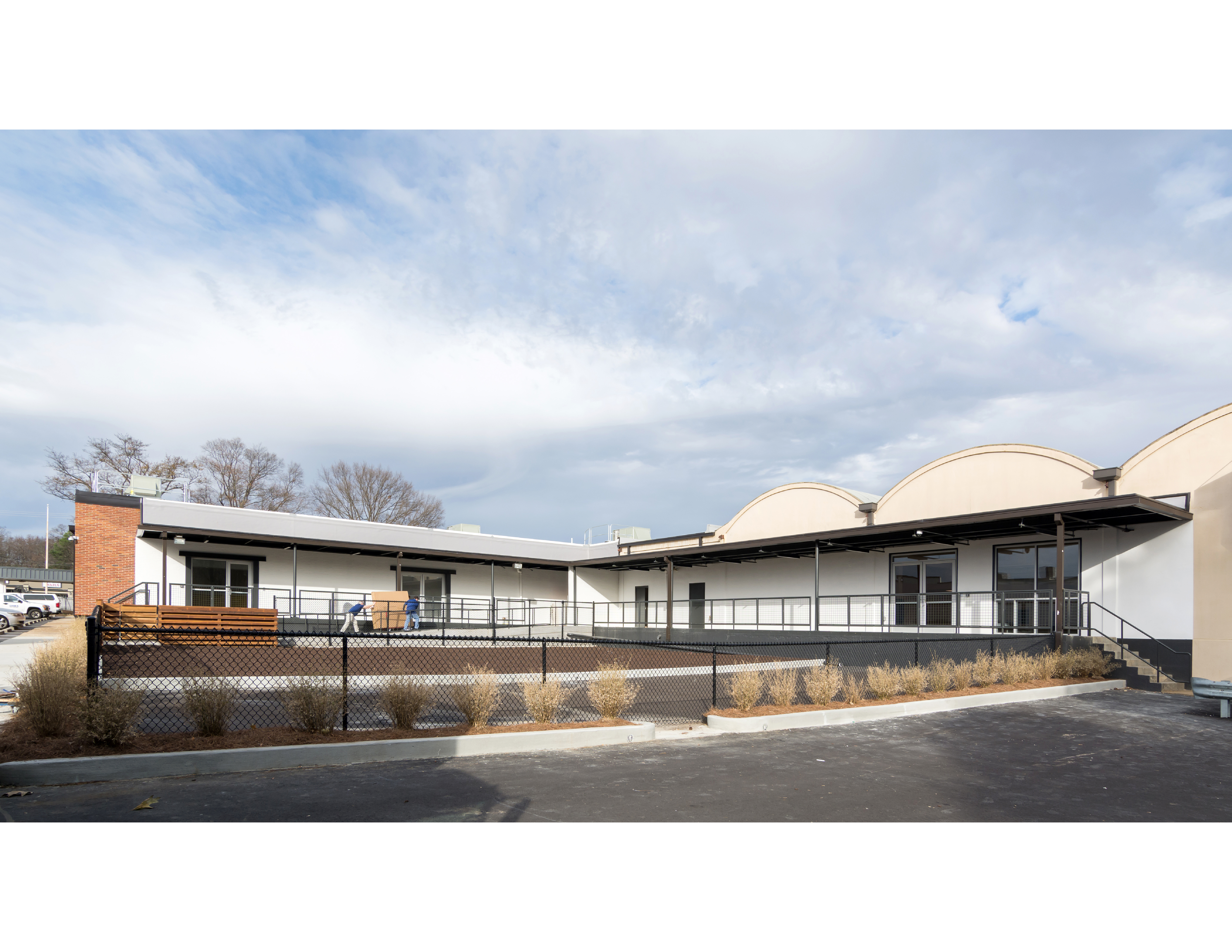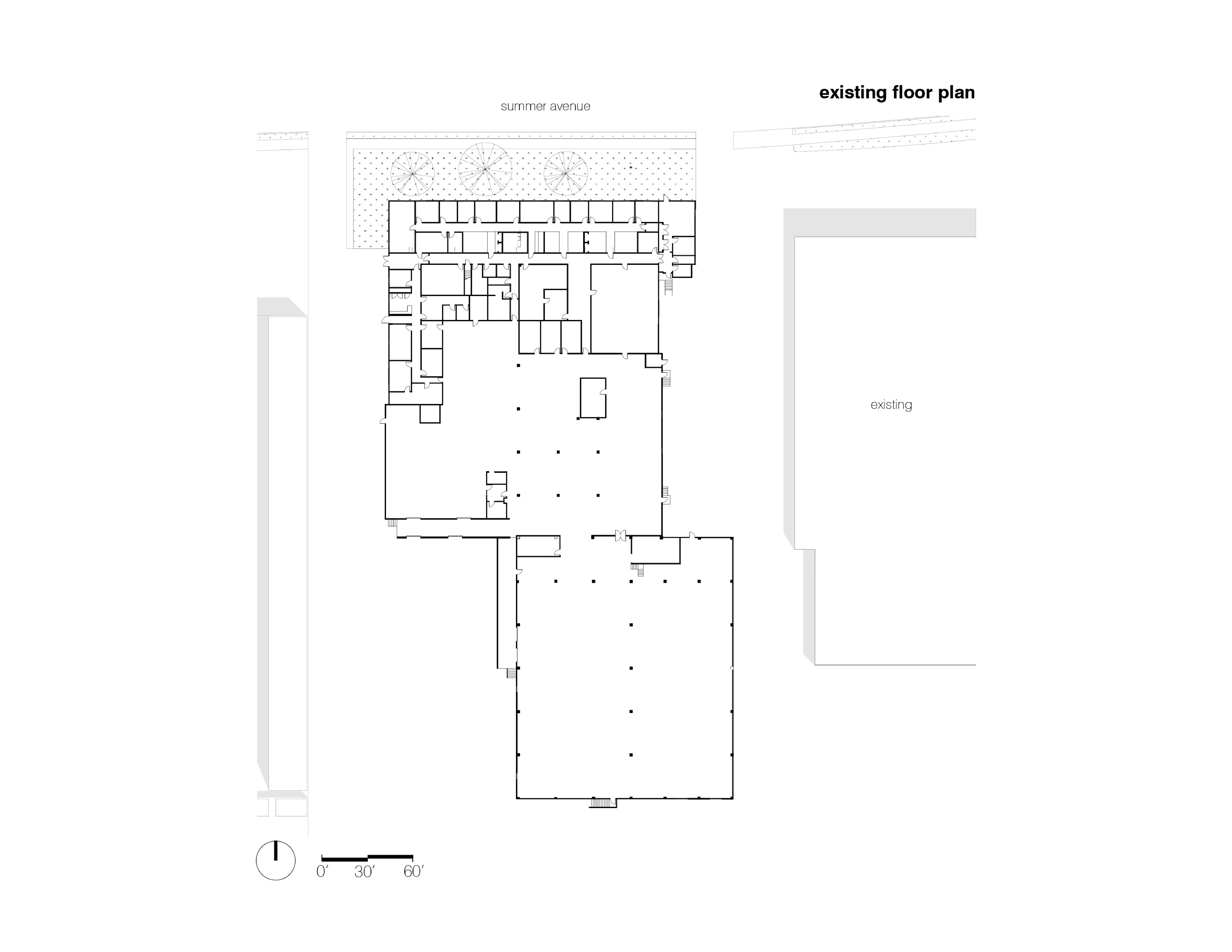 The existing site consisted of a simple, 1960s era brick office building, with a barrel-vaulted concrete warehouse addition attached to the south end of the existing building. The exterior of the building was largely untouched, spruced up by cleaning and new paint, but the interior was transformed entirely, creating a jewel box along the busy Summer Avenue corridor.