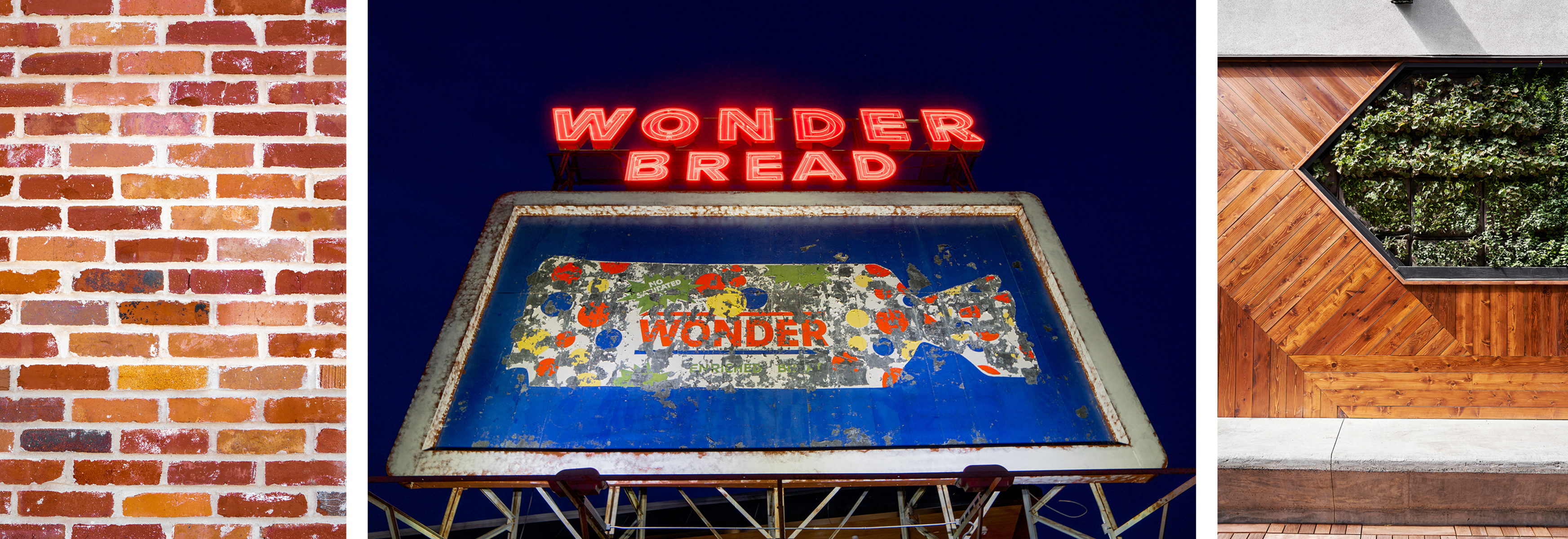 The exterior facade was reconstructed with bricks salvaged from buildings that were part of the existing factory complex. The Wonder Bread sign has been restored, and other creative touches include turning an old flour chute into a chandelier and converting dough beds into raised flower gardens.