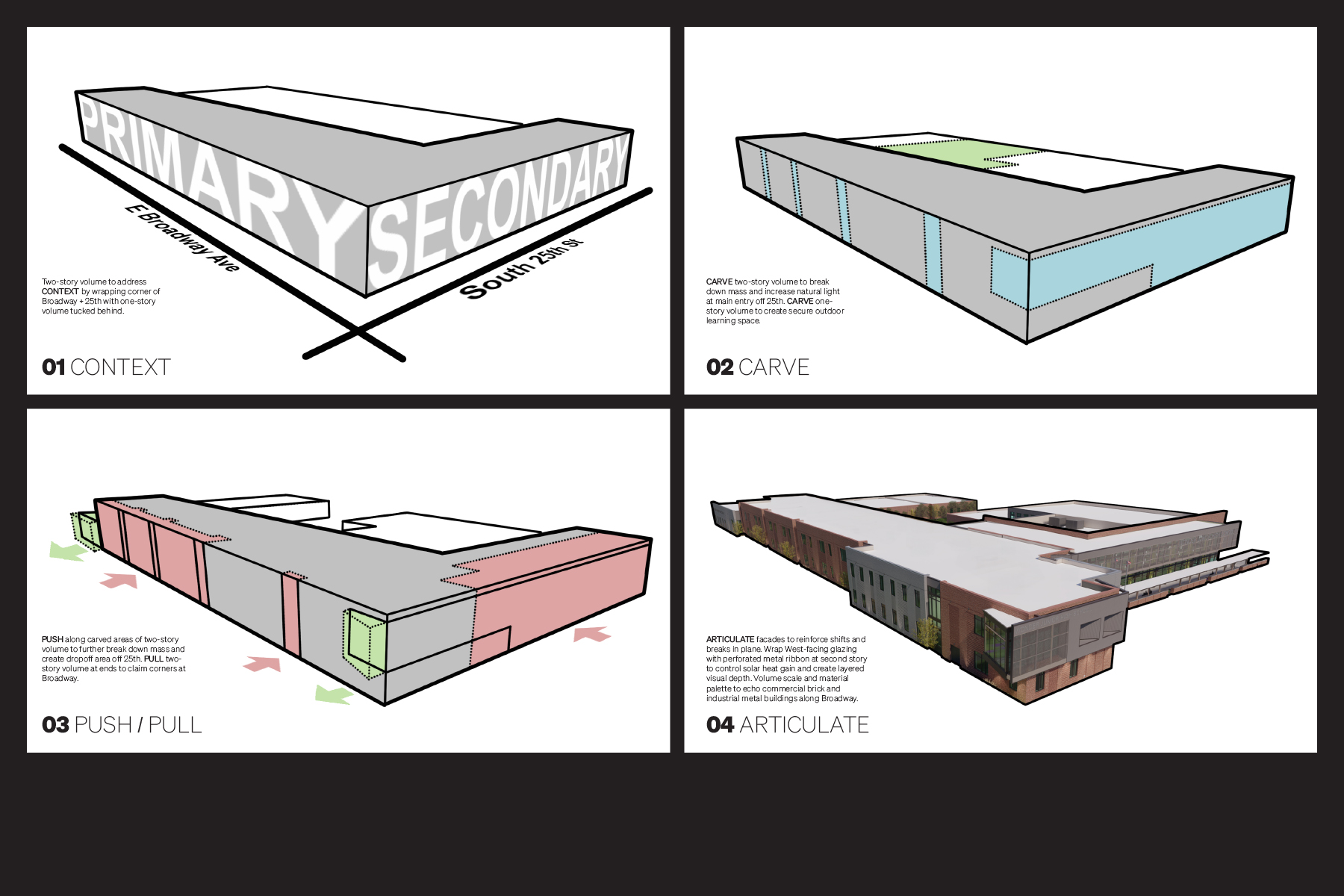 The 13-acre urban site on Broadway Avenue requires sensitivity to the existing street materiality, rhythm and scale. The north façade responds with a series of two-story brick and corrugated metal volumes which are broken down by shifts in material and plane. The West façade, facing the side access road, serves as the front door. It introduces large expanses of perforated metal and glass offering a layered openness that invites students and visitors to its spacious daylit gallery.