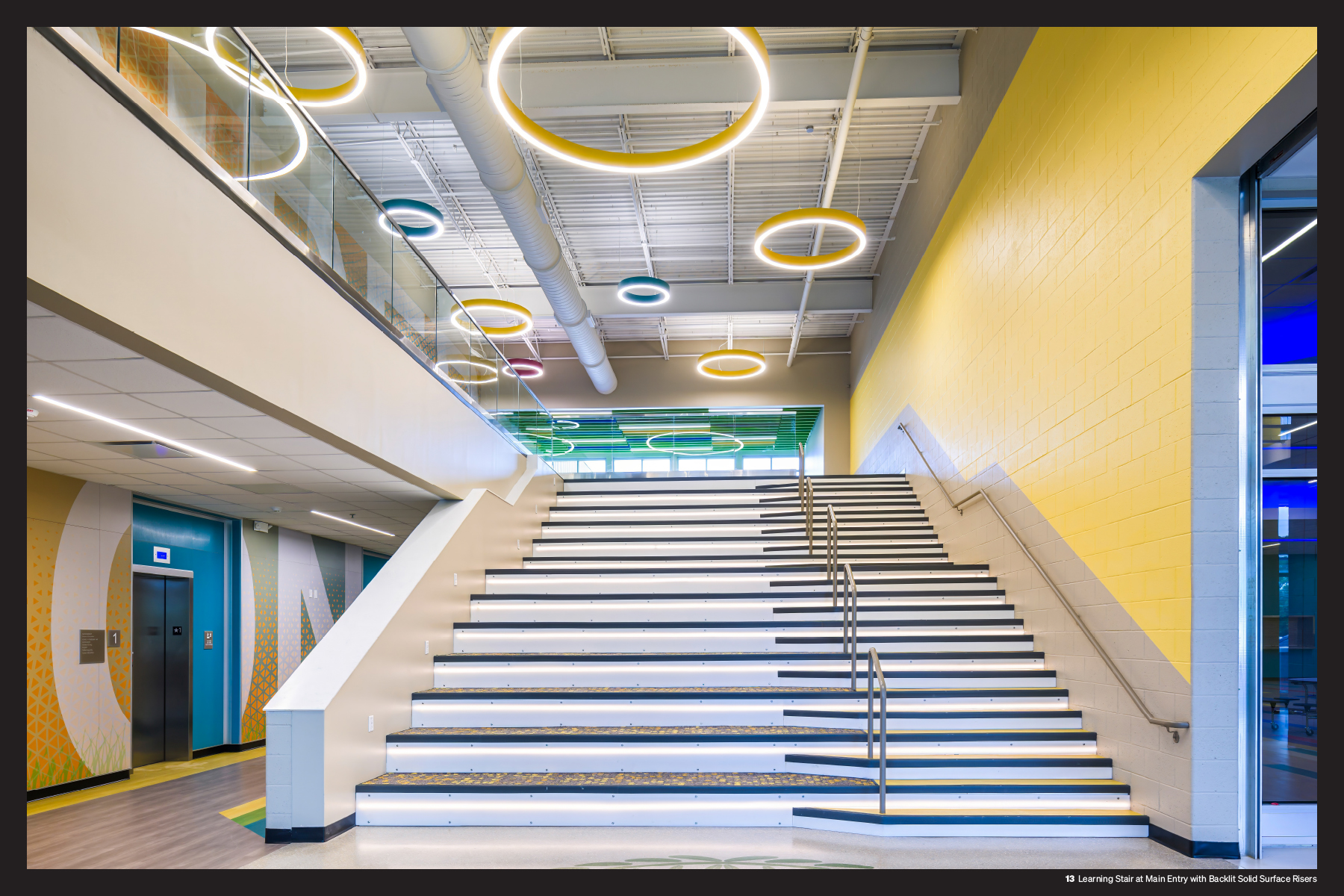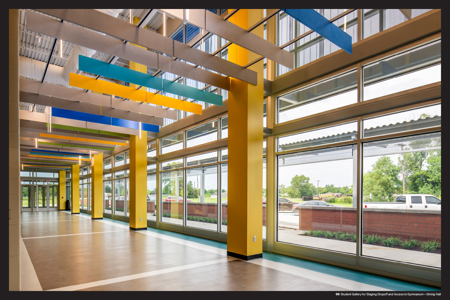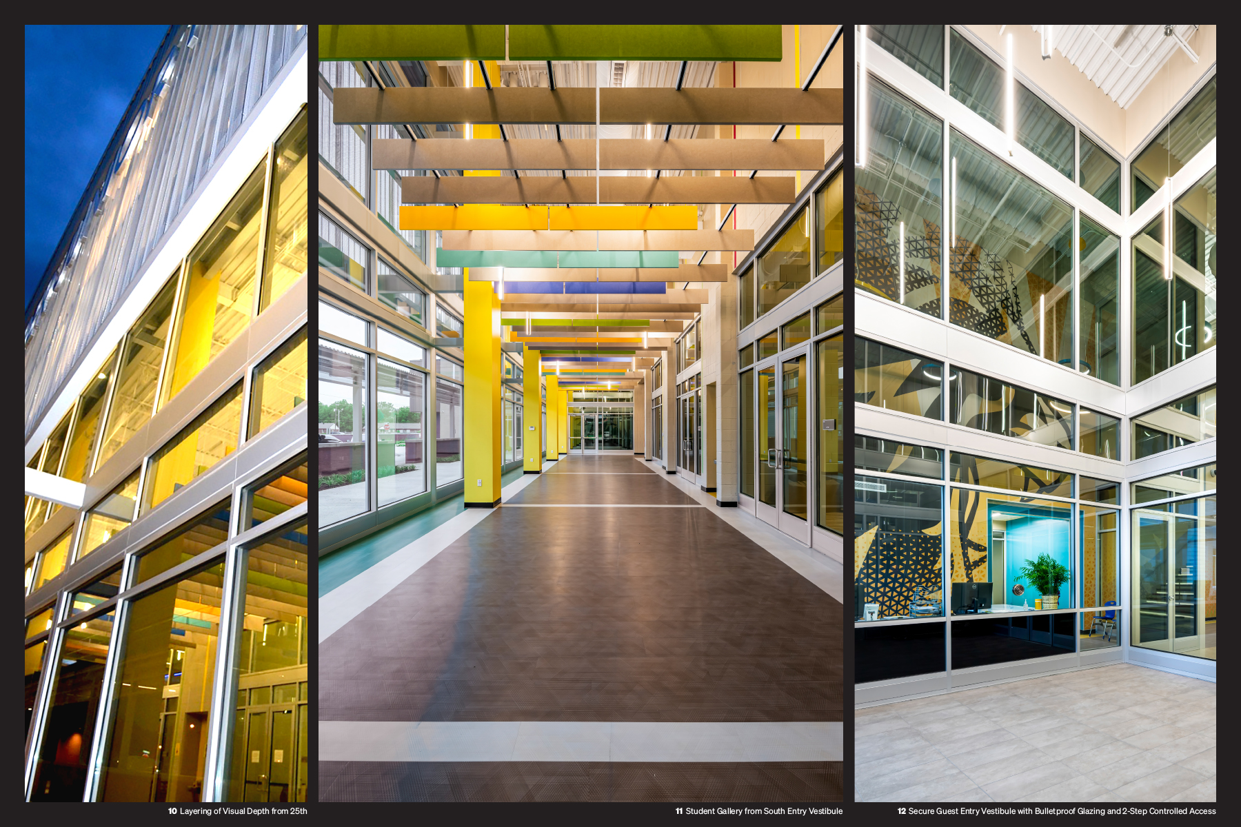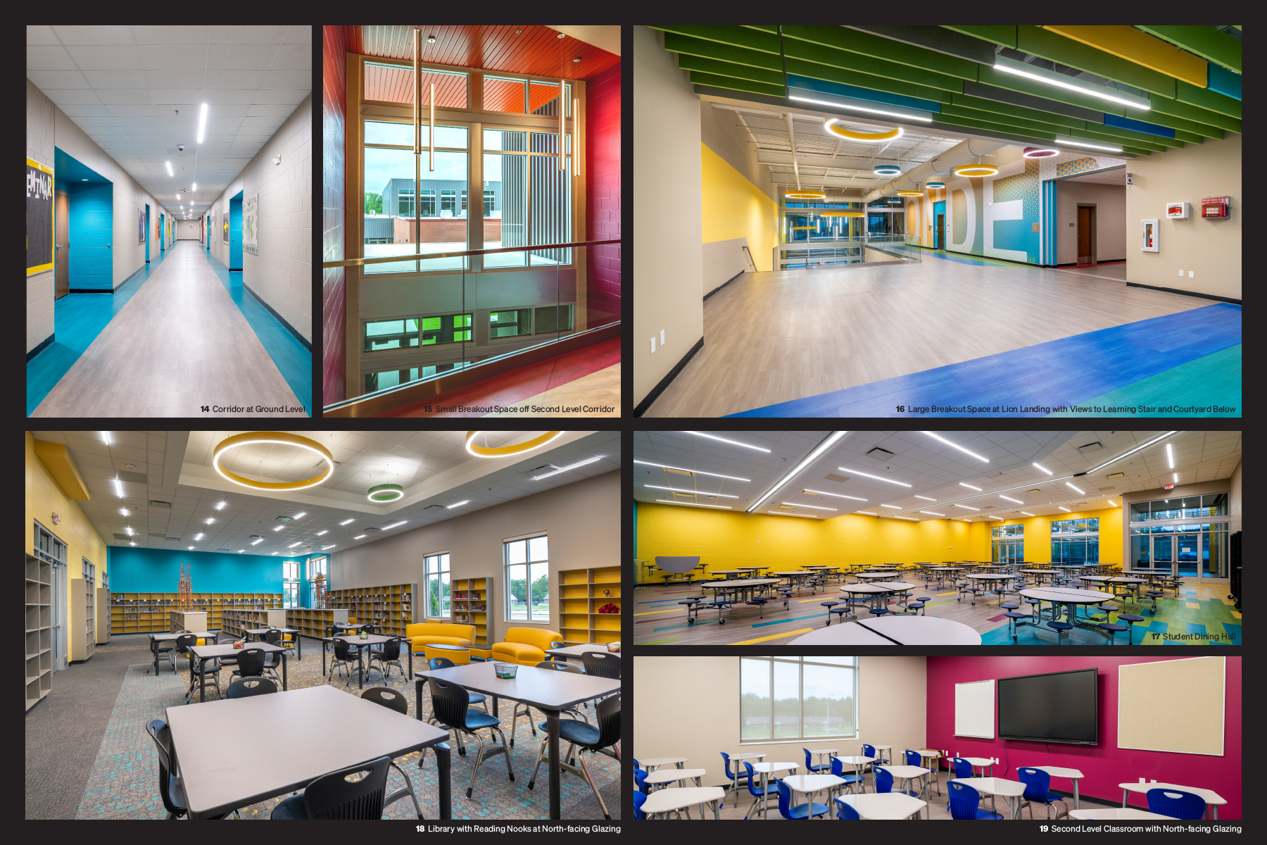The interior spaces are flooded with natural light and color. The vivid palette is carefully curated to boost student and teacher moods, increase attentiveness and stimulate active participation. Intensive consideration to spatial layouts, adjacencies and connections negates acoustical conflicts within the program. Simplified, efficient wayfinding creates safer, controlled circulation patterns in case of an emergency event.