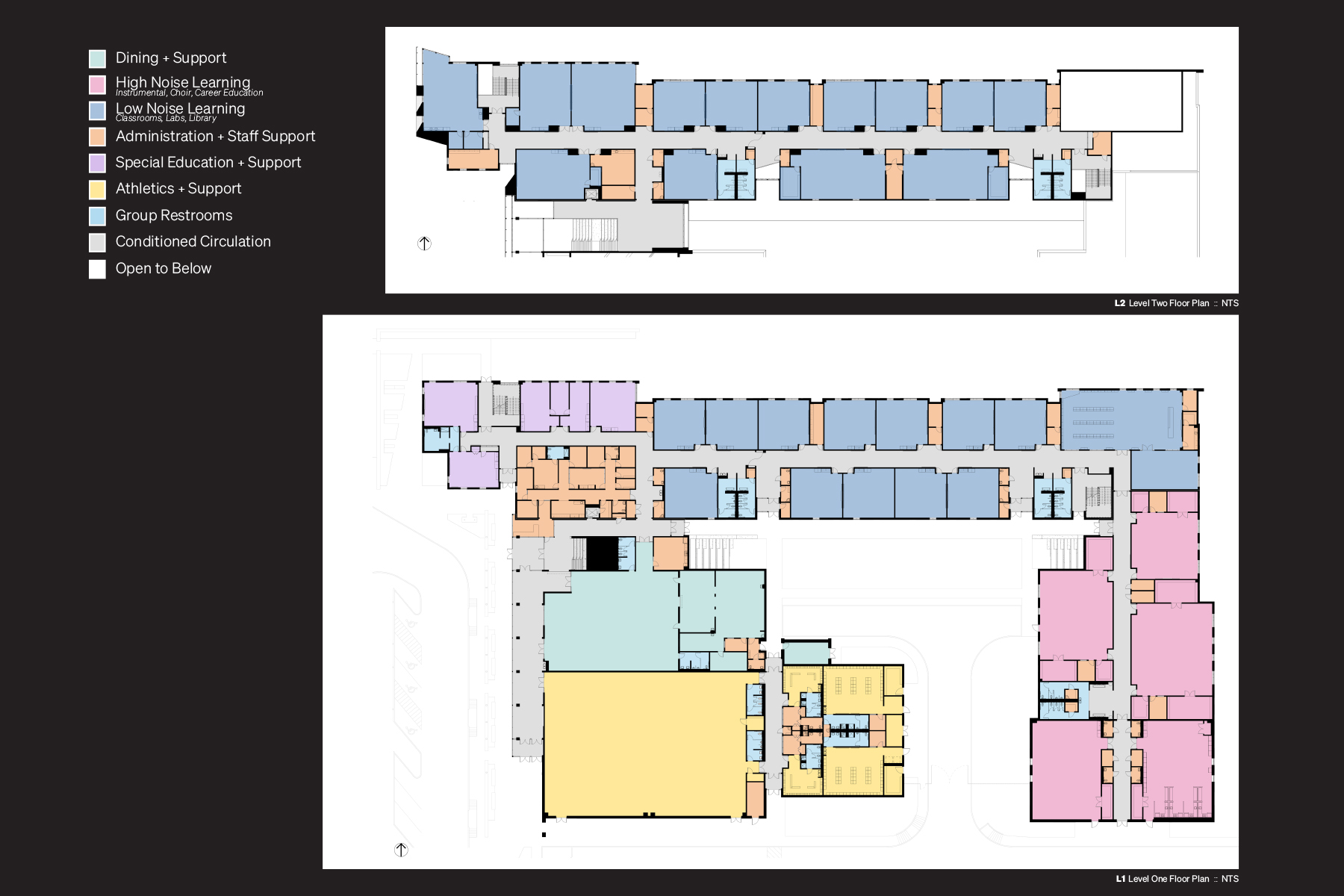 The 110,000 square foot facility is designed for a strong connection between outdoor and indoor spaces, encouraging interaction with nature throughout the school day. Strategic daylighting principles will reduce energy costs while increasing student and teacher performance. The school serves 623 students in grades 7-9 with high-tech classrooms, flexible breakout spaces, outdoor learning spaces, indoor/outdoor PE facilities, secure courtyard, media center, health center and full commercial kitchen.