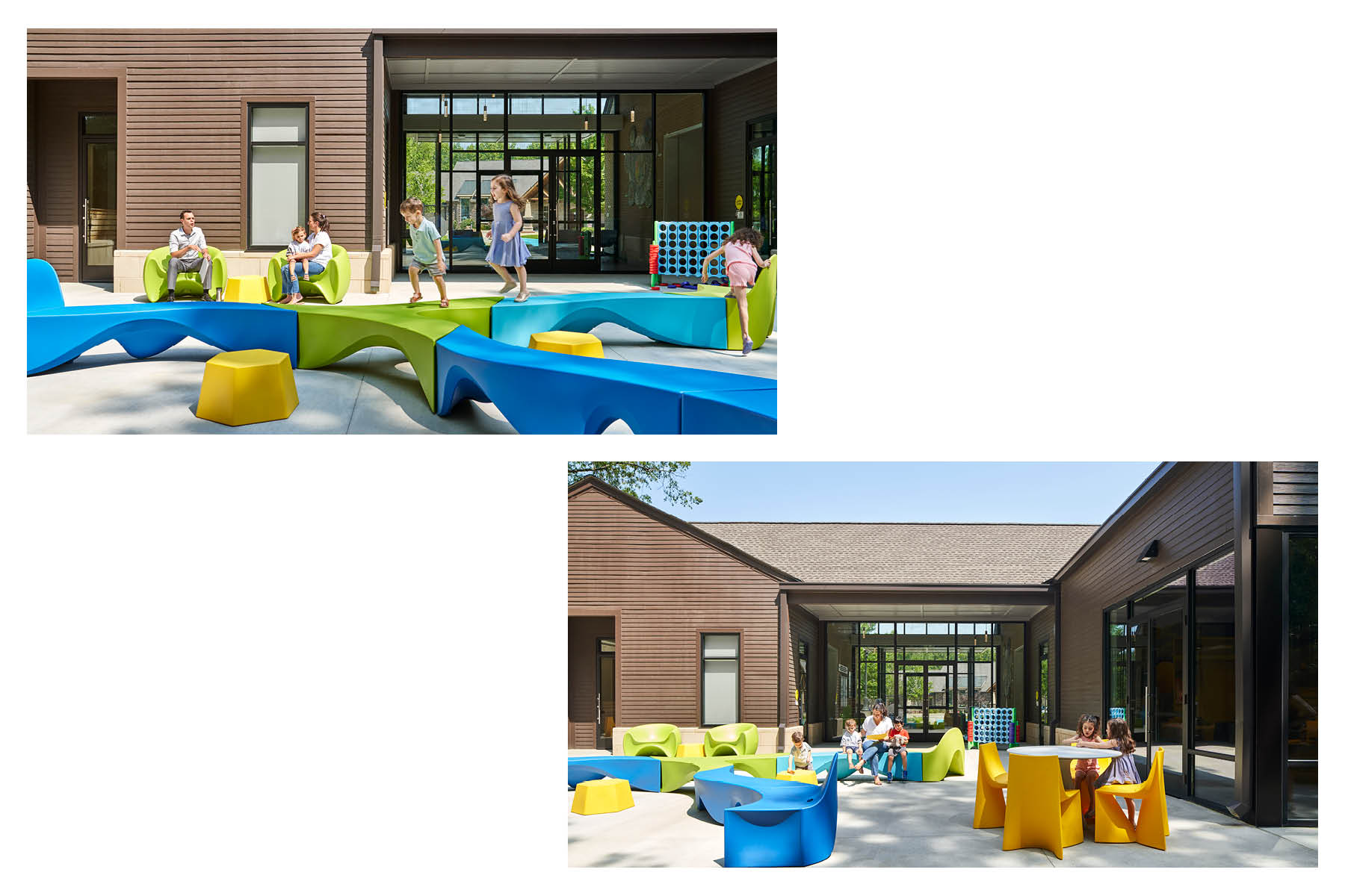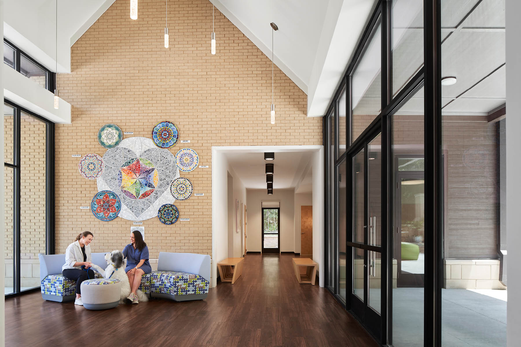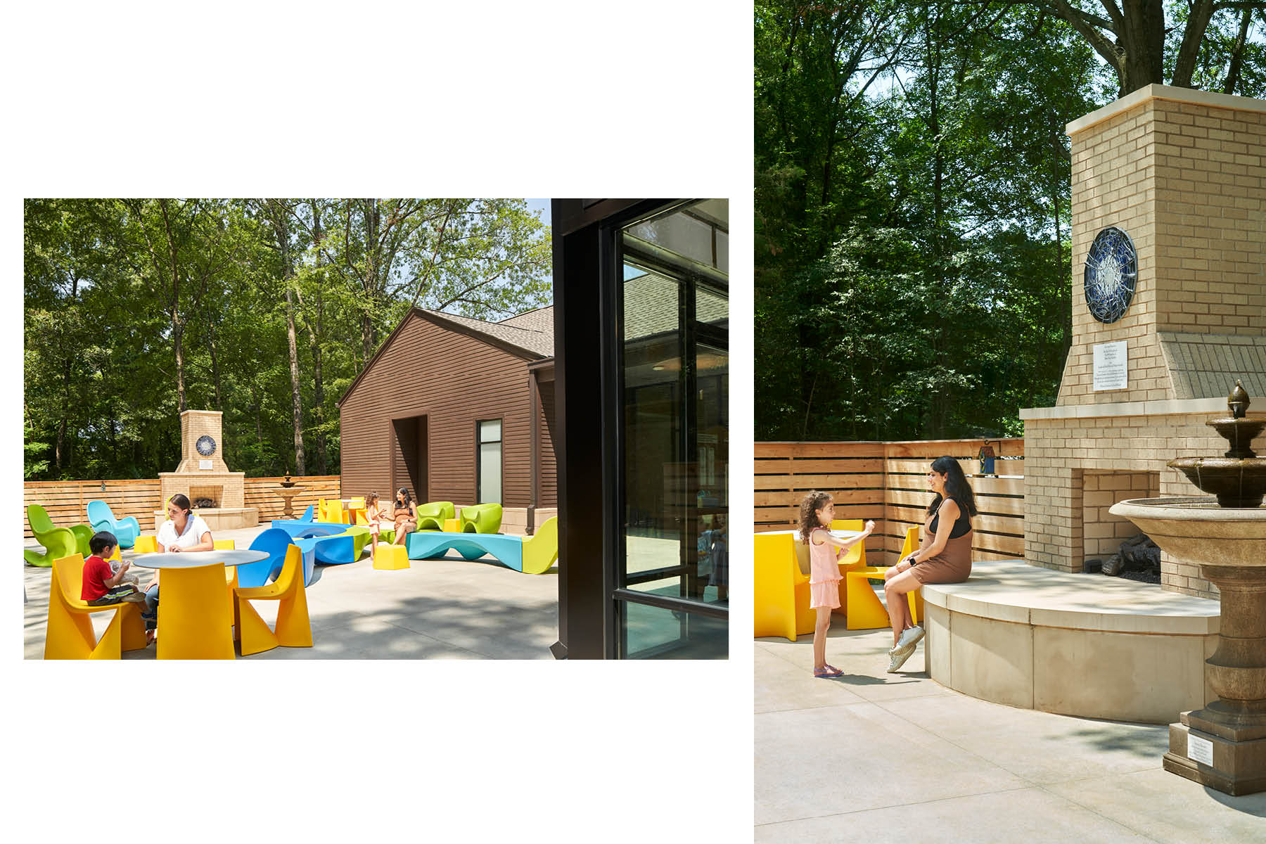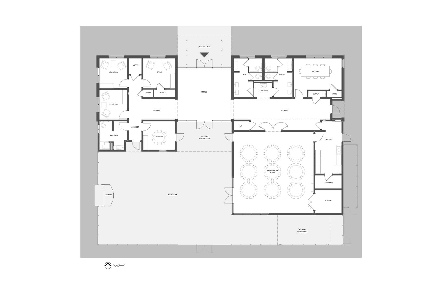 The new 4,600-square-foot Cottage includes a multipurpose gathering space, catering kitchen, individual counseling rooms, and an outdoor gathering area designed to accommodate counseling services in a group or camp format. The building parti is informed by multiple uses of the project, divided between a semi-private wing and public wing that can be opened up be used together when needed, meeting at the atrium and connected outside through a courtyard.