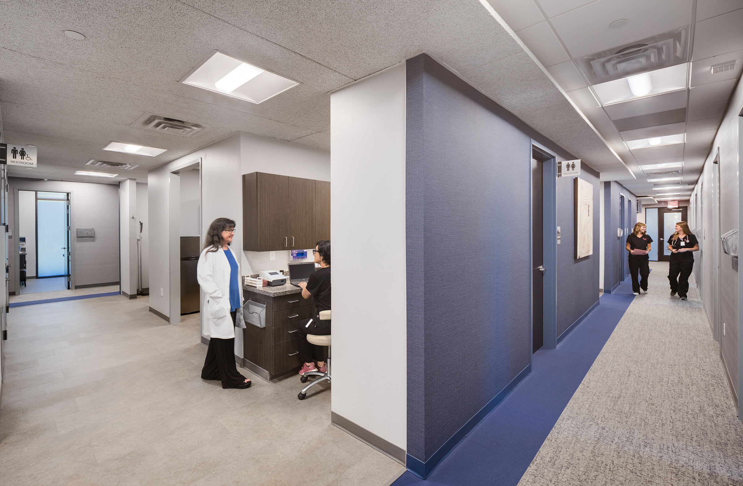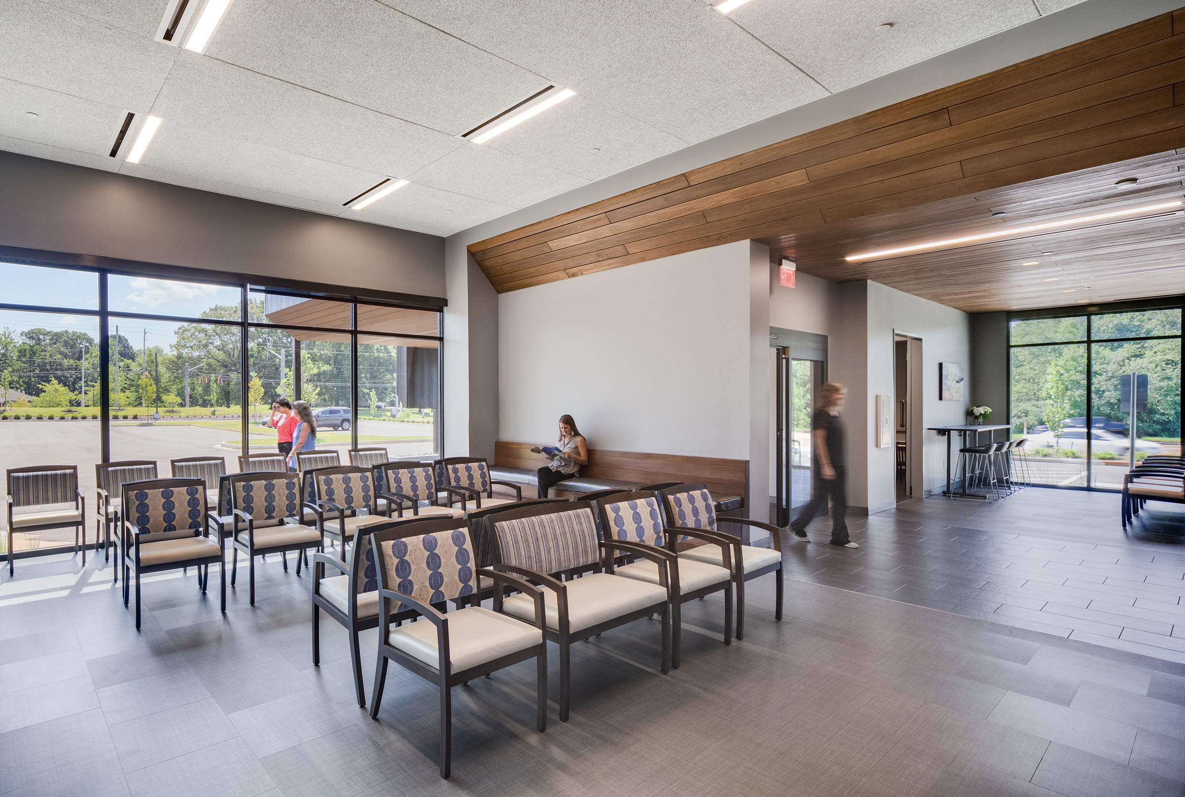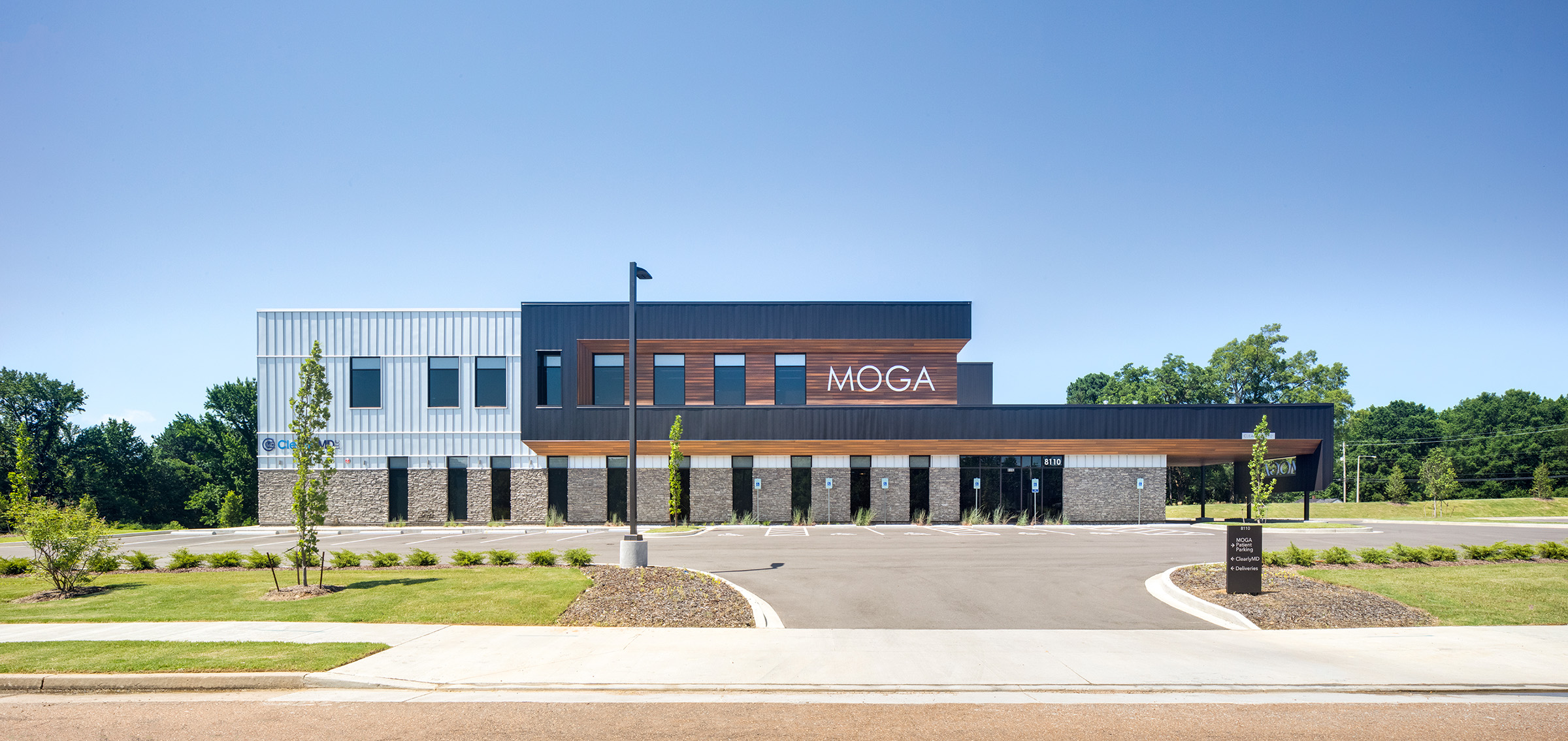 A new clinic and administrative headquarters for Memphis’ premier OB/GYN group. The linear building plan responds to the geometry of the property. The exterior is grounded with a consistent stone base and topped out with a metallic crown. The massing is accentuated with a darker toned metal ribbon and wood cladding. The main entrance is tucked beneath the drive-thru drop-off canopy. The wood-clad ceiling of the drive-thru extends into the waiting area and defines the entry and check-in path. Within the clinical zones, color is used to demark staff and work areas and differentiate them from patient areas. Patient exam rooms are wrapped around the blue shared work areas. The second floor serves as the administrative offices and meeting areas. A large break room punctuates the rear corner of the second level where juliet balconies offer the ability to open up to the outdoors.