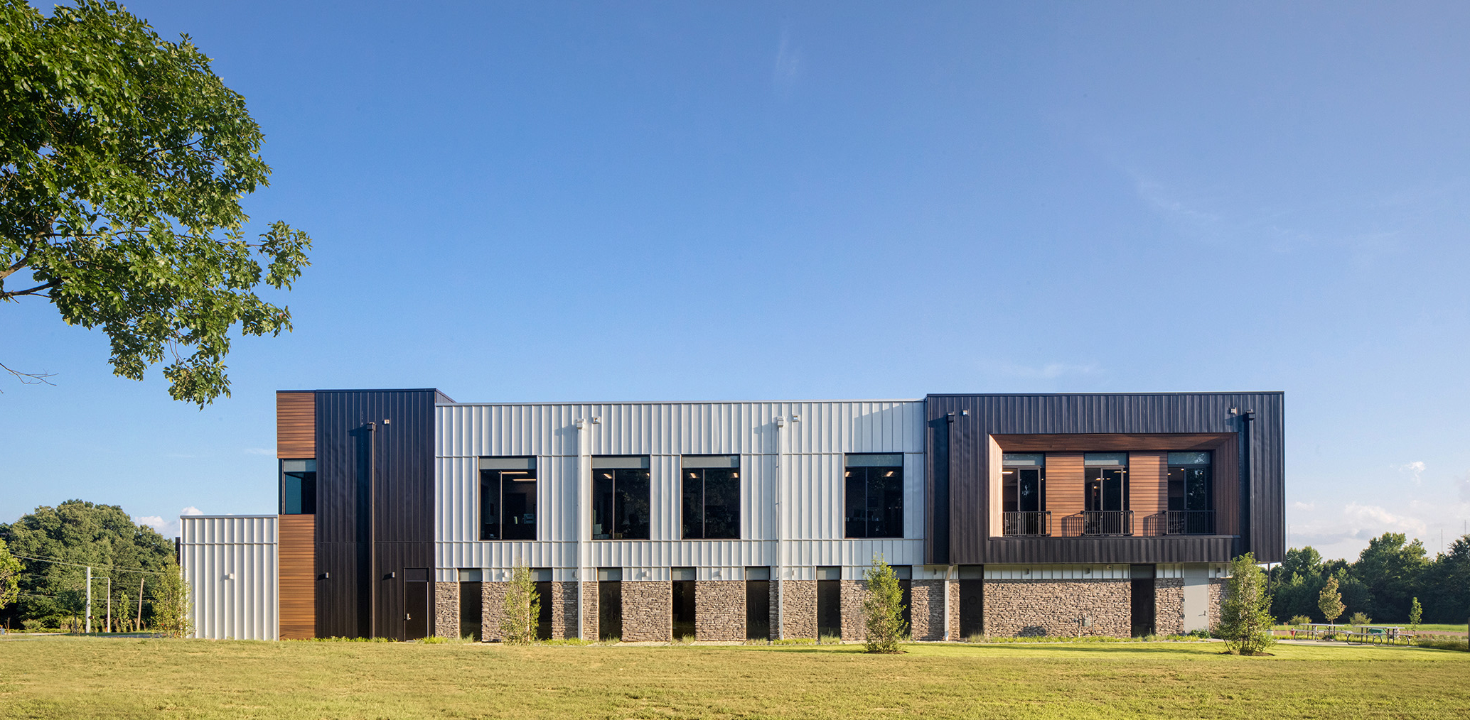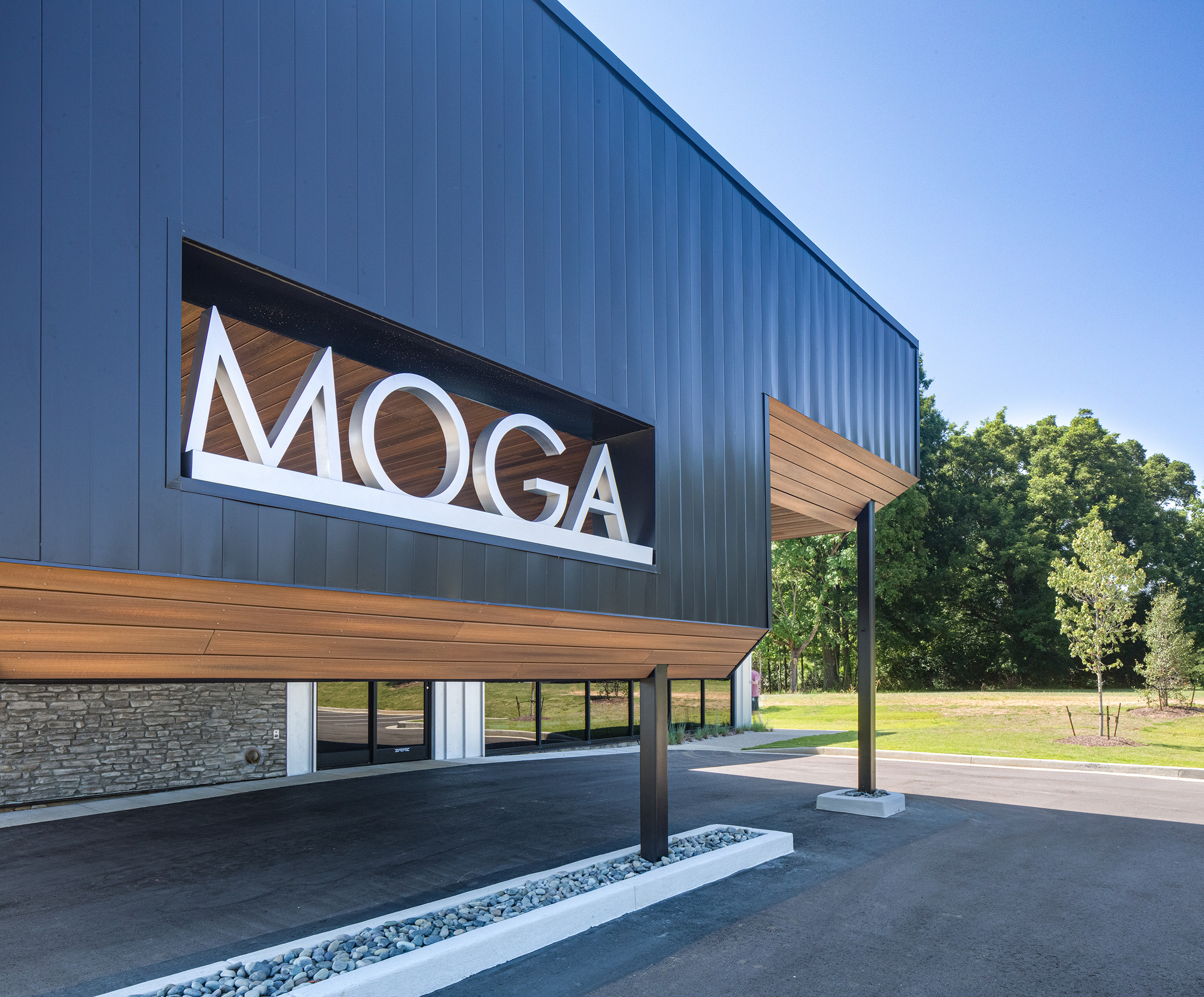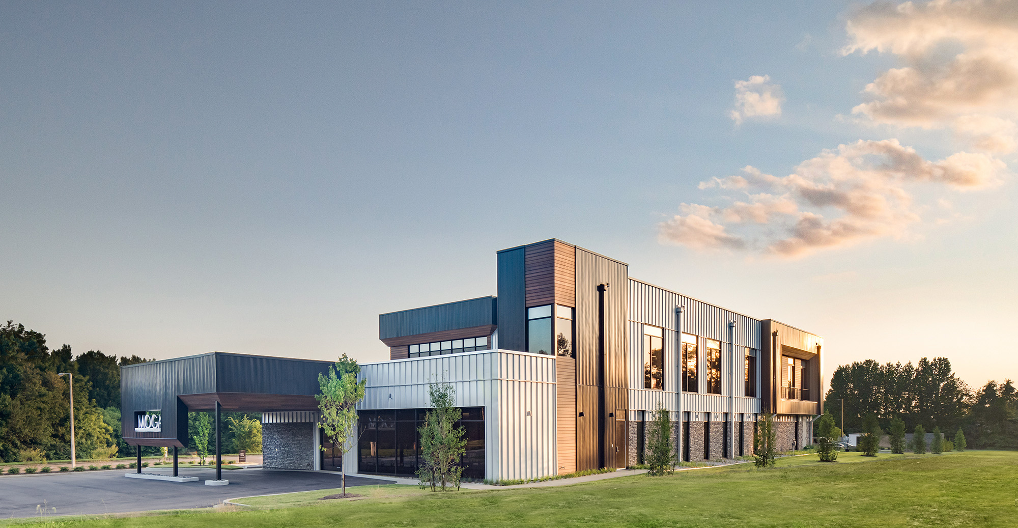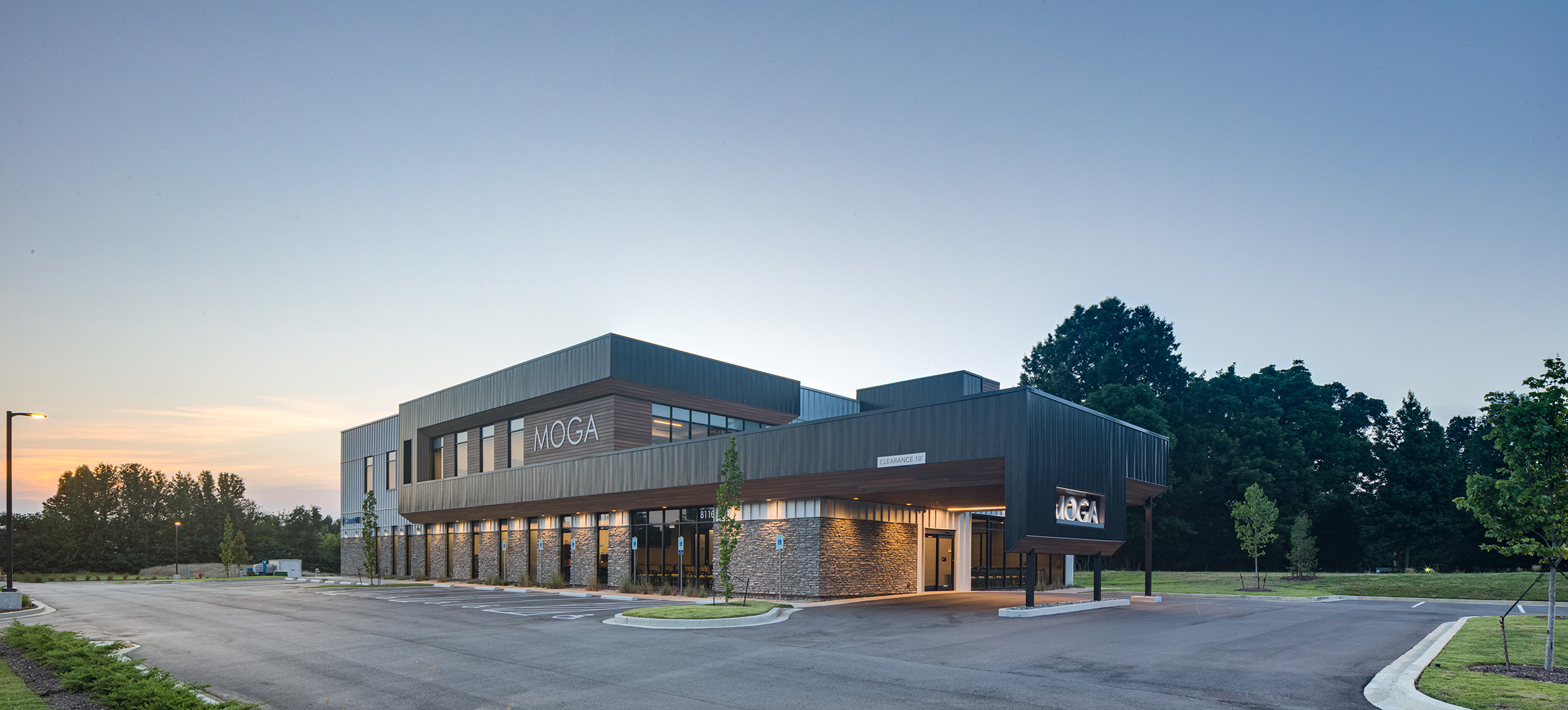 A new clinic and administrative headquarters for Memphis’ premier OB/GYN group. The linear building plan responds to the geometry of the property. The exterior is grounded with a consistent stone base and topped out with a metallic crown. The massing is accentuated with a darker toned metal ribbon and wood cladding. The main entrance is tucked beneath the drive-thru drop-off canopy. The wood-clad ceiling of the drive-thru extends into the waiting area and defines the entry and check-in path. Within the clinical zones, color is used to demark staff and work areas and differentiate them from patient areas. Patient exam rooms are wrapped around the blue shared work areas. The second floor serves as the administrative offices and meeting areas. A large break room punctuates the rear corner of the second level where juliet balconies offer the ability to open up to the outdoors.