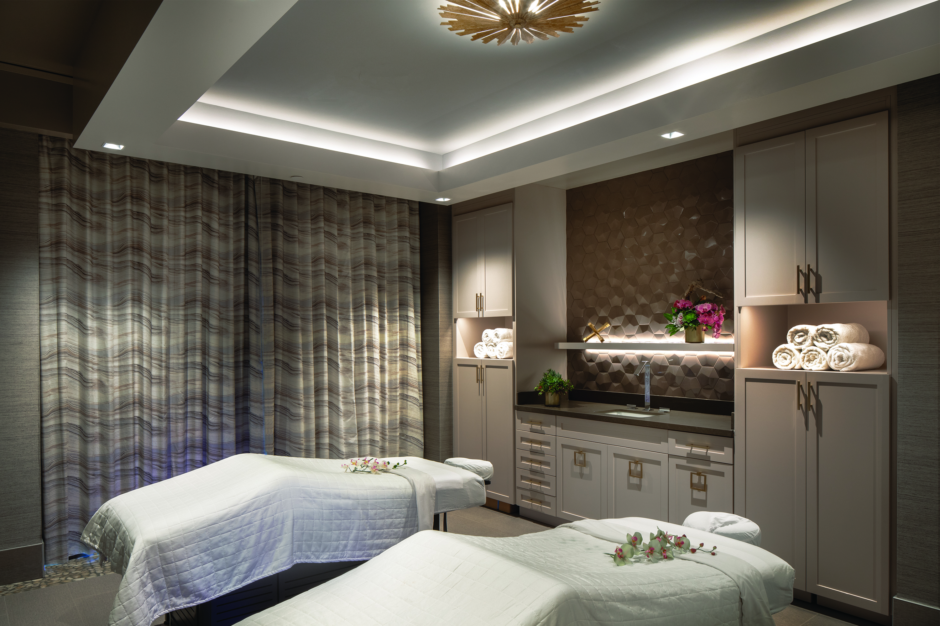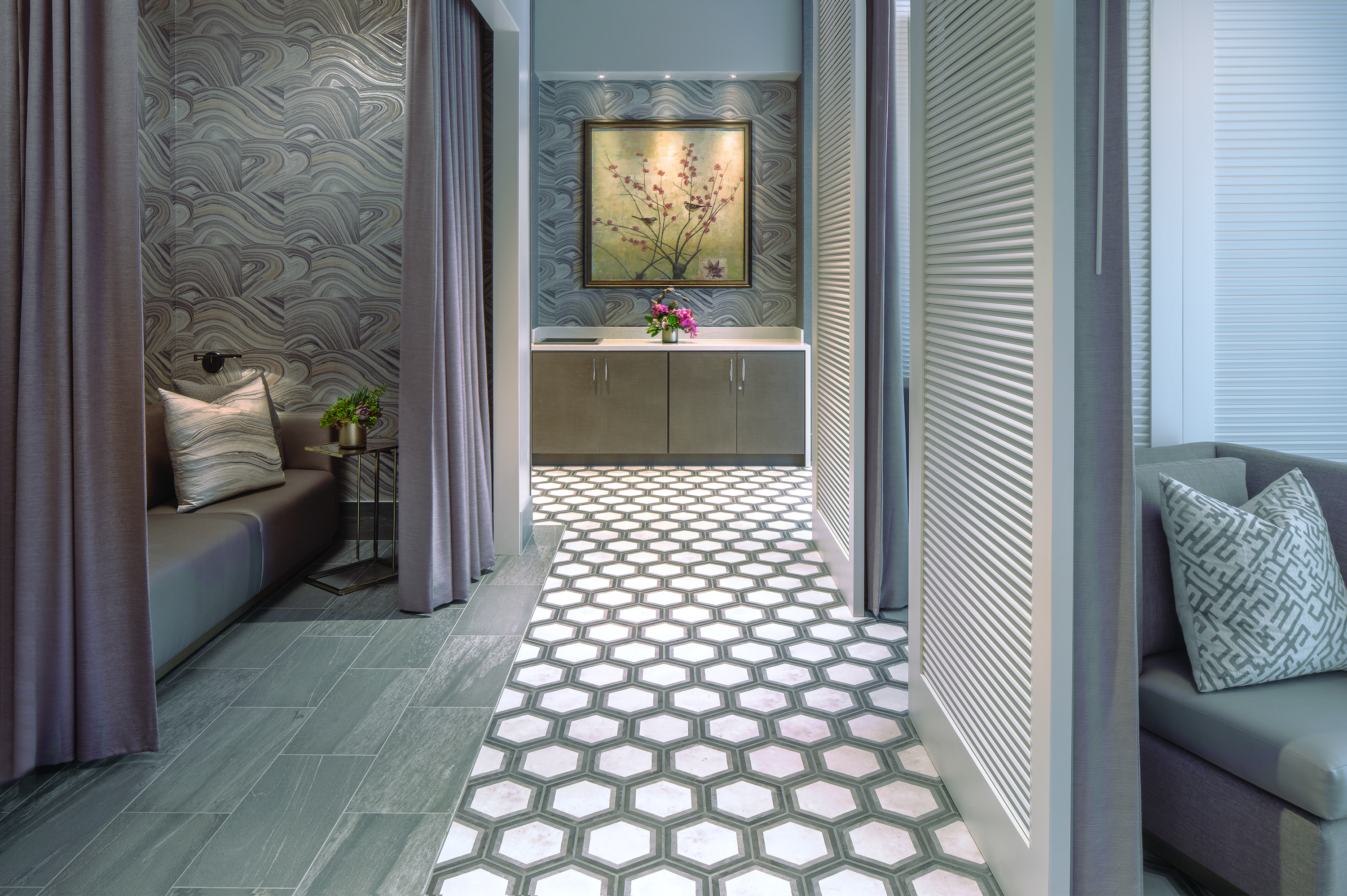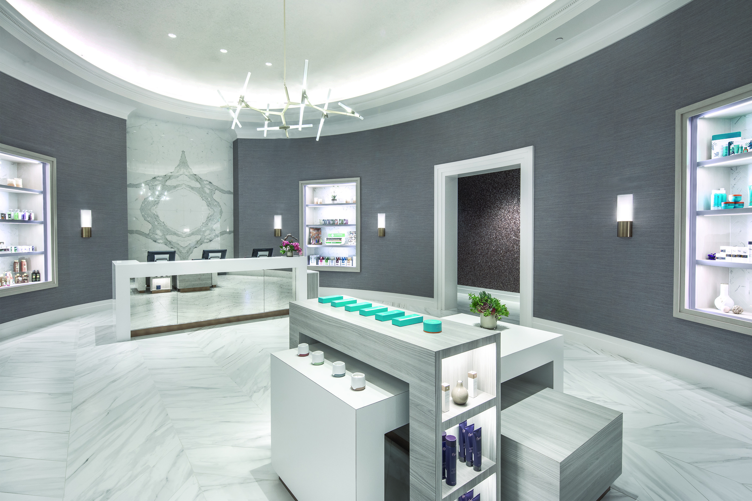 Offering a high-end, elegant residential feel, the spa reception and treatment areas blend a rejuvenating palette of French gray and neutral tones with organic upholstery, textural wallcovering, book matched marble look porcelain slabs, dimensional wall tile and a coffered ceiling clad in silver leaf wallcovering.