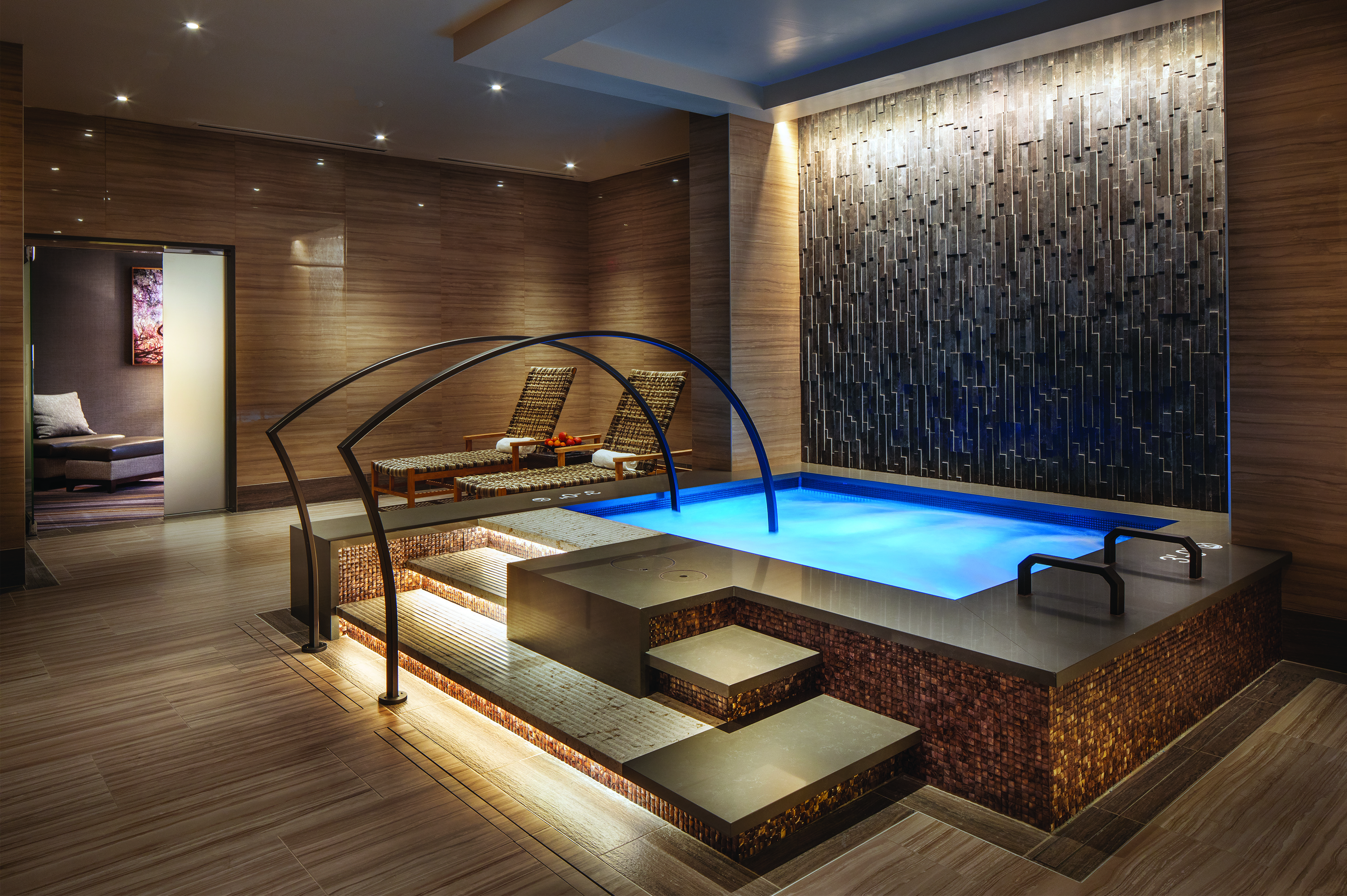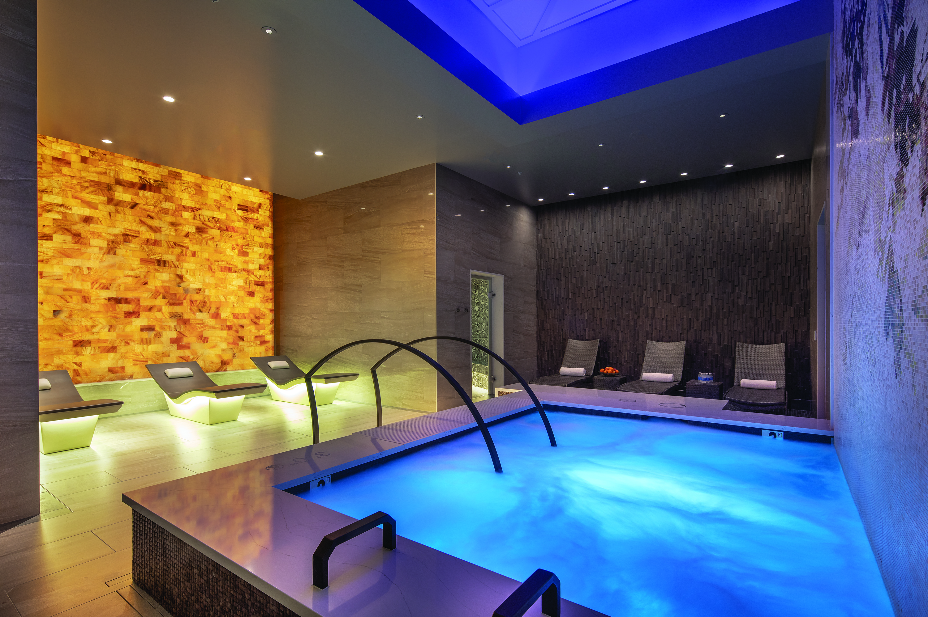 7. A floor to ceiling Himalayan salt wall with heated loungers completes the ultraluxe experience in the women’s aquathermal area. Photo by Peter Malinowski