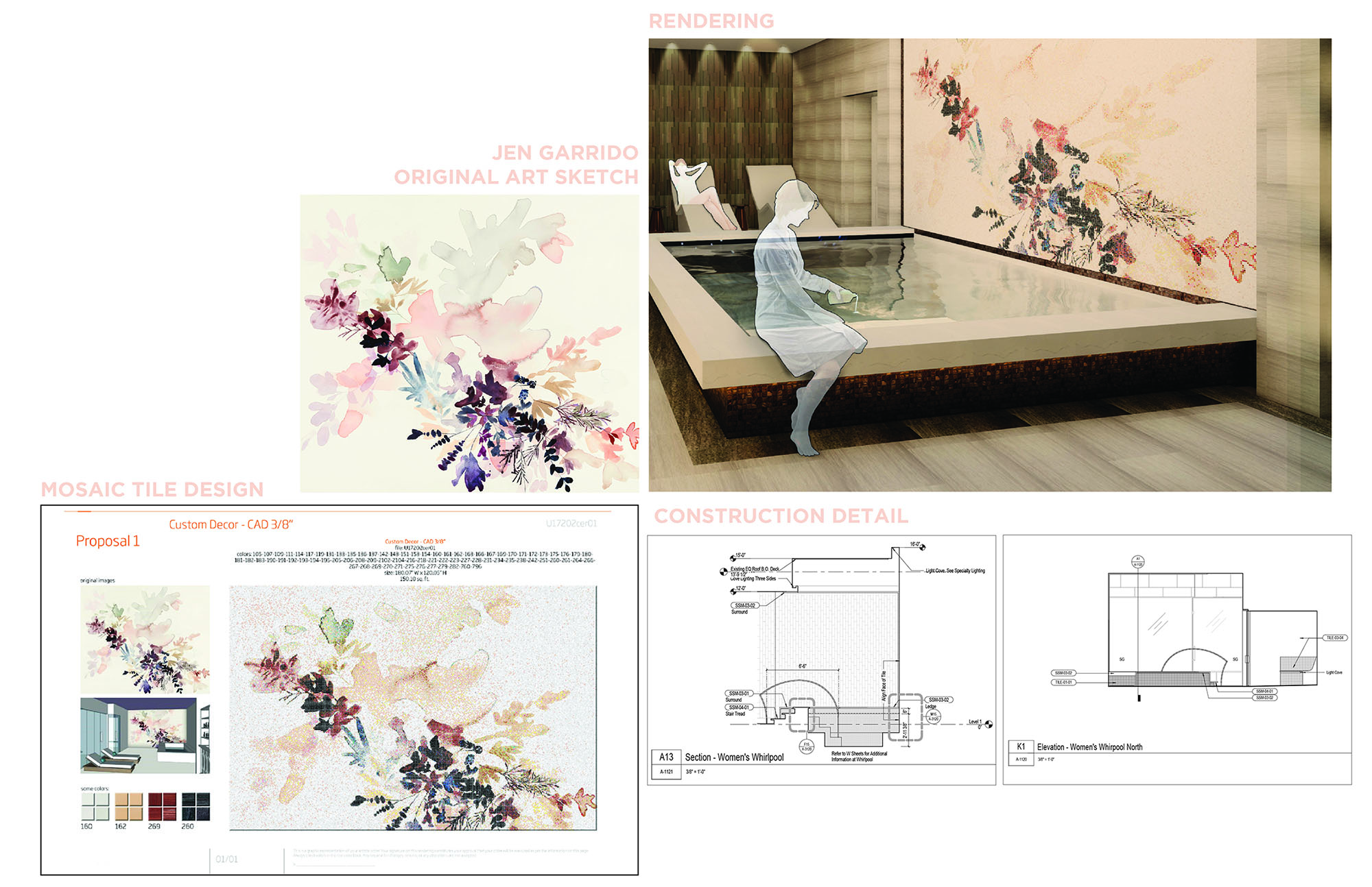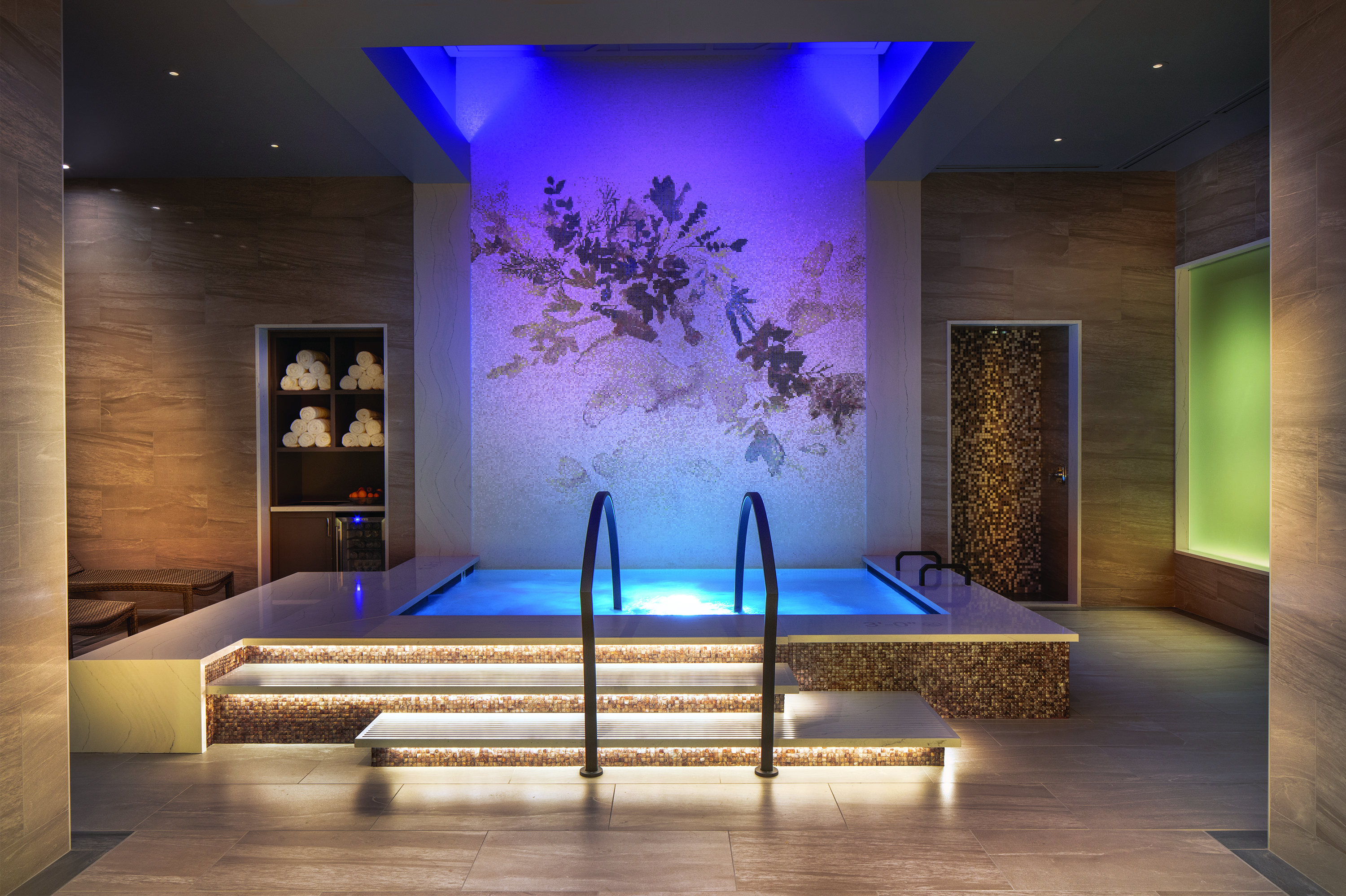 6. A custom mosaic tile feature wall derived from a watercolor piece by local Bay Area artist Jen Garrido is the backdrop for the women’s aquathermal area where guests can enjoy a soak in the whirlpool or relax in the sauna. Photo by Peter Malinowski
