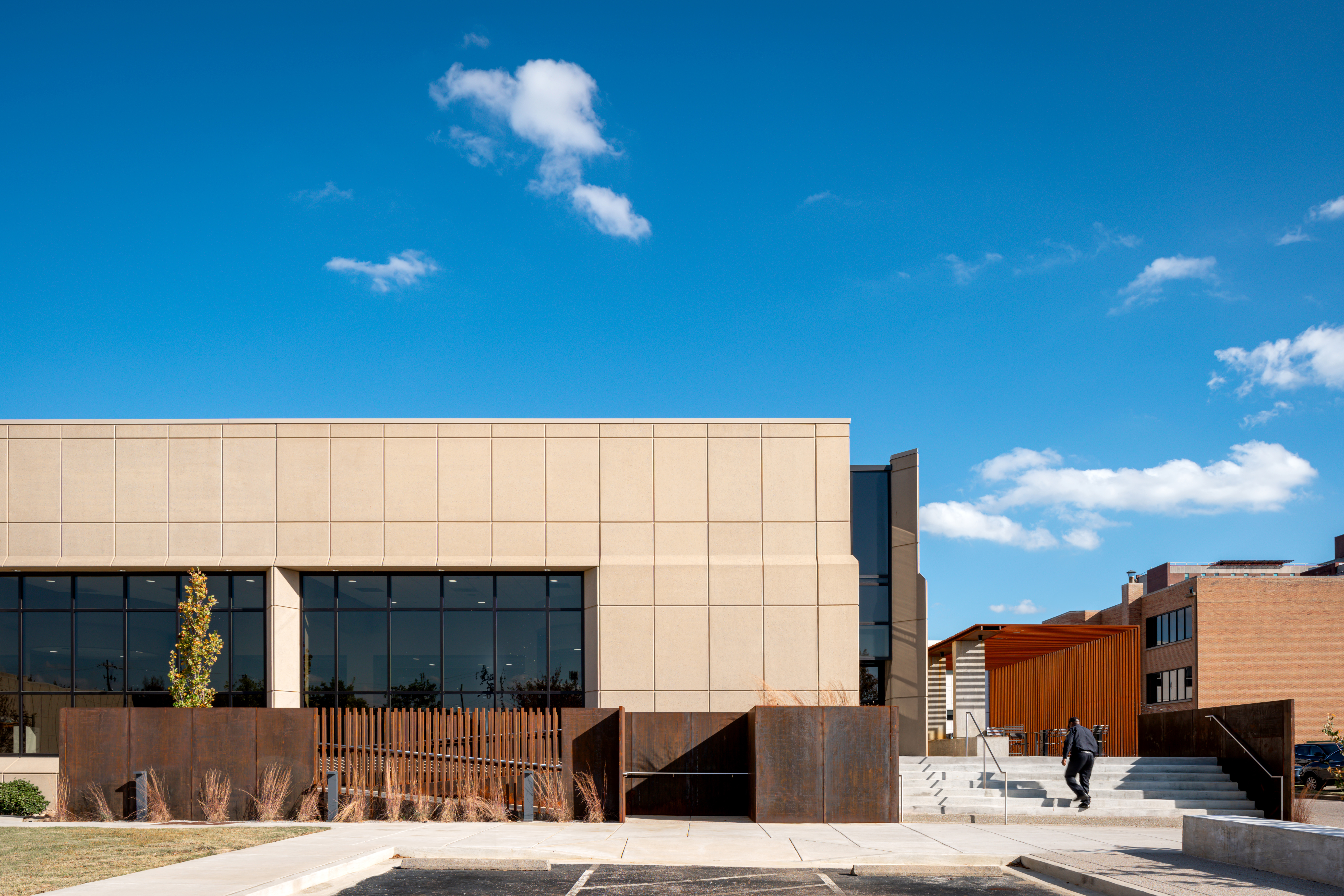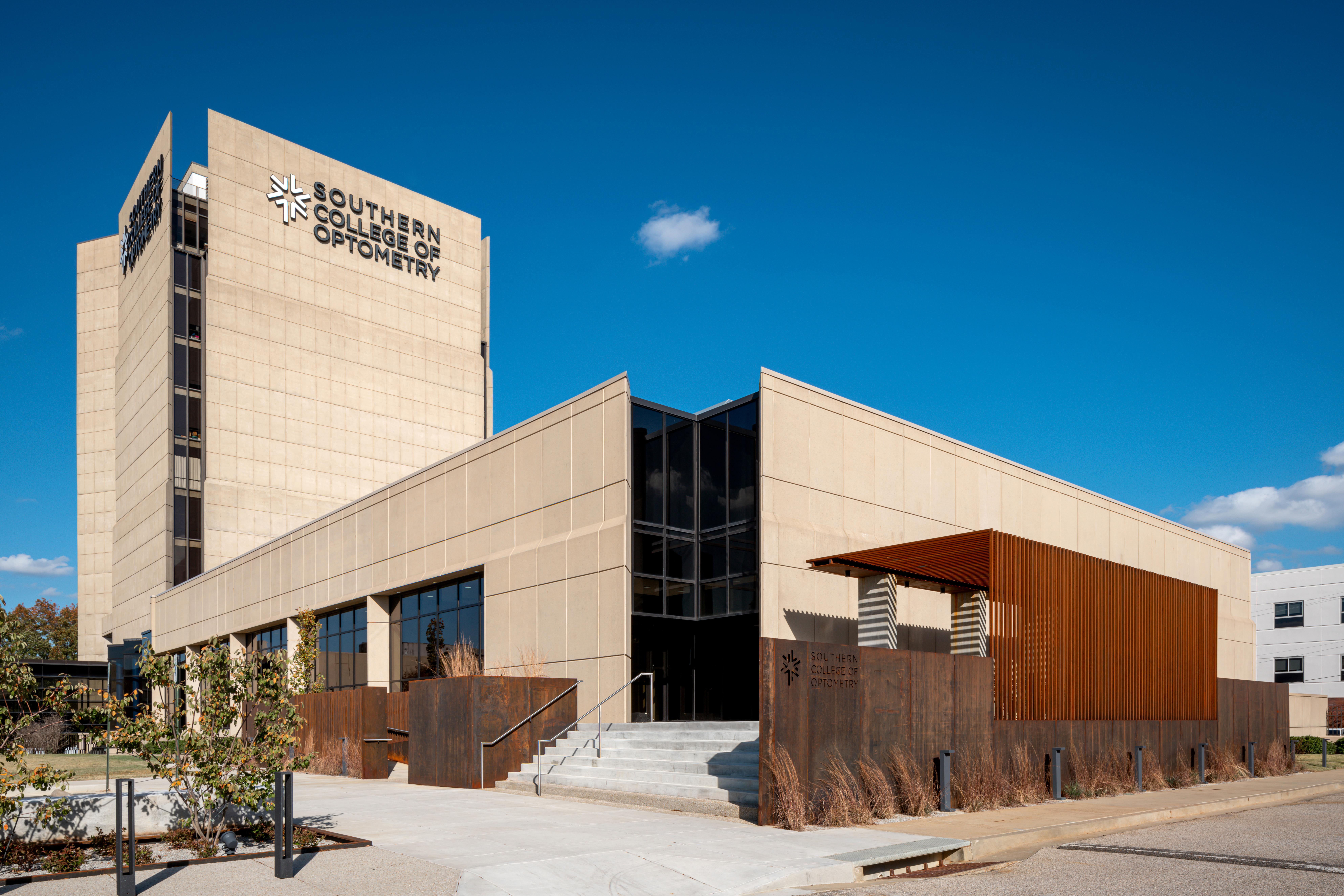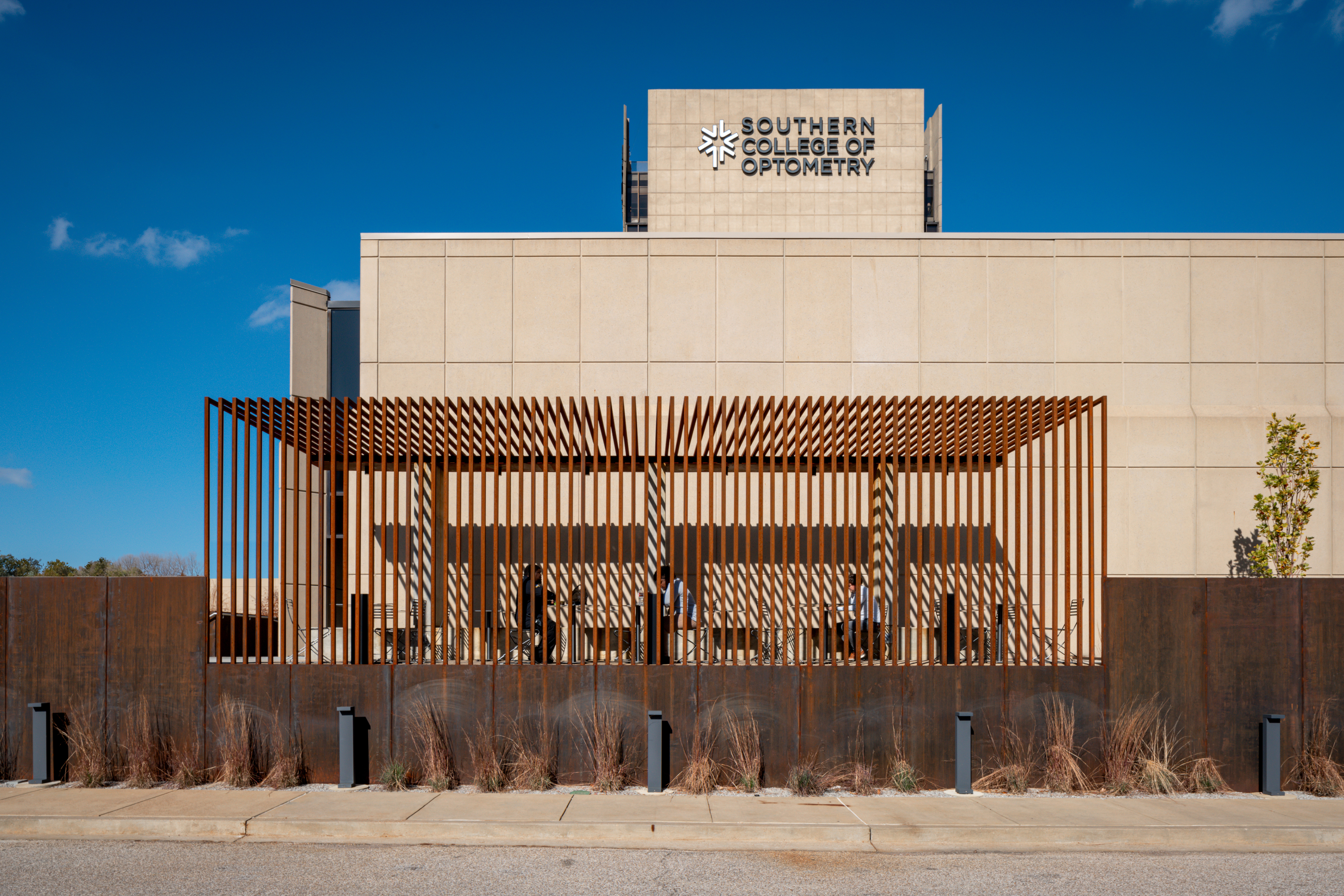 An intervention borne out of identity and hierarchy was conceived to ground and broaden the identity of the campus by providing a south anchor to the classroom building entrance. As a primary entrance used daily for administration, faculty, staff, and many students, the design sought to utilize weathering steel and landscape planters to warm and soften the brutalist concrete palette that dominates throughout this campus. Carefully scaled axial walls dematerialize to a porous screen enclosure while opening to the celebrated landscape. A rigorous rhythm of the picketed shade pavilion provides louvered protection from the southern exposure while negotiating an experience of connection to context and refuge in solace. This low maintenance intervention provides scale, detail, delight and discovery through a simple deployment of weathering steel, concrete, and landscaping. The project establishes a series of spaces for campus patrons to extend their daily options for places to connect with nature and experience the outdoors on a clinical higher education campus.