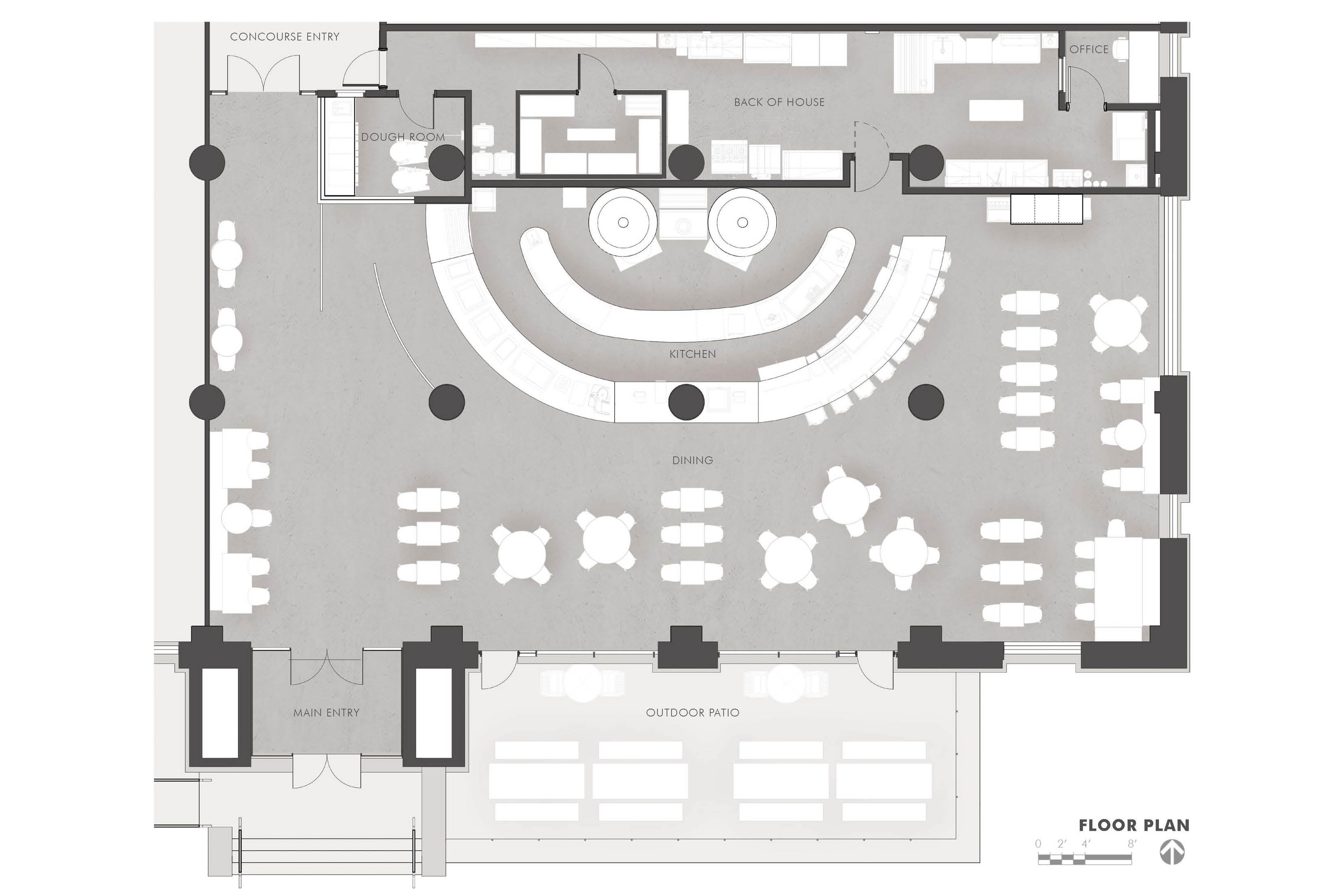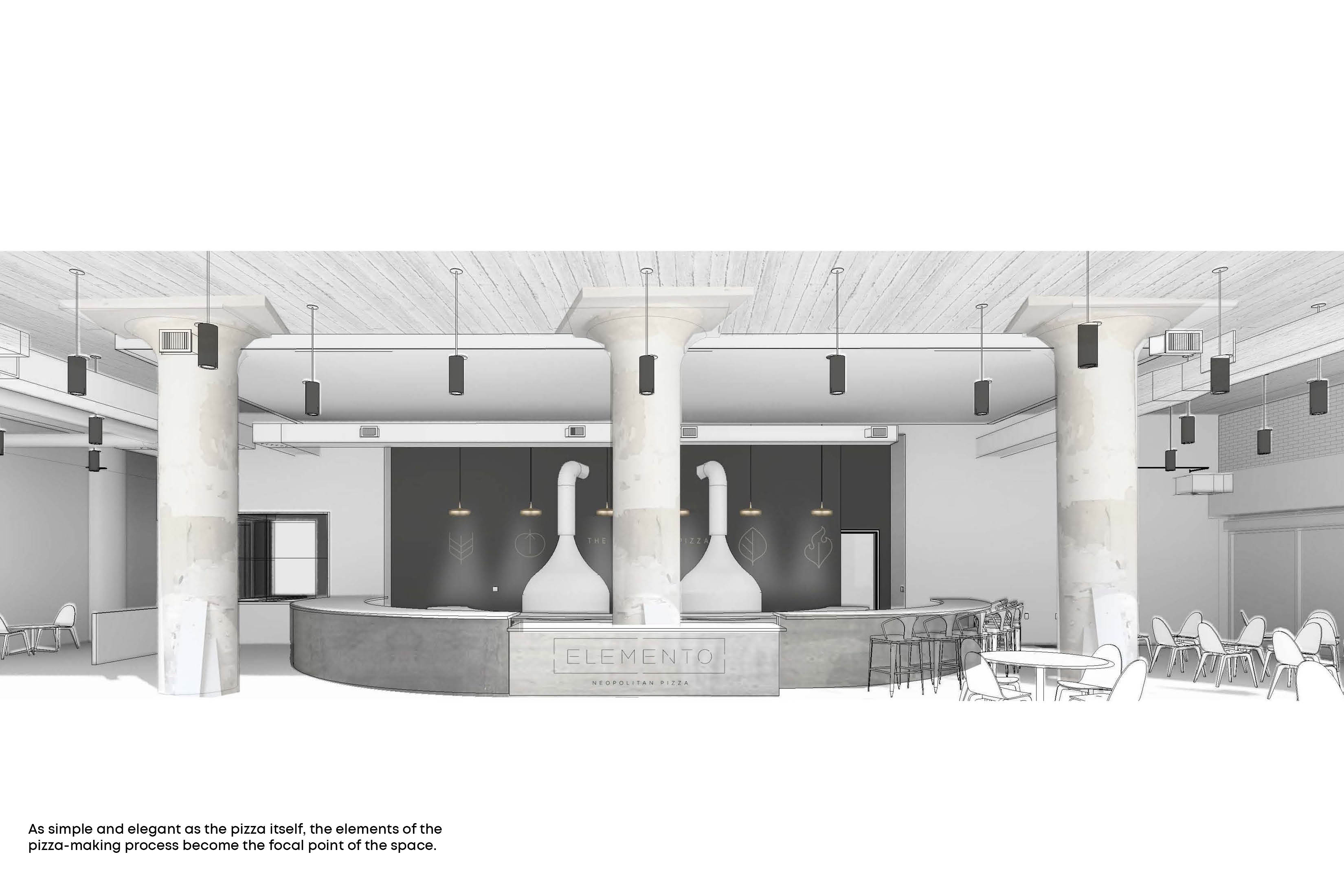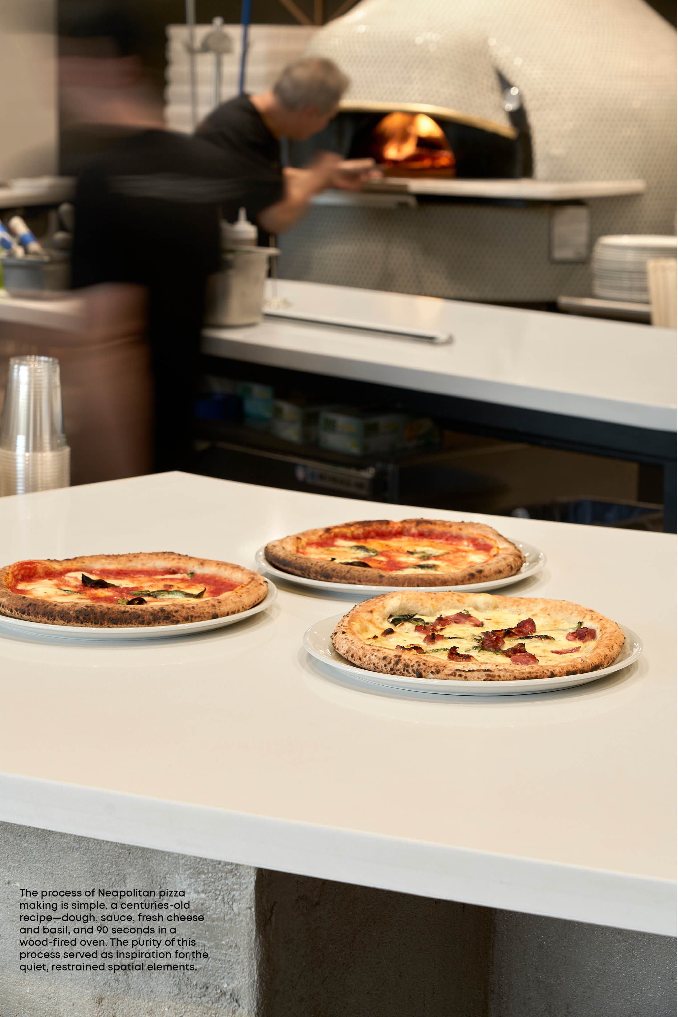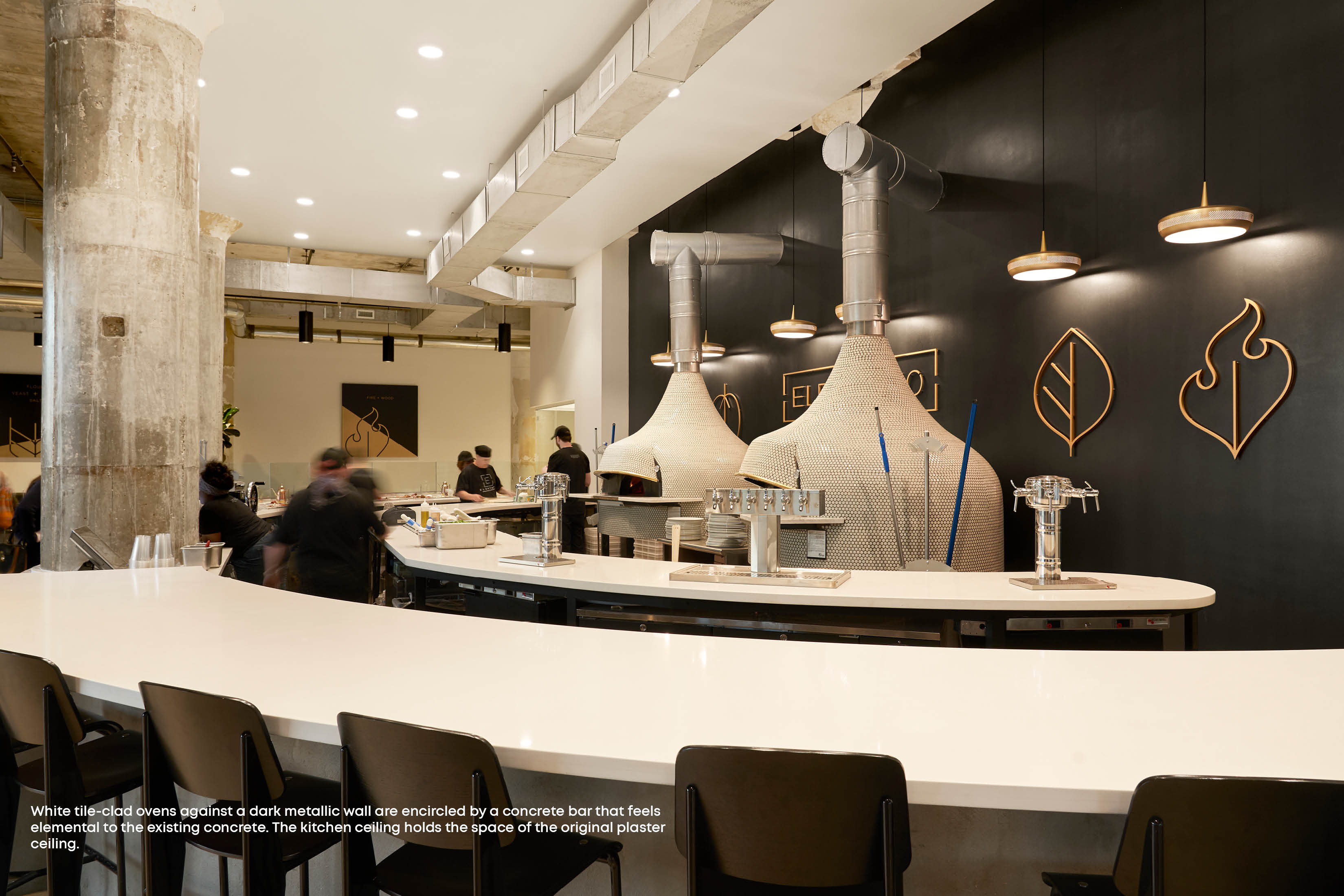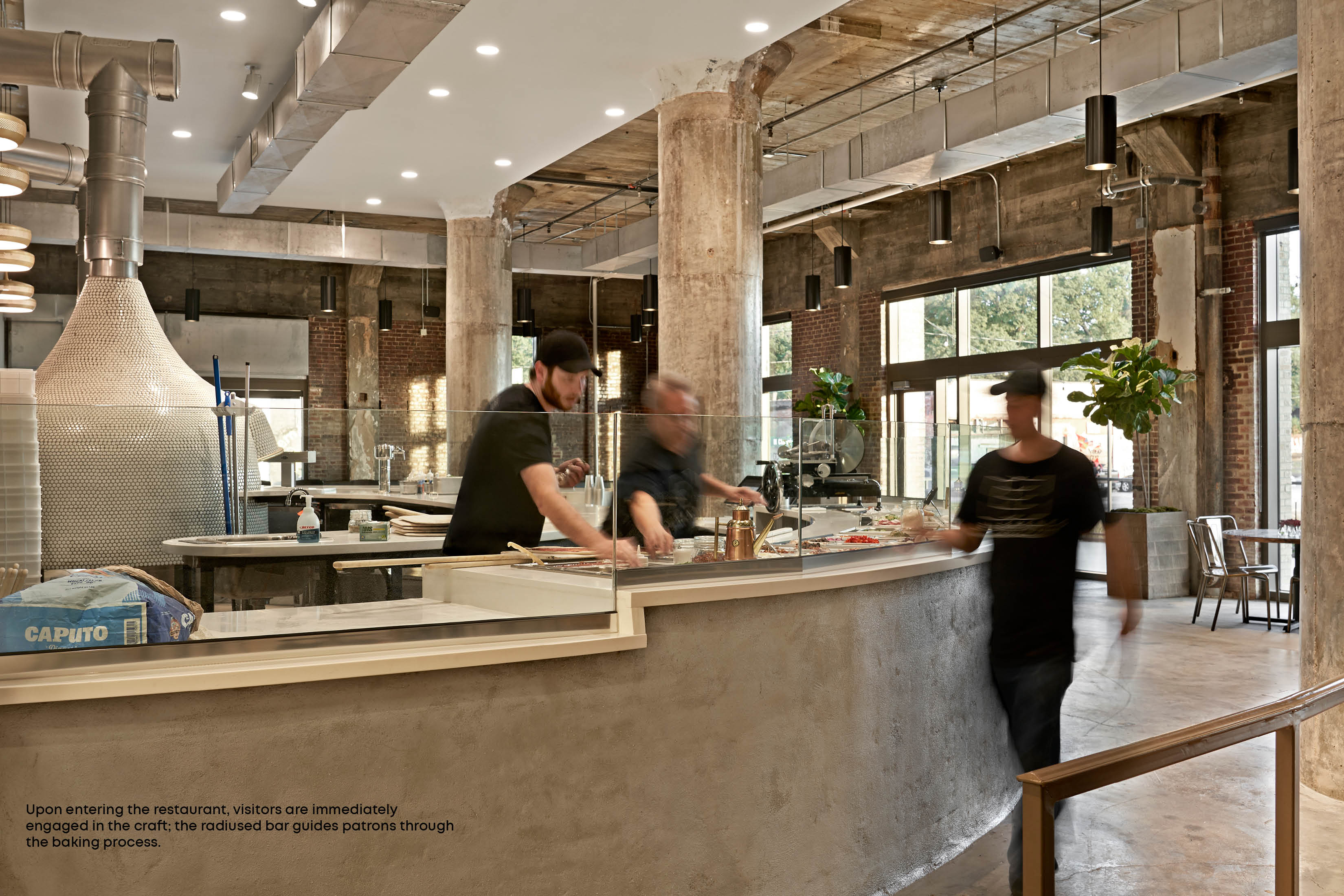The overall setting of the space remains raw: plaster wrapped concrete columns, exposed brick, board-formed concrete ceilings, and rugged concrete floors. Minimal design interventions bring warmth and purpose to the space and allow patrons to see the technique of making pizza from mixing dough to firing in the oven. Light and dark materials create a simple contrast in spatial elements; metallic accents highlight key components. Two imported tile-clad ovens anchor the space against a shimmering metallic charcoal wall. Encircling the ovens is a concrete bar that feels elemental to the existing concrete and highlights the process and techniques of pizza-making. These elements, while soft, bring the space to life and set the stage for artisan pizza.