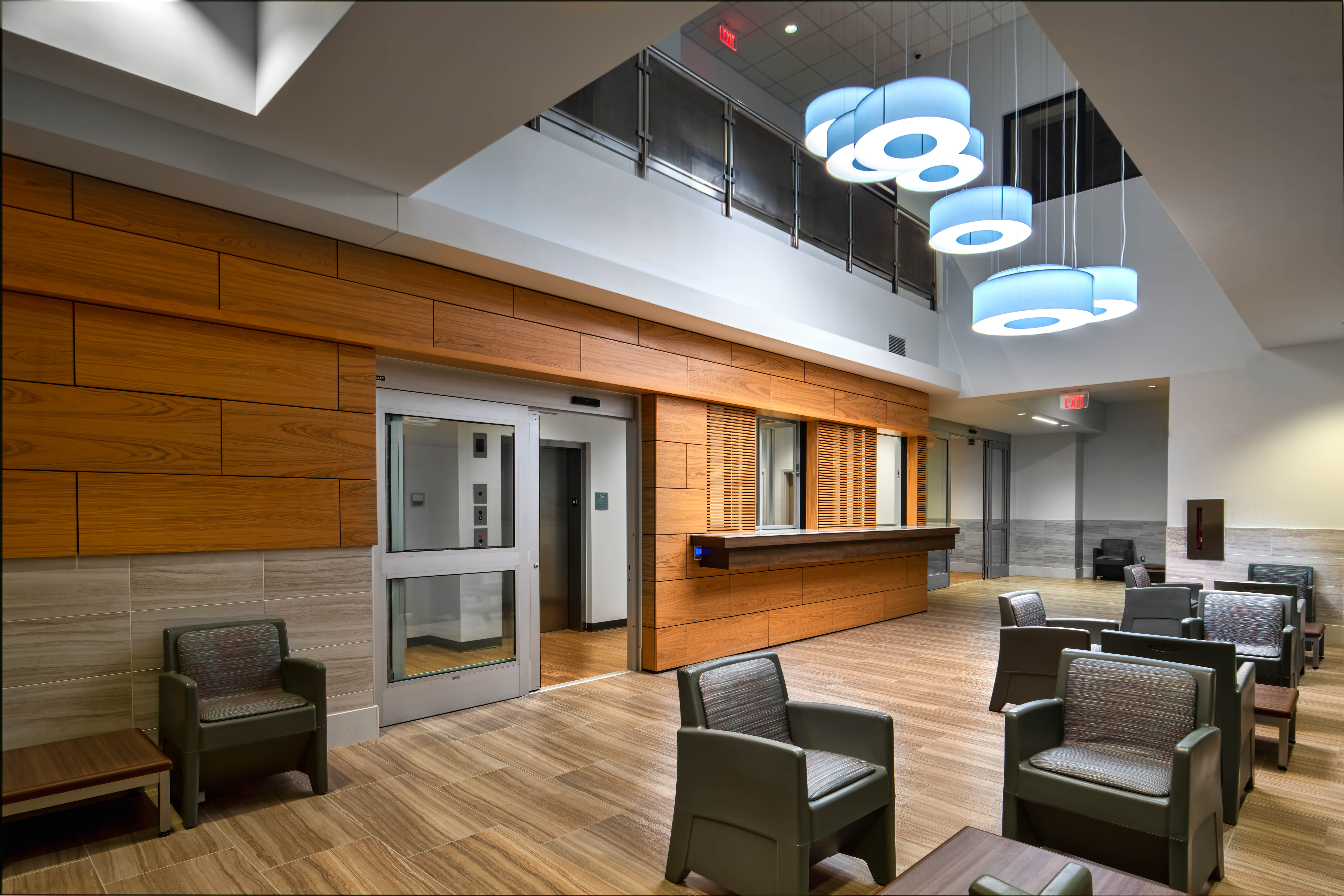 6. Vestibule & Check In at guest reception. The materials utilized in the color palette create a welcoming, soothing and inviting environment. The natural wood grain provides a spiritual connection with the guests and patrons. Wood symbolizes warmth, wisdom, knowledge and peace. The wood also evokes a feeling of renewal and symbolizes a bond between man and the divine. The two story space has large areas of glazing to provide light to the space. It also allows for the spirits of the guests to soar and feel open to a potential new life. It allows them to be ready to receive the change that they seek. This check in station also provides security for the staff while they perform the initial guest assessments. Photo by Steve Austell.