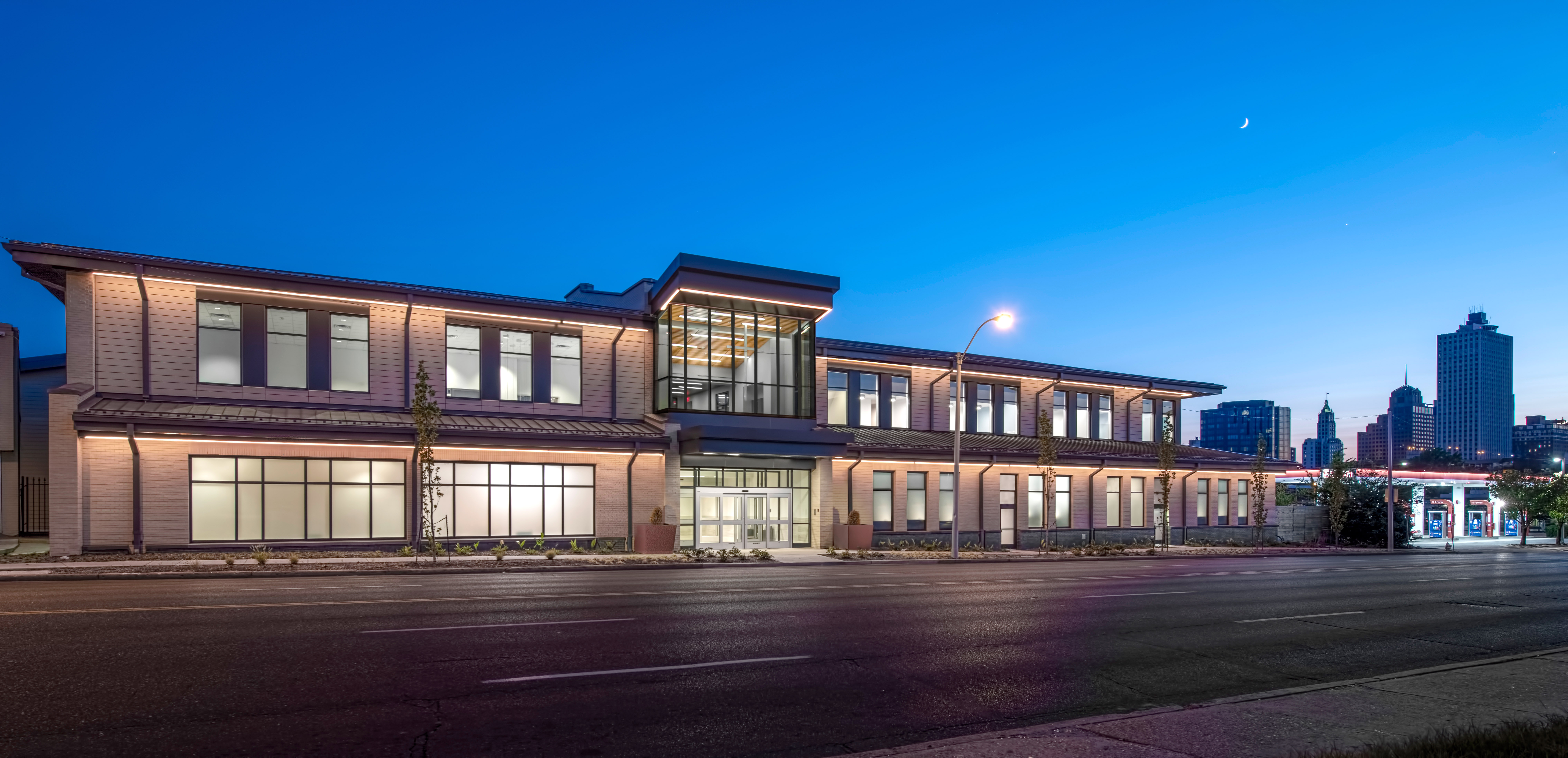 3. This is the view from the courtyard looking North. This eventually will be a fully landscaped courtyard in future phases to allow the guests to engage with nature while seeking help. This images shows off the openness of the facility’s windows at twilight against a beautiful Memphis sky. Photo by Steve Austell.