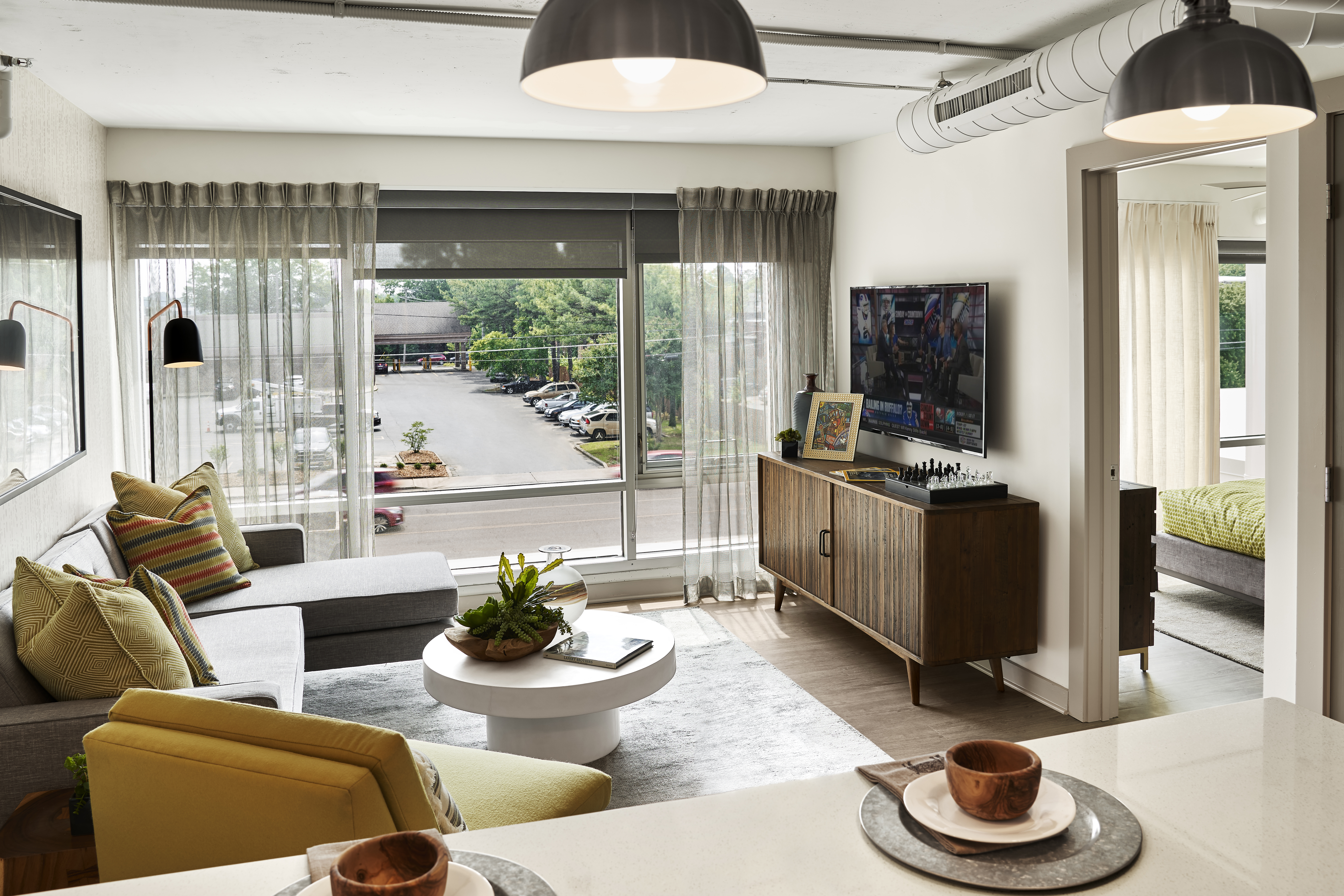 To meet the challenge of the existing building’s low floor to floor heights, the concrete structure was left open, exposed MEP systems were used to maintain vertical ceiling height, and new floor to ceiling windows were utilized to offset the low clearance and create a sense of expansive views from the residences.