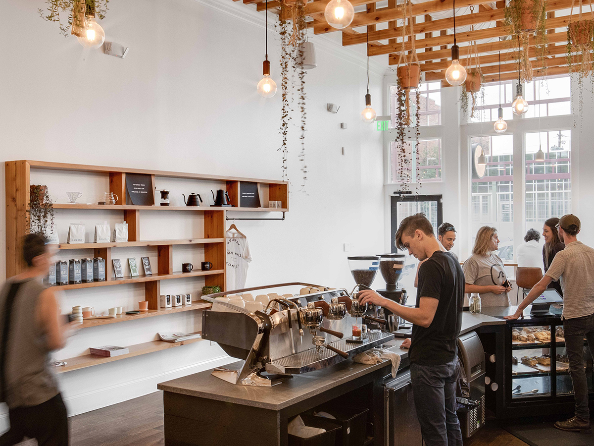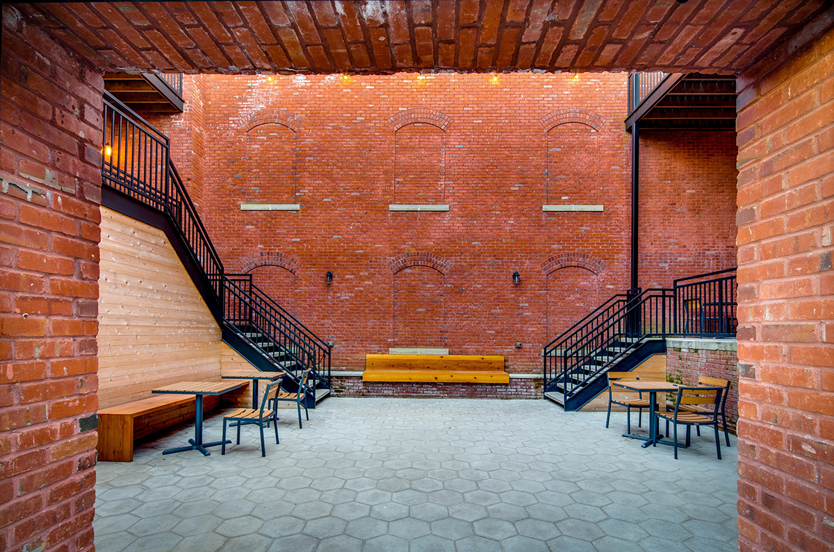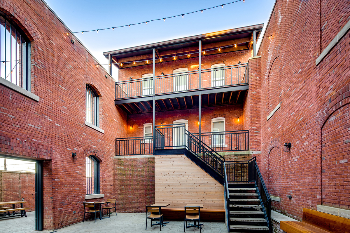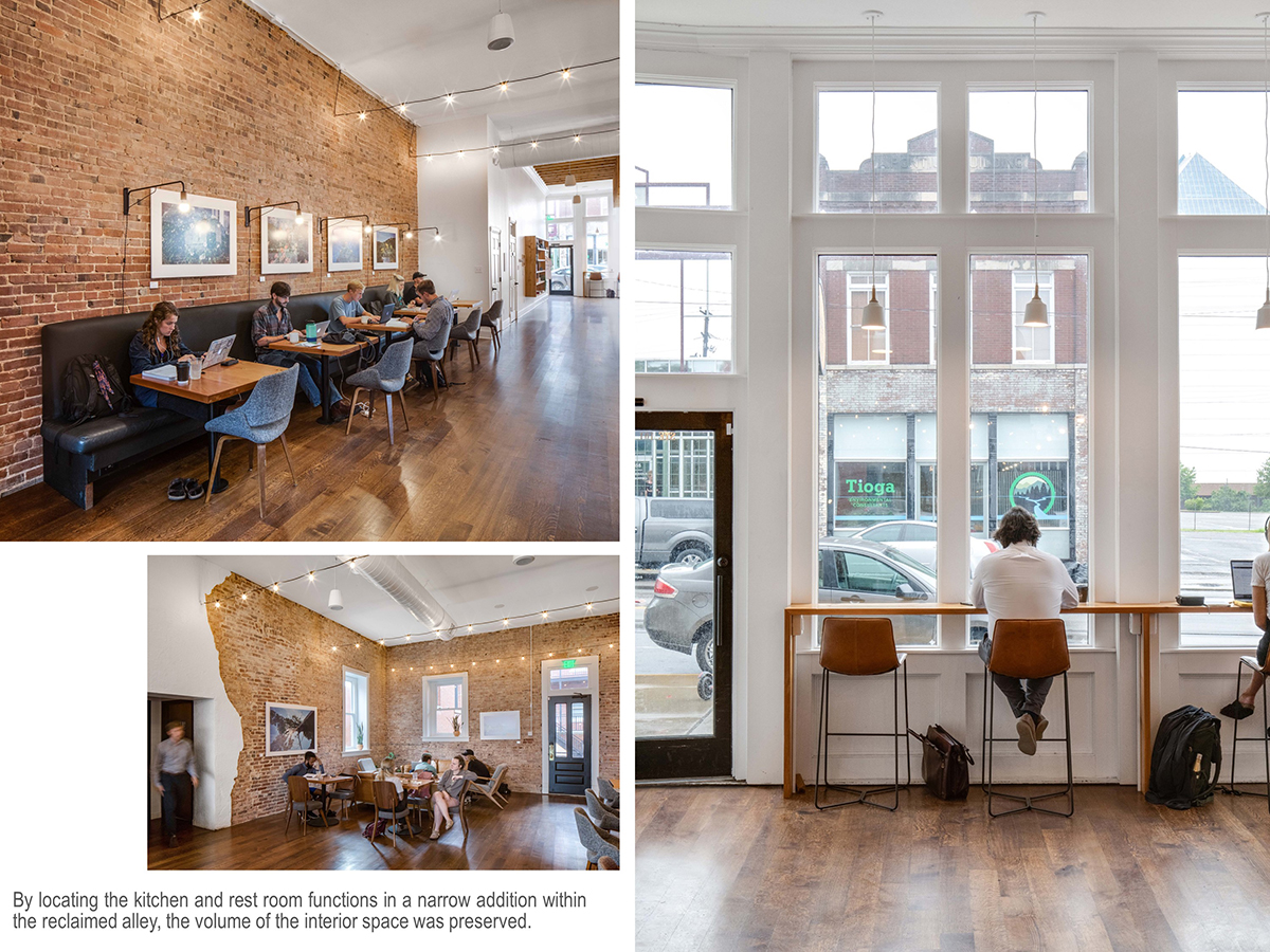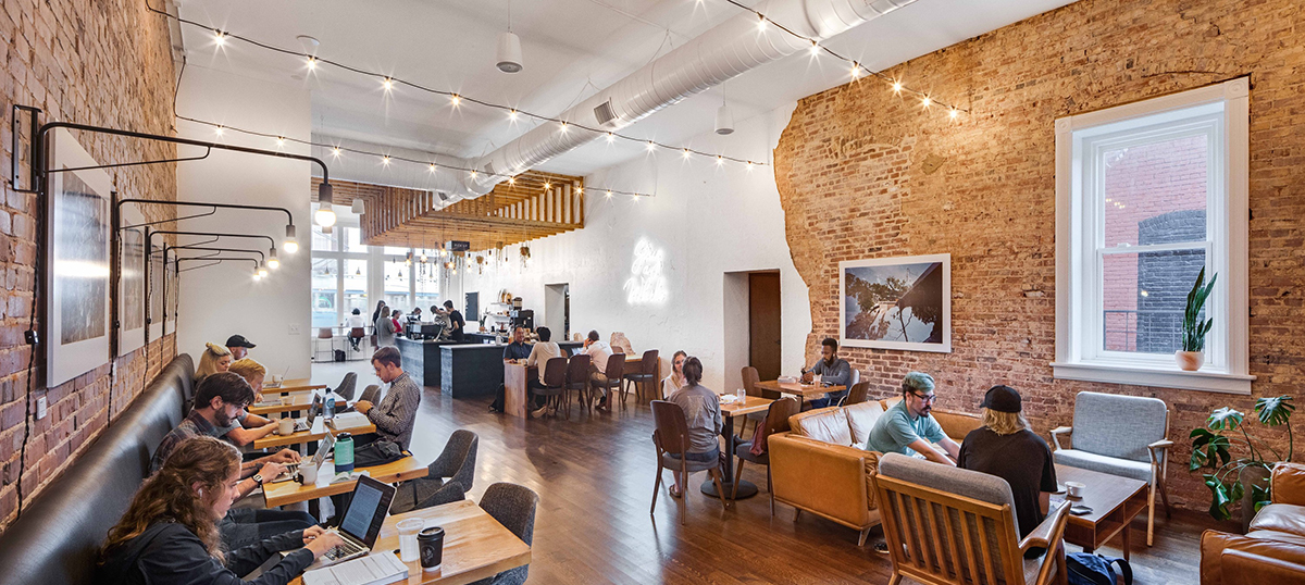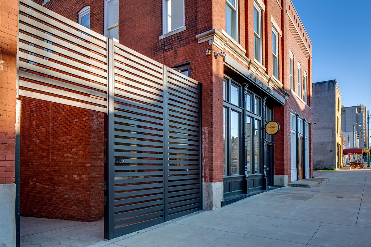 The art of craft brewed coffee inspired this careful renovation and addition to a historic brick structure in the Pinch District in Downtown Memphis. Material choices and color palette were chosen in an effort to create a warm, welcoming environment and to inspire customers to relax and stay awhile. A simple canopy constructed of framing lumber creates a lattice-like ceiling element floating above the shou sugi ban wood-clad service counter. Soft lighting and exposed existing brick and eroding plaster work remind of the historic nature of the building and neighborhood. Additions include the reclamation of an adjacent alley space for outdoor seating and courtyard as well as the addition of kitchen and rest rooms to the main level program.