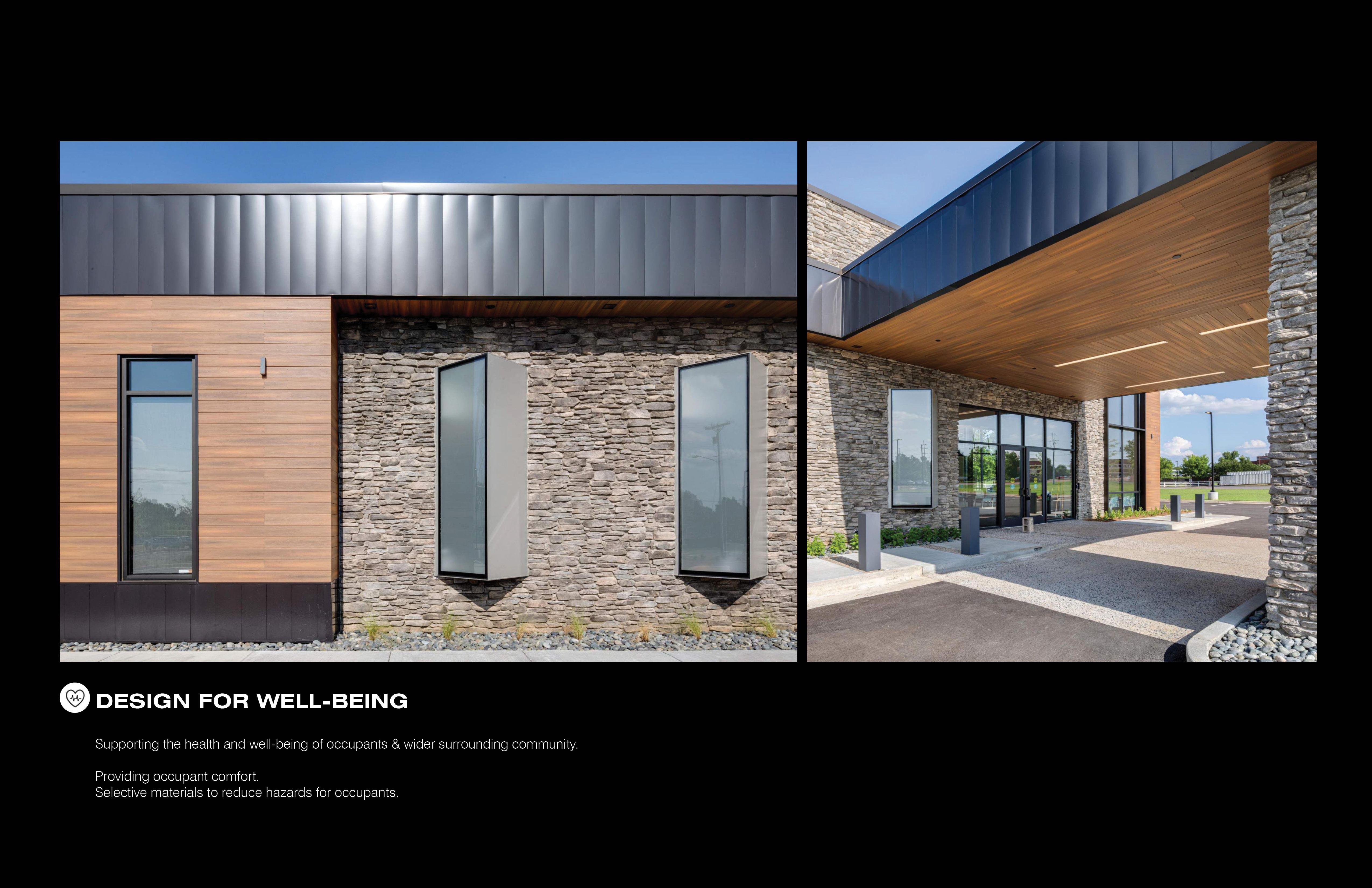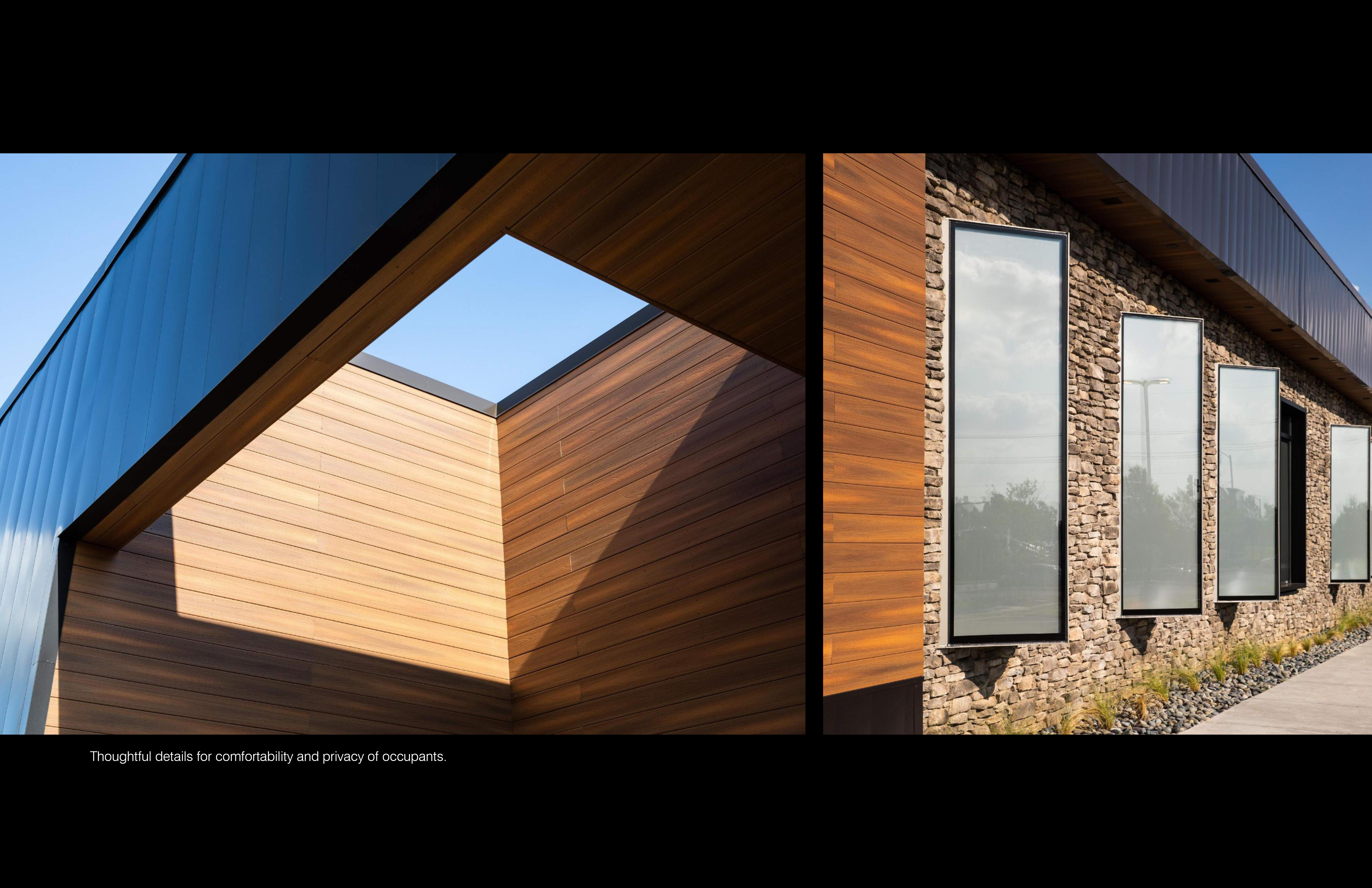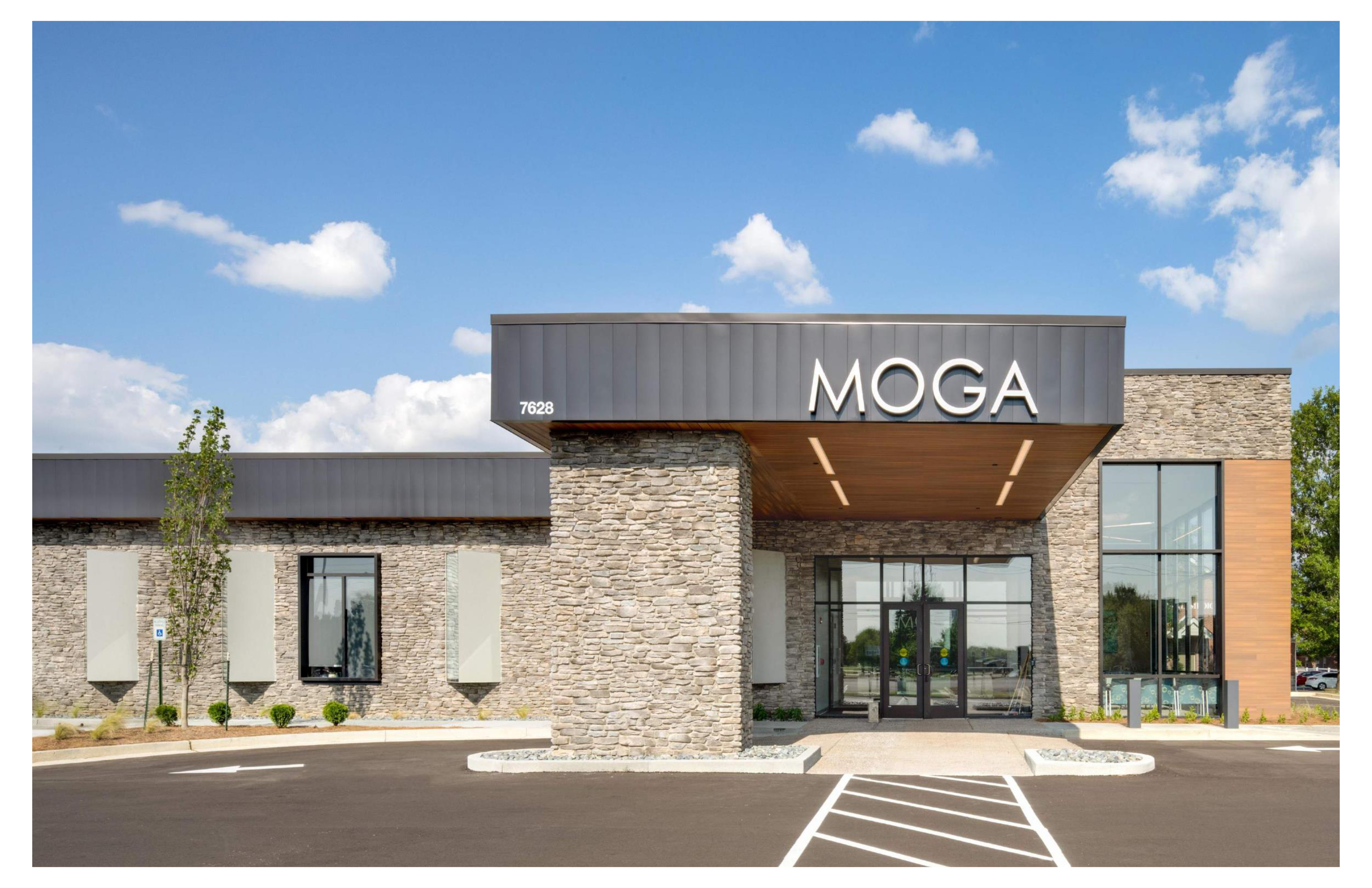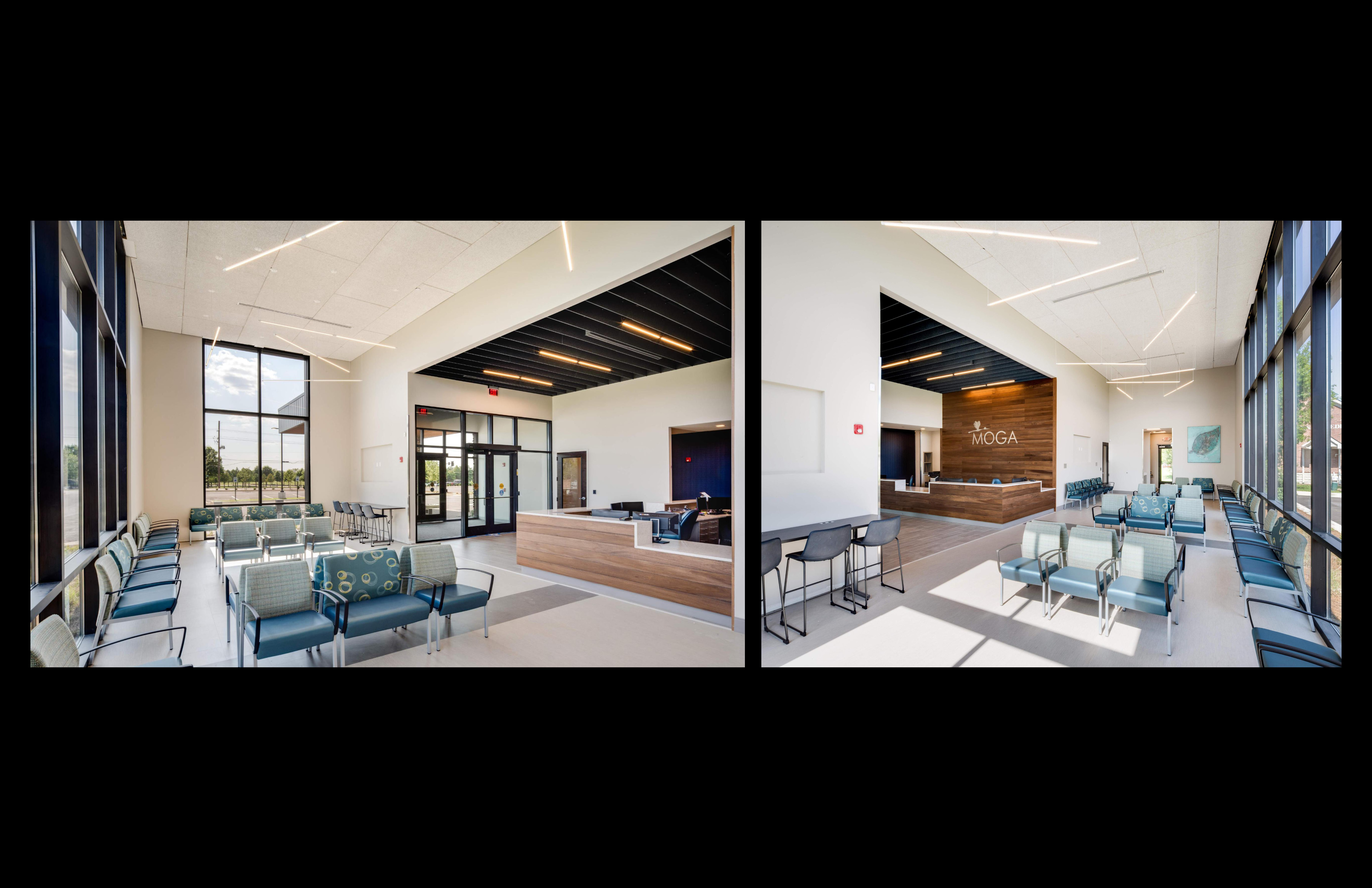 The building stands out due to the contemporary design aesthetic. This is an evolving design discovery with the MOGA brand. Natural tone finishes were chosen to target the patients’ wellbeing with a warm, welcoming environment. To design for energy and reduce the need for harsh artificial lighting, each exam room is equipped with a custom window box protruding from the facade. These windows are intentionally angled north to achieve daylight without compromising patient privacy.