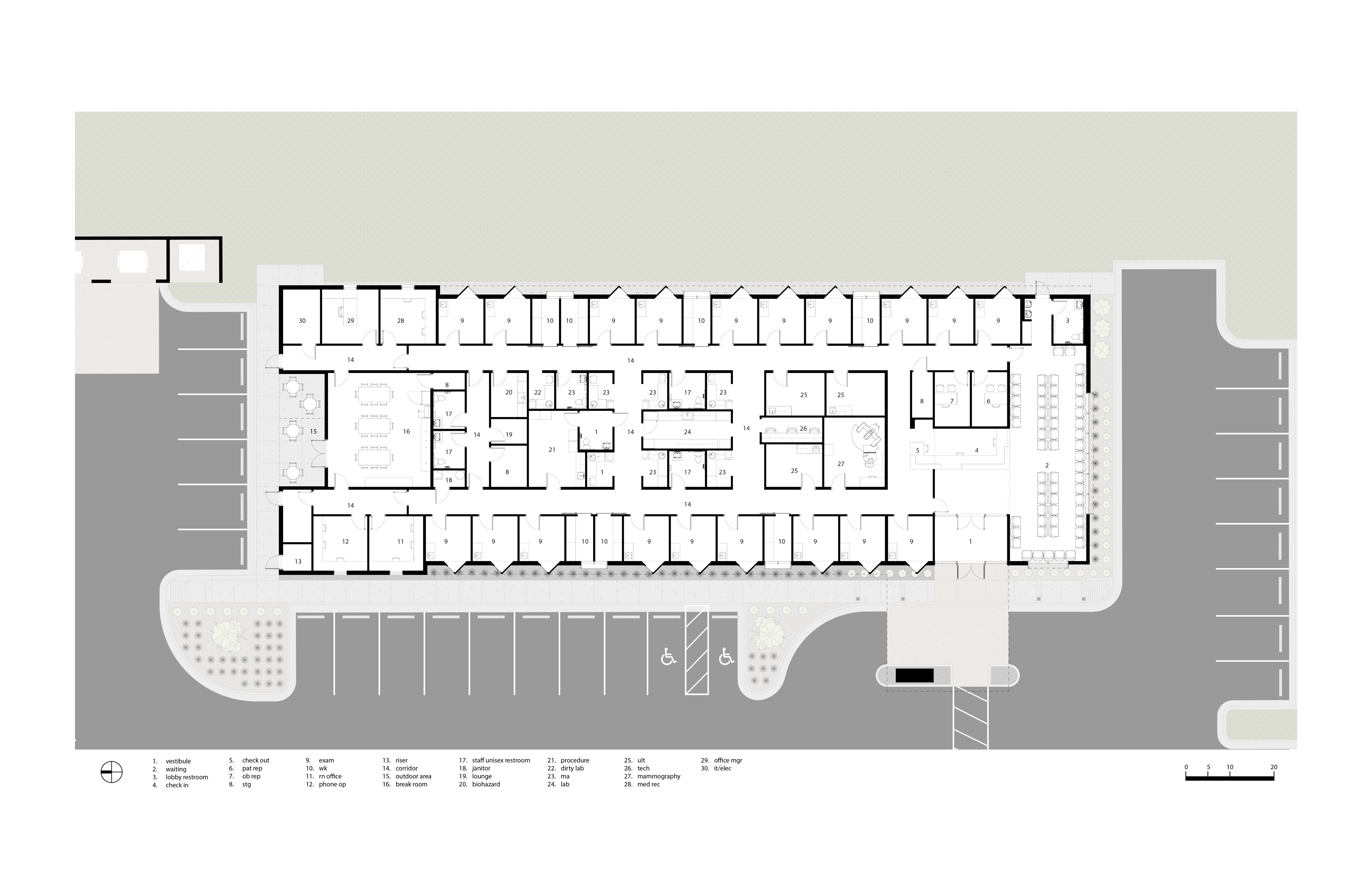 2 - While the form of the building is rather typical in its rectangular shape, the need to allow for natural light, while also preserving privacy, created the challenging opportunity. By pushing the most private spaces towards the public exterior wall, the plan established an intermediary space through the center of the building. This strategy zoned staff towards the west and welcomed patients on the east while servicing both at the central intersection. Diagram by UrbanARCH.