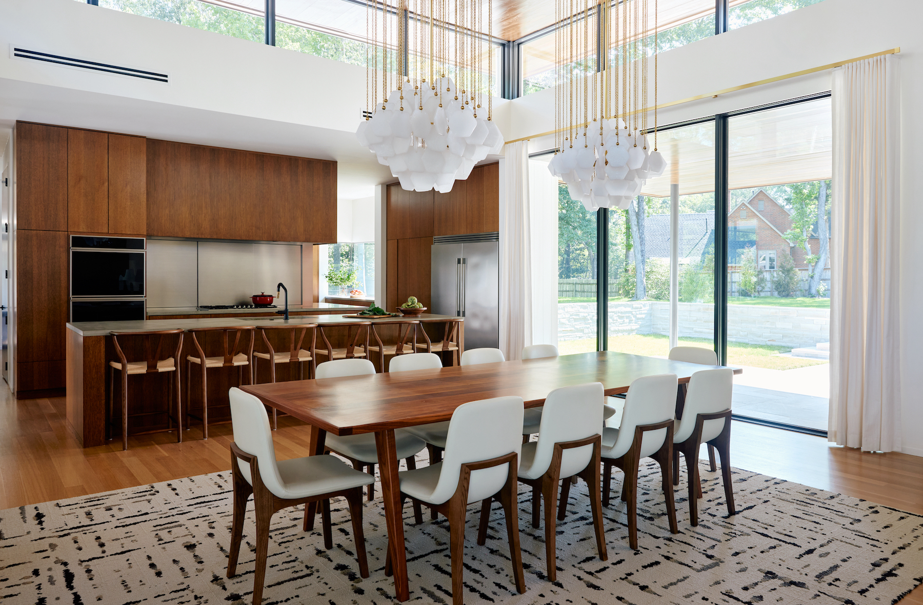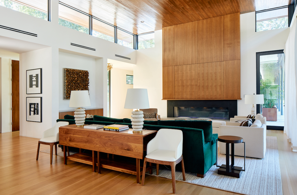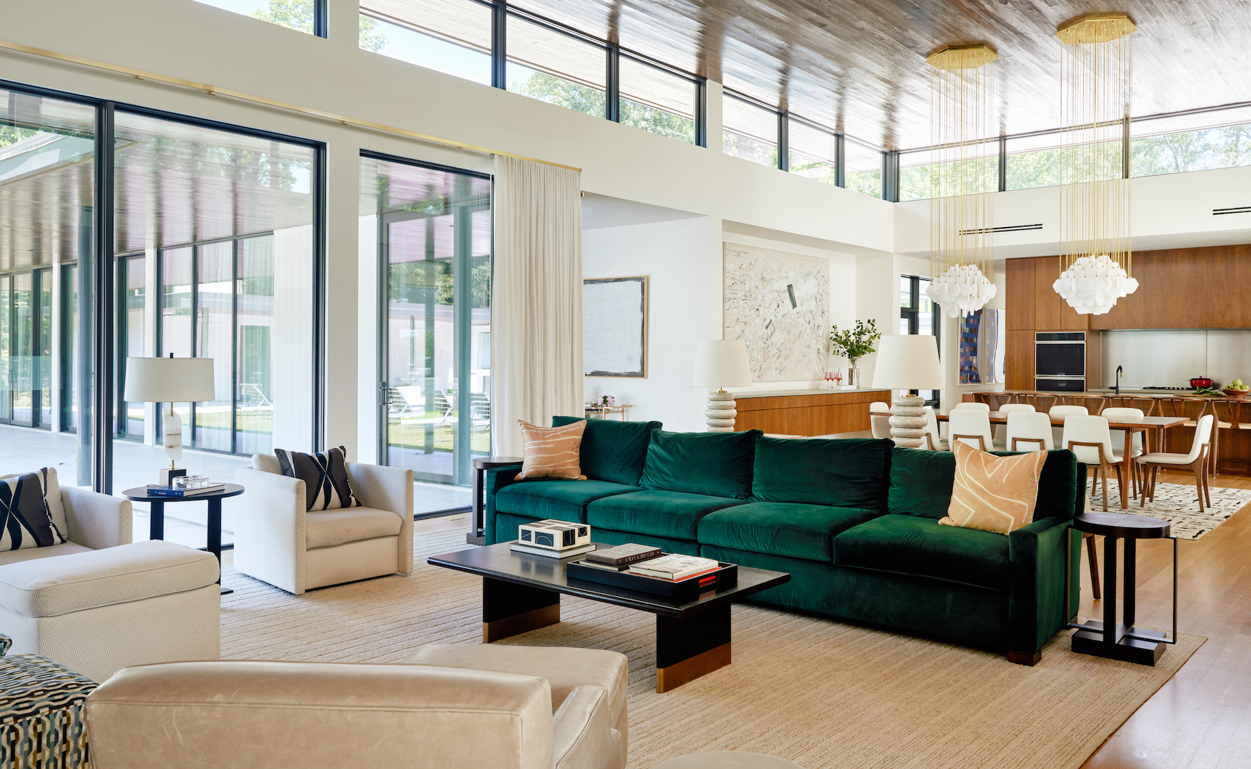 The entry opens into the family room with views through the space and out to the pool and courtyard. The main pavilion is defined by the clerestory windows and contains the family room, dining area, and kitchen to entertain friends and family. The kitchen is located to be visually connected with all areas of the plan. Both primary bedroom suites and guest bedrooms extend beyond the main pavilion to enclose the courtyard. All interior spaces communicate visually with the courtyard.