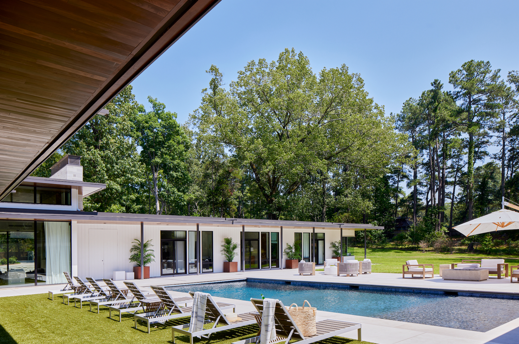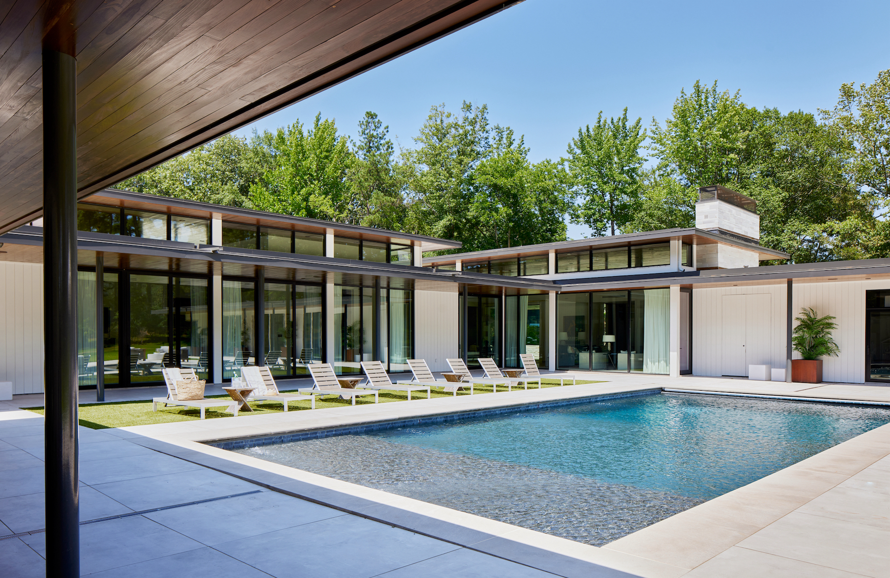 The project takes a low, horizontal profile with separate pavilions arranged around a courtyard with a swimming pool.