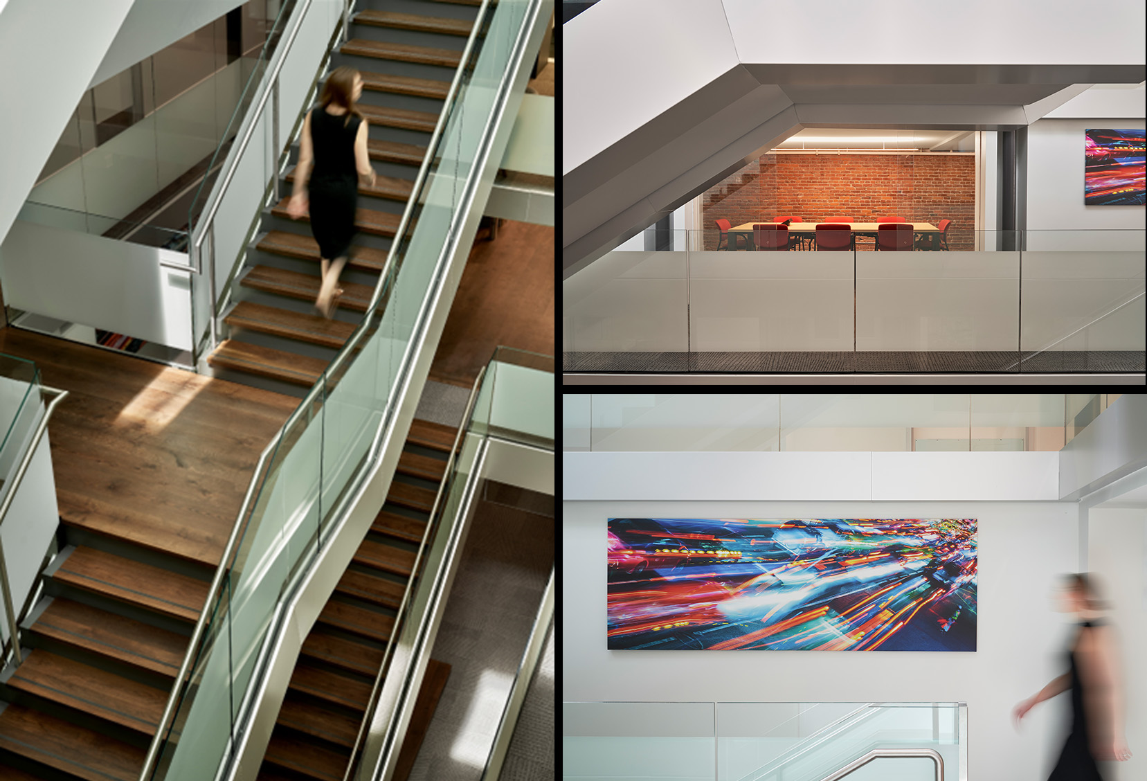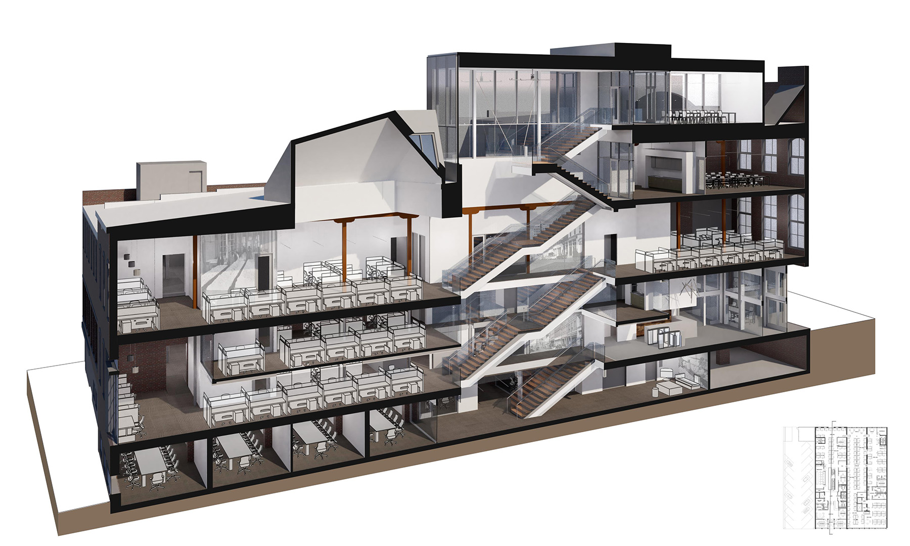 4- A new monumental stair provides convenient passage from the basement to the top floor, adding to the vibrancy and connectivity of the space. Rendering by firm.