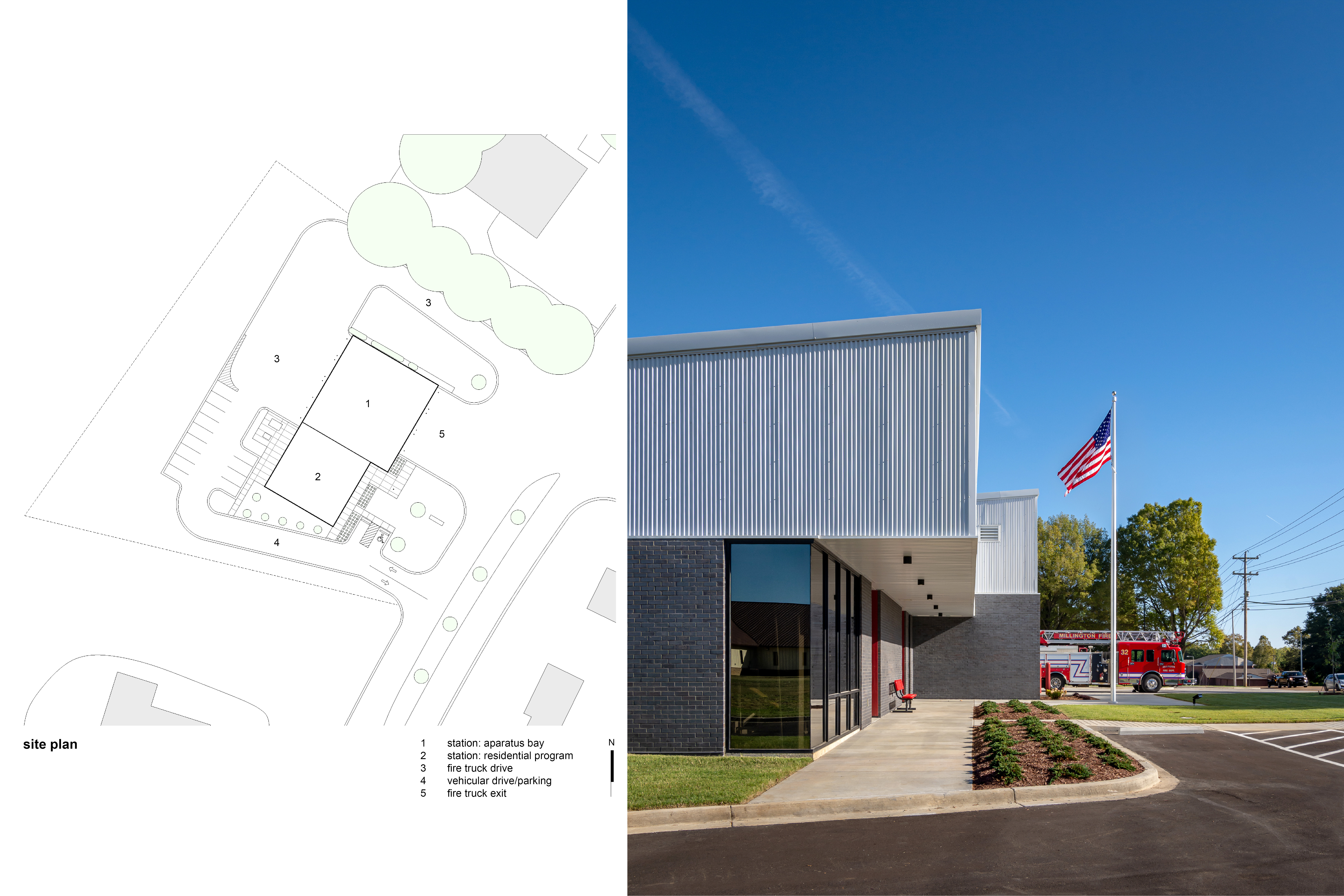 With a small budget and large aspirations, the MFD intended to build the first new station in over 40 years. After decades of occupying a tiny single-bay station on a small site, the department capitalized on the opportunity to create a facility that was representative of the highly skilled men and women serving as firefighters. The chief sought to honor the work of his crews by creating a station that boosted morale while making life easier on the firefighters through improved efficiency and maneuverability. With these goals in hand, a simple diagram was developed of two adjacent volumes with direct connection between the them. A smaller volume housed residential program while a large volume contained equipment. Clear and direct circulation tied the two together, allowing firefighters the quickest route to their equipment. Positioning the building at the center of the site allowed for two distinct drive lanes: one for typical vehicles and a second for the larger, heavier fire trucks. Generous space at the rear of the site allows trucks to turn 180 degrees into the building and pass-through for quick exiting.