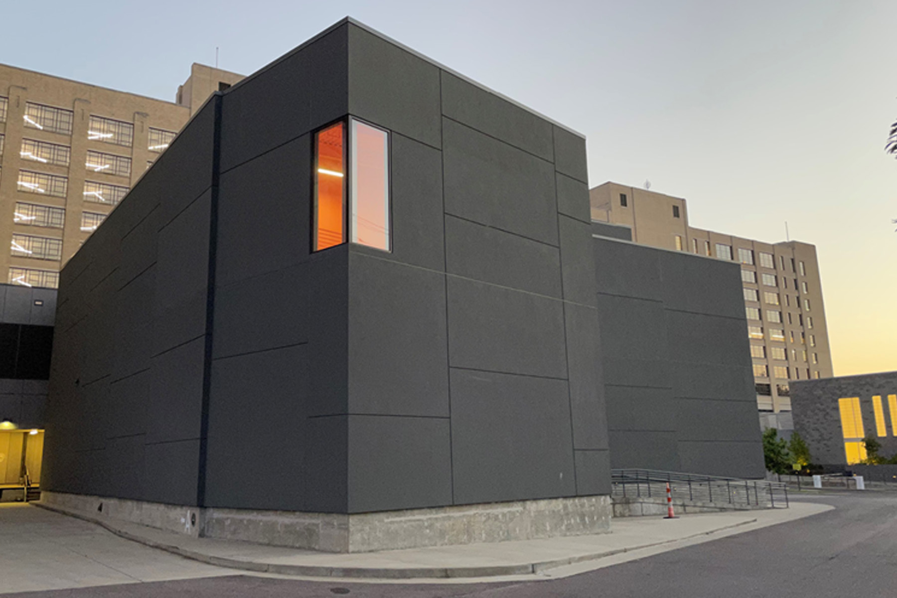 Designed from the inside out, the theater’s interior spaces push the envelope, giving shape to the building’s exterior. The boxy, dark gray exterior is emblematic of the black-box theater. The rake of the seating line inscribed on the west exterior extends beyond the building mass to a cantilevered control room providing shelter over the building’s entrance. Opposite the public face, performers easily access the theater for direct load-in/load-out access along the original rail line path that connected to the powerplant.