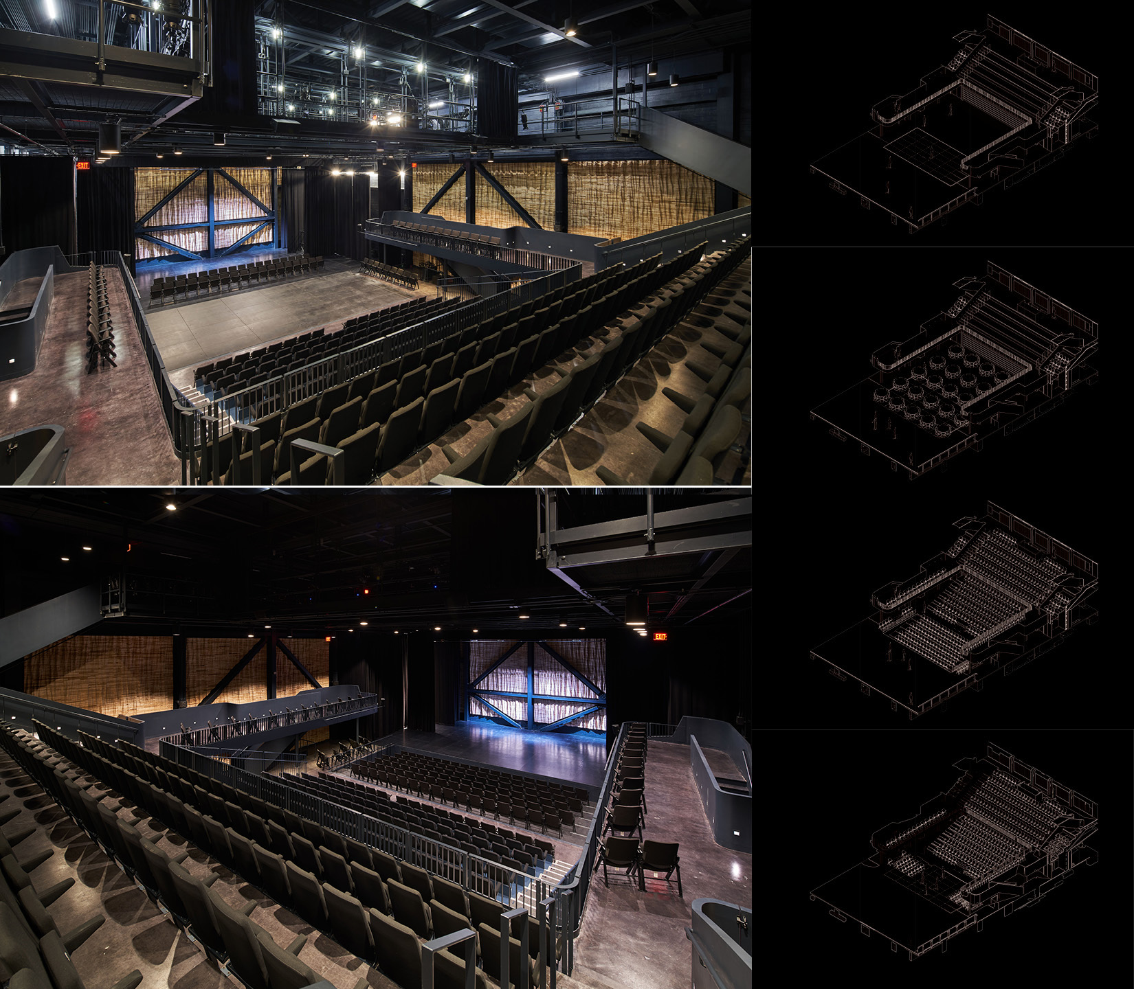 4 – (photos) Ken West, (drawings) Firm. The clients desired a theater that was fully versatile and able to be rearranged for any type of performance, activity, or event. Carefully designed and created by a local artist, the wooden wall panels serve both the acoustics and the aesthetics.