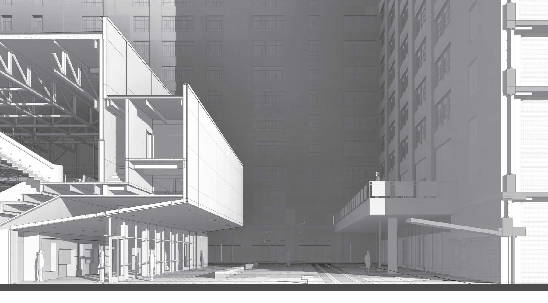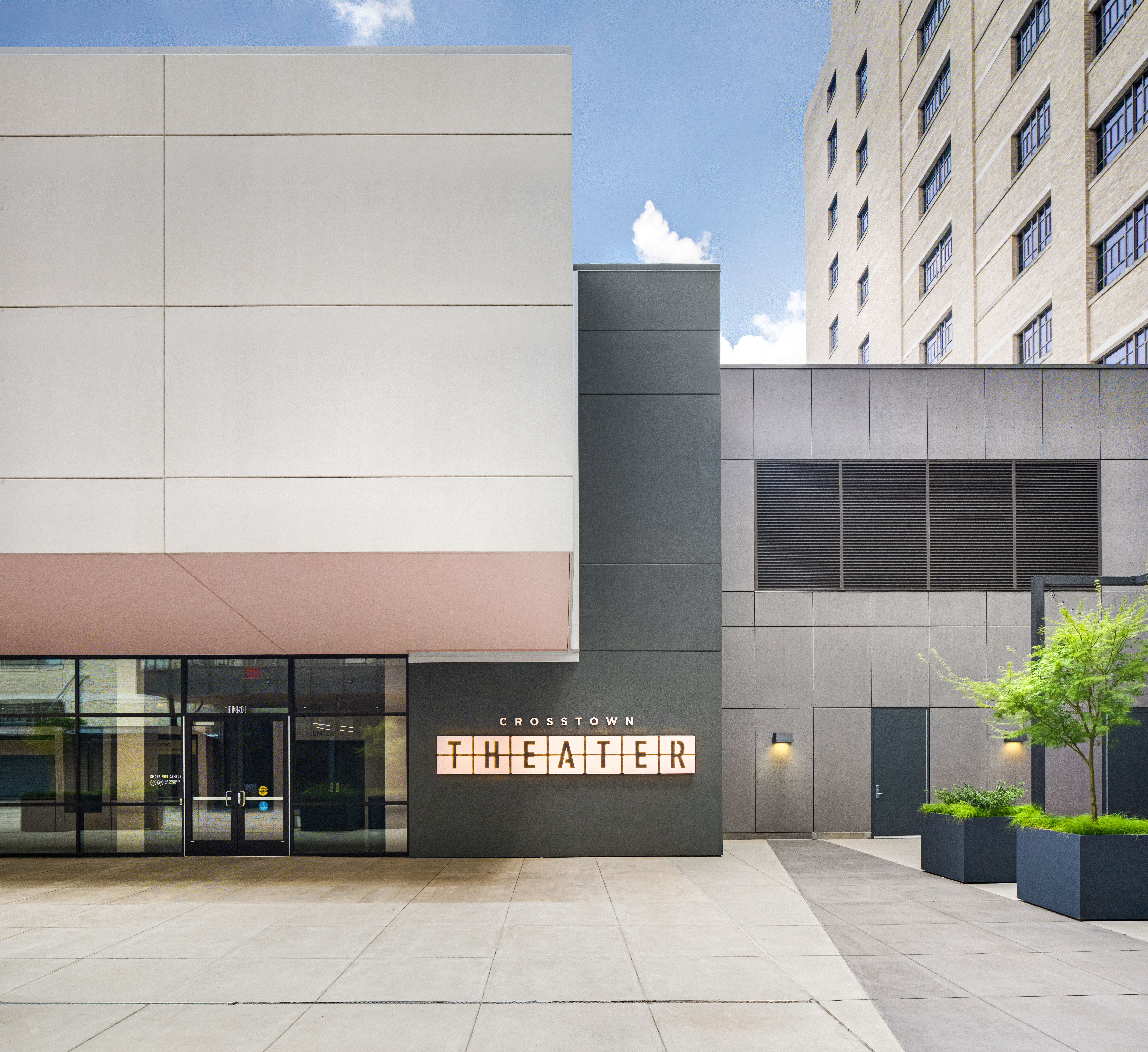 3 – Firm. The theater sits adjacent to a large back porch balcony and in-line with the main entrance to Crosstown Concourse. Not only are vital theater functions housed in the building protrusion, the large blank façade serves as a projection screen for the balcony across the plaza.