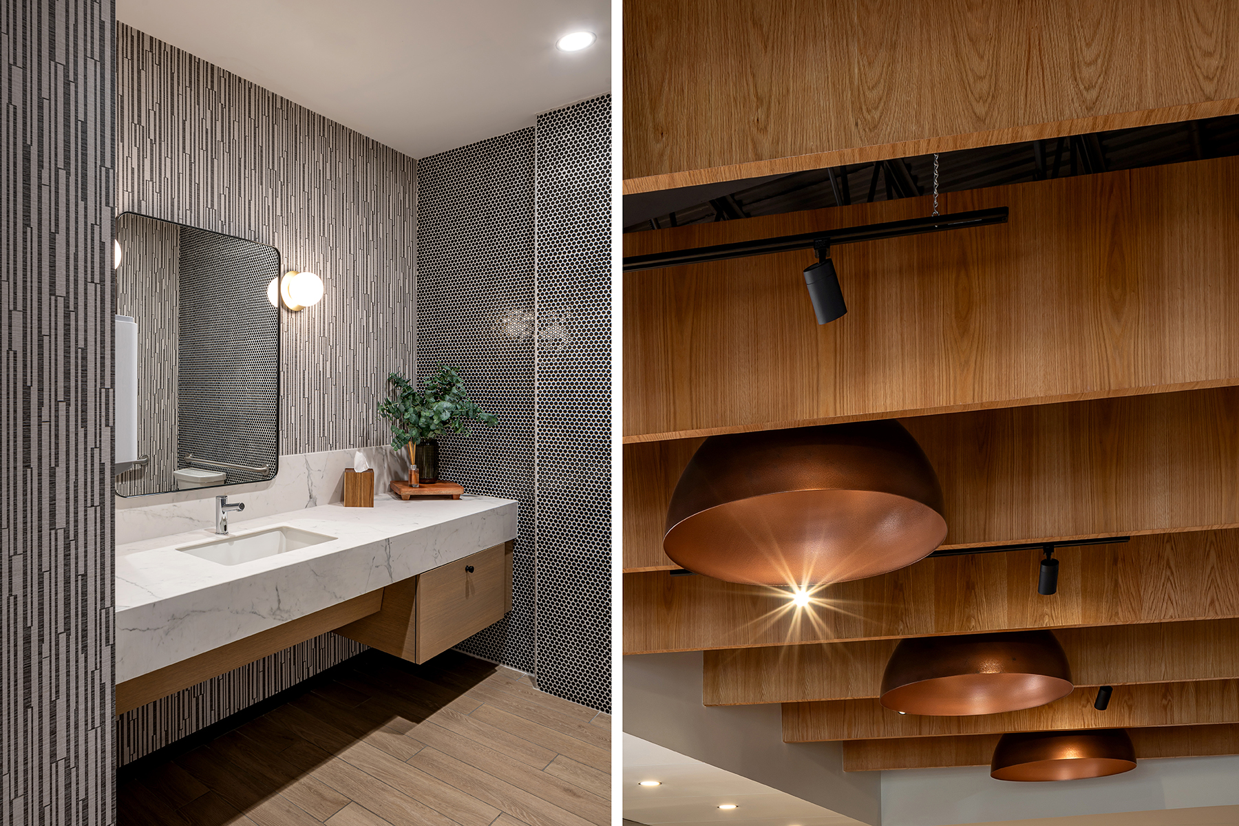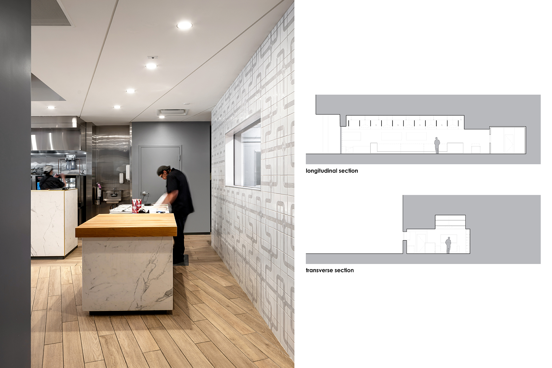 Materials were selected relative to their ability to add richness and warmth, and contribute to a ”quietness” of space. White oak wood baffles at the ceiling coupled with oversized copper drums create a elegant rhythm and set the tone for the space. Large-format porcelain panels with marble veining clad the walls and portions of the counter, offering a natural contrast to the stainless steel equipment. Wood-toned porcelain floor tile coupled with white oak millwork serve to further balance the palette and reinforce the overall atmosphere.
