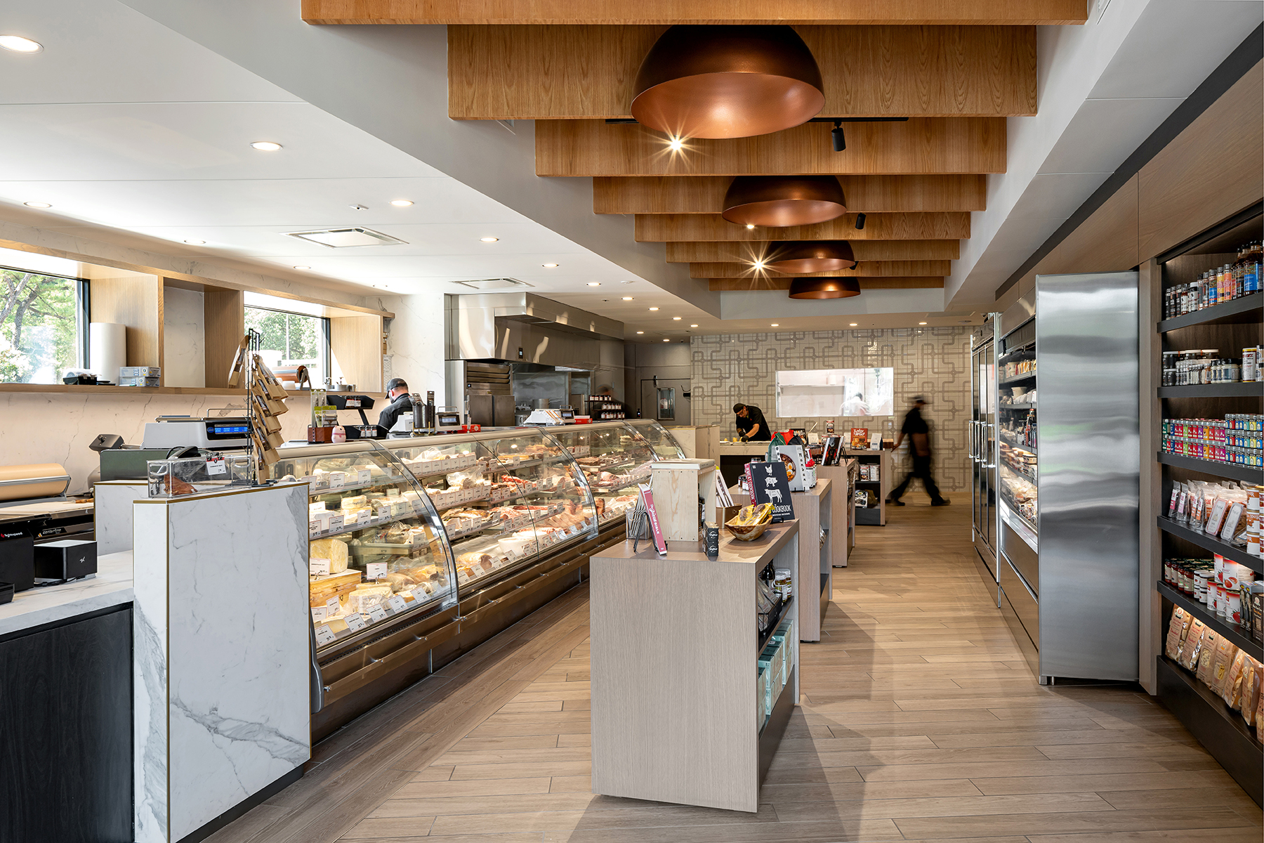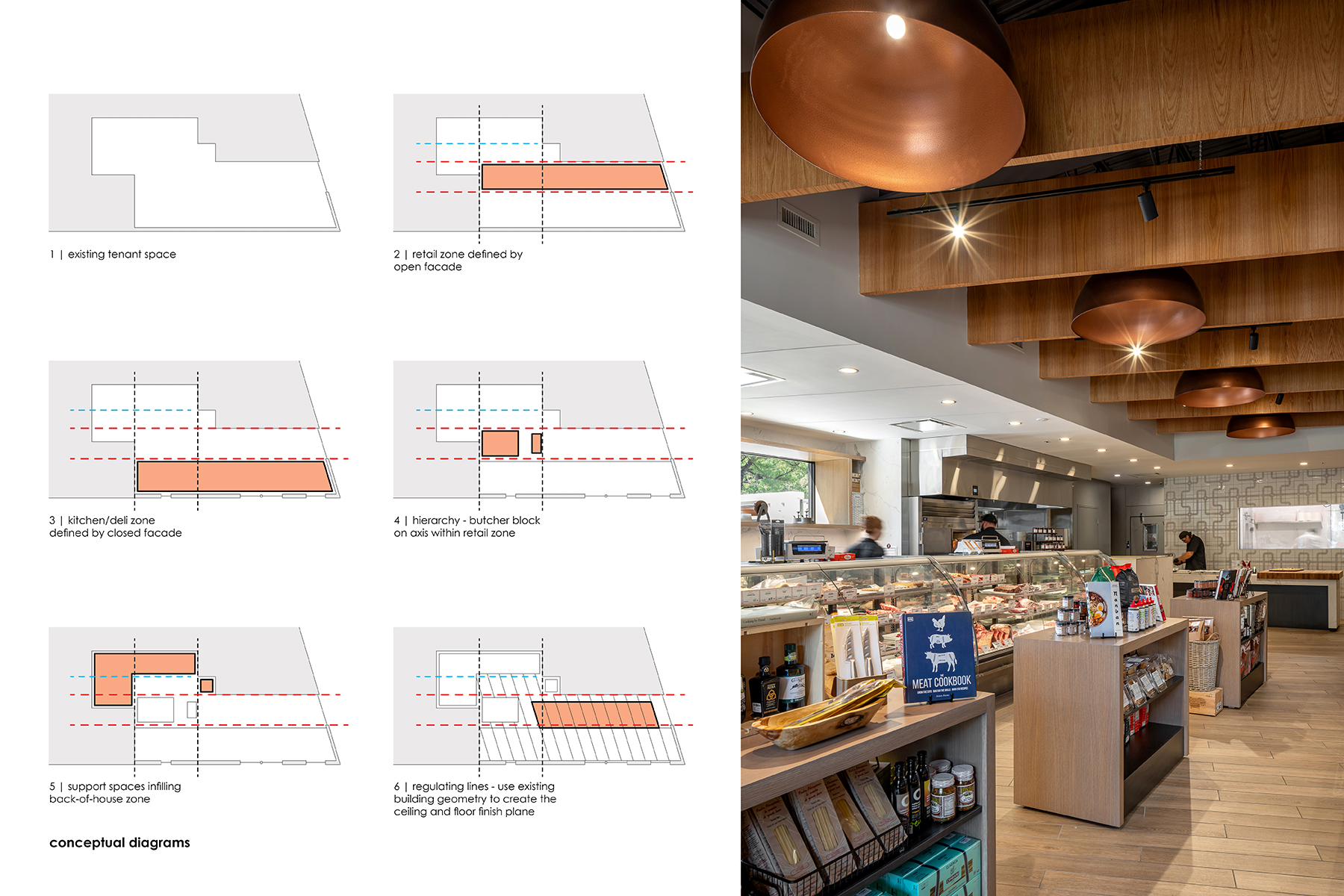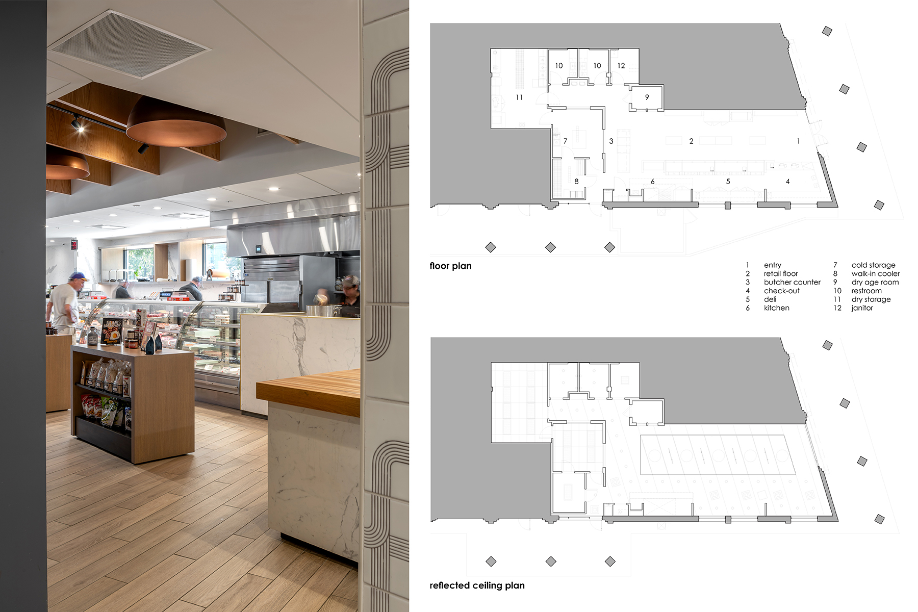 6 - The butcher's table is centered on axis within the retail zone, prominently placing the art of preparing meats on full display. Simple changes in ceiling plane reinforce programmatic uses while accommodating differing demands for lighting.