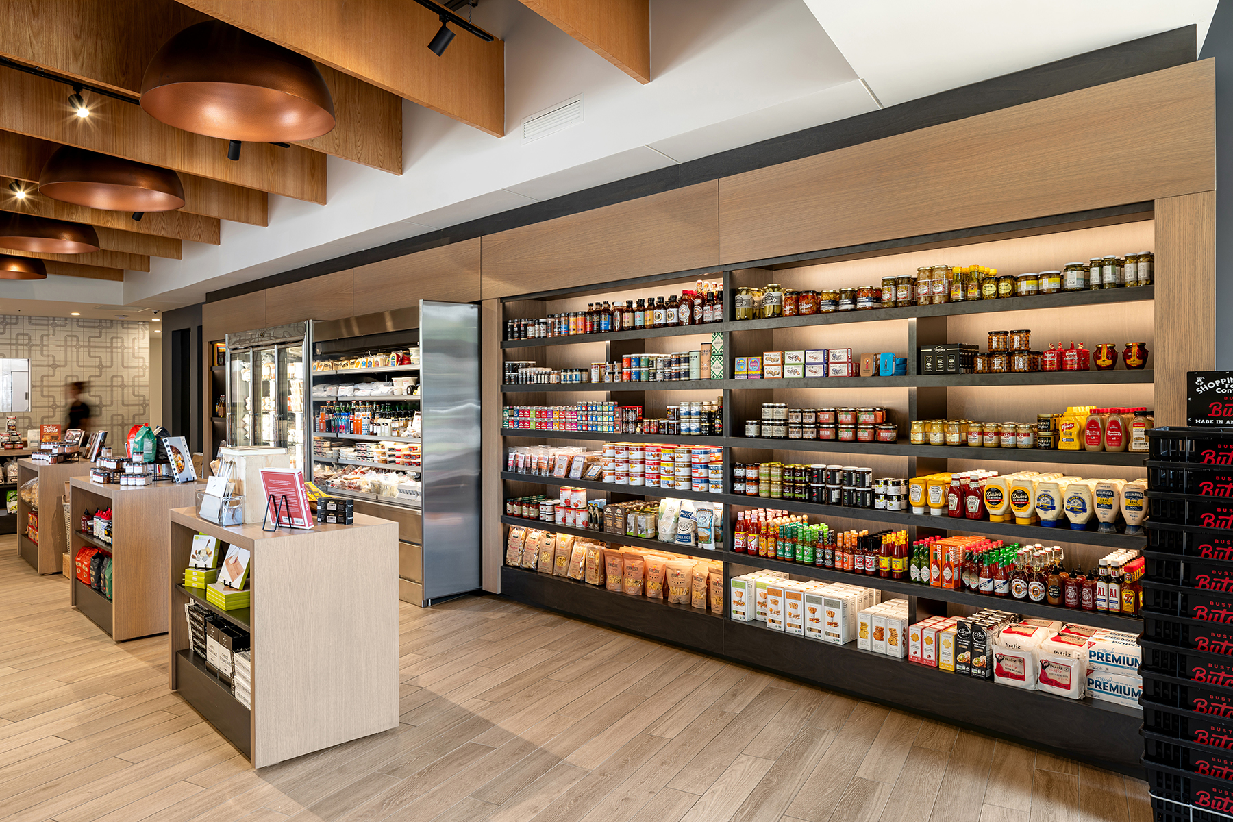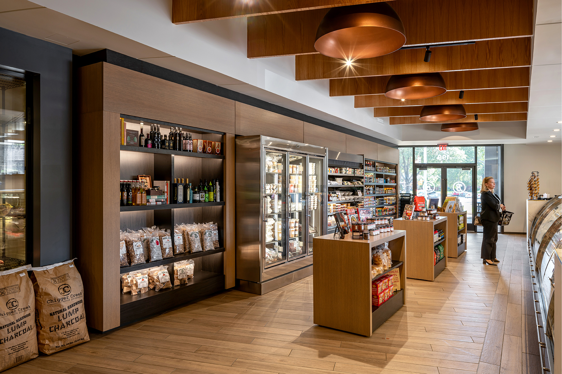 Occupying the end bay of a retail center, Buster’s Butcher was afforded two exterior walls capable of admitting natural light and deliveries. At only 2,300 sf, a plan diagram was developed of maximum efficiency where the craft of butchery was on full display. The linear tenant space was subdivided into a retail floor and kitchen/counter. On axis with the entry and serving as the terminus of the retail space is the butcher counter backed by the glazed cold room, offering patrons a first-hand view of the process and products available for purchase. The linear nature of the retail space is reinforced through a taller space and ceiling of wood baffles aligning with the unusual geometry of the retail bay and accented with oversize copper drum fixtures. A lower ceiling drops above the kitchen/counter reinforcing the hierarchy of space and creating a smooth surface from which lighting may reflect. New windows were cut into the exterior wall and flood the space with natural light.